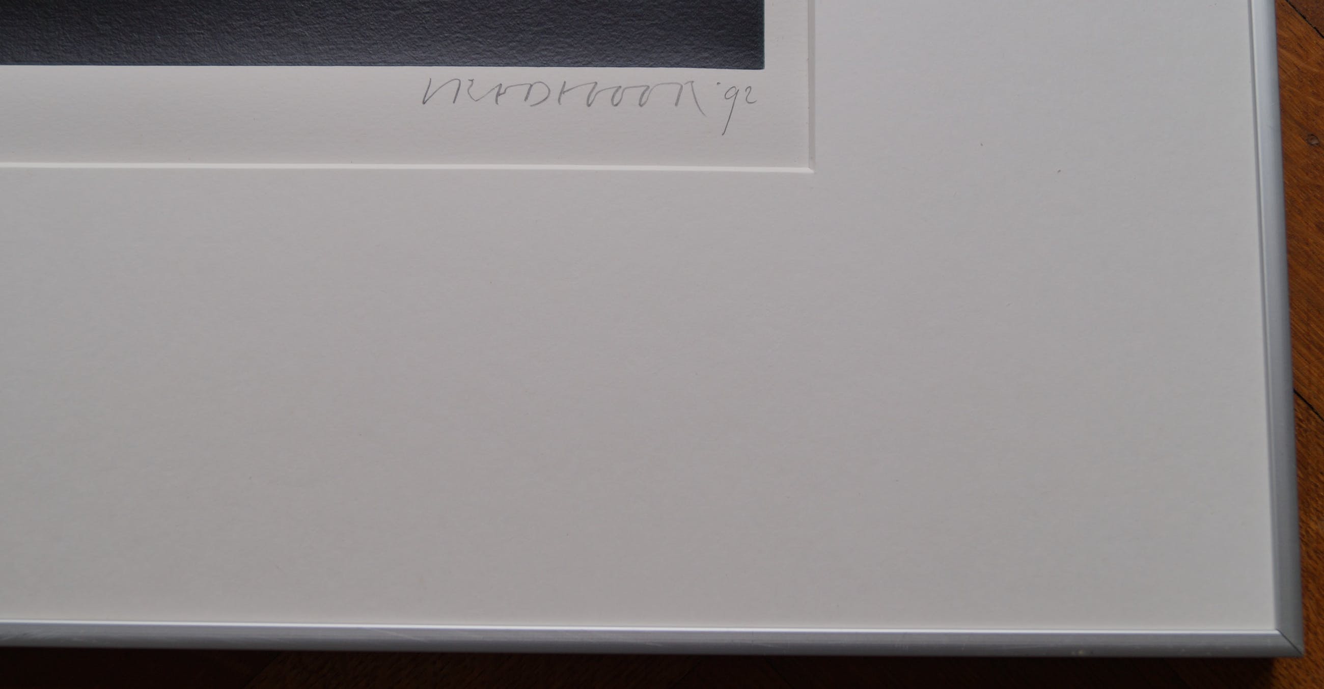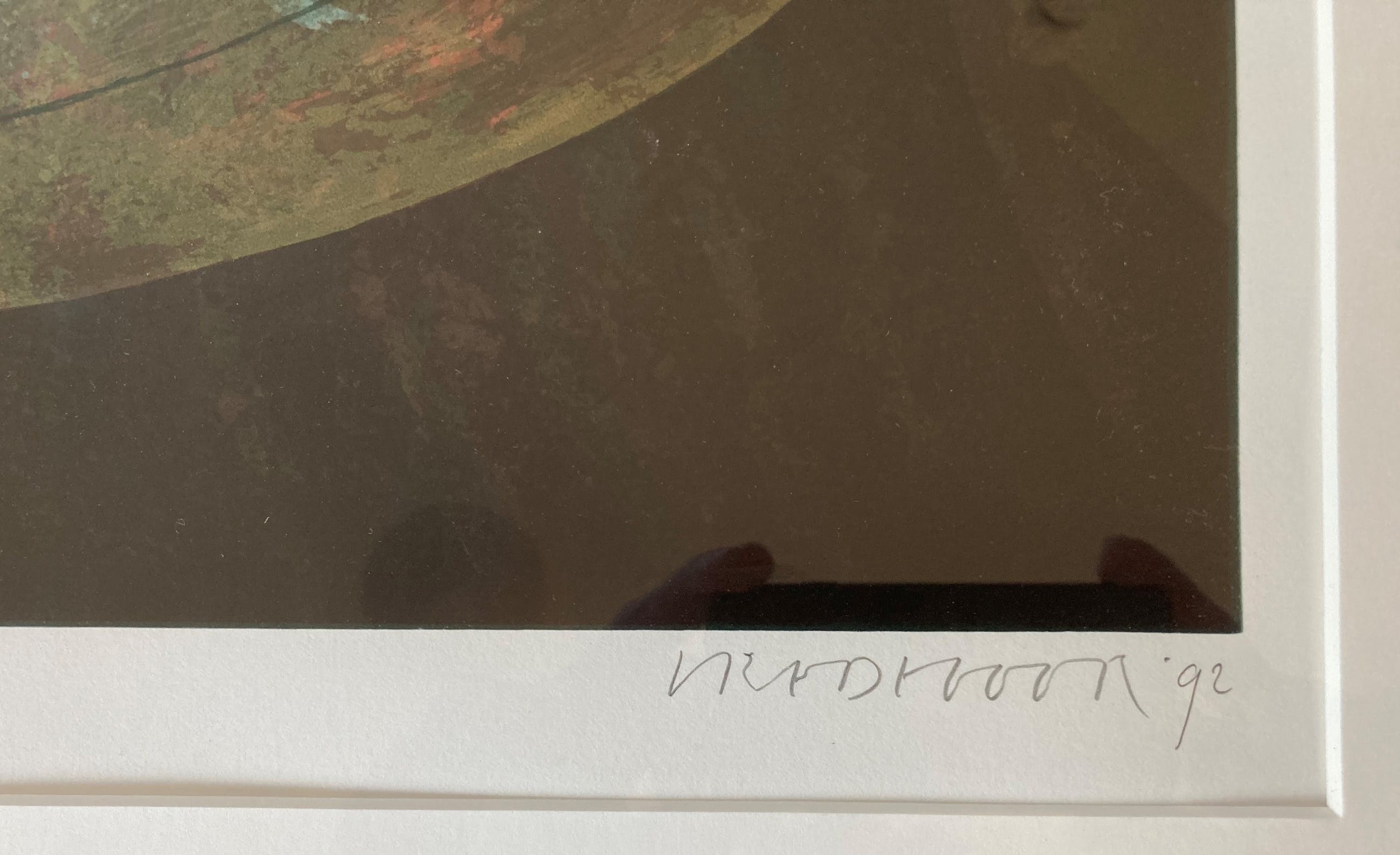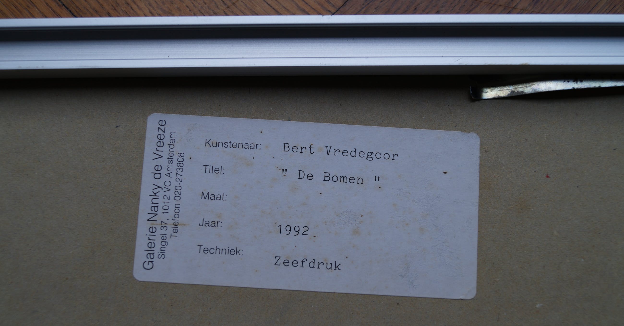 Bij ophalen in Eindhoven heeft het werk een lijst met glas en passe-partout. Glas heeft kleine schade, chipje rechtsonder, nauwelijks zichtbaar. Bij verzending (in ruime koker) wordt alleen de zeefdruk verstuurd i.v.m. grootte en kwetsbaarheid.