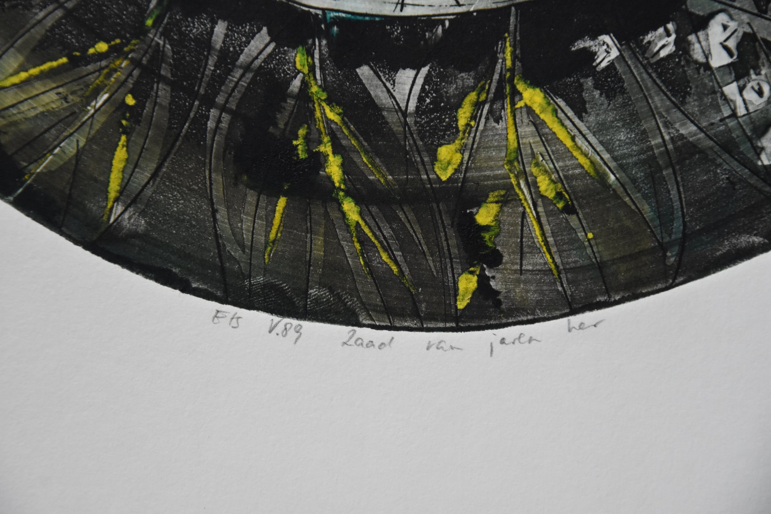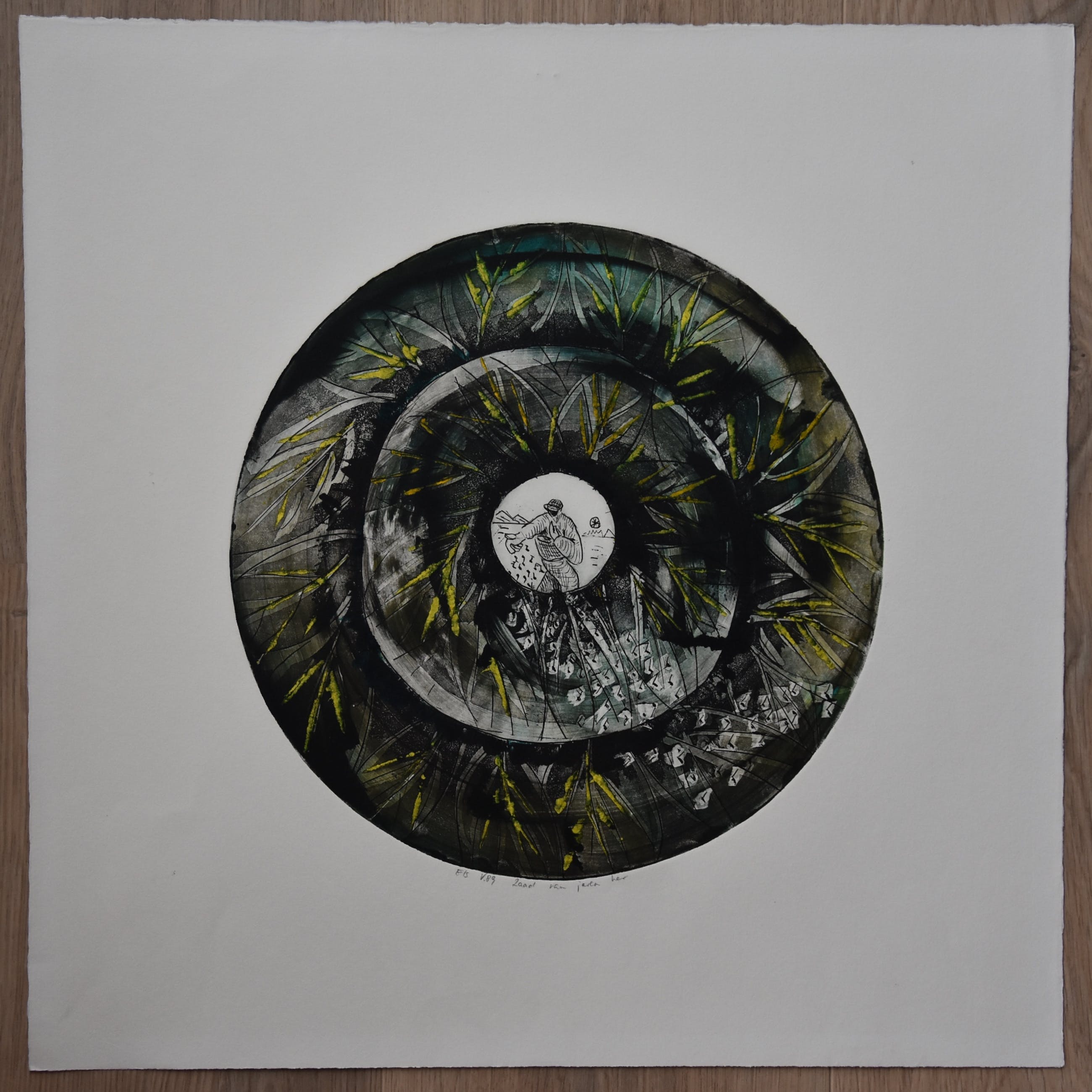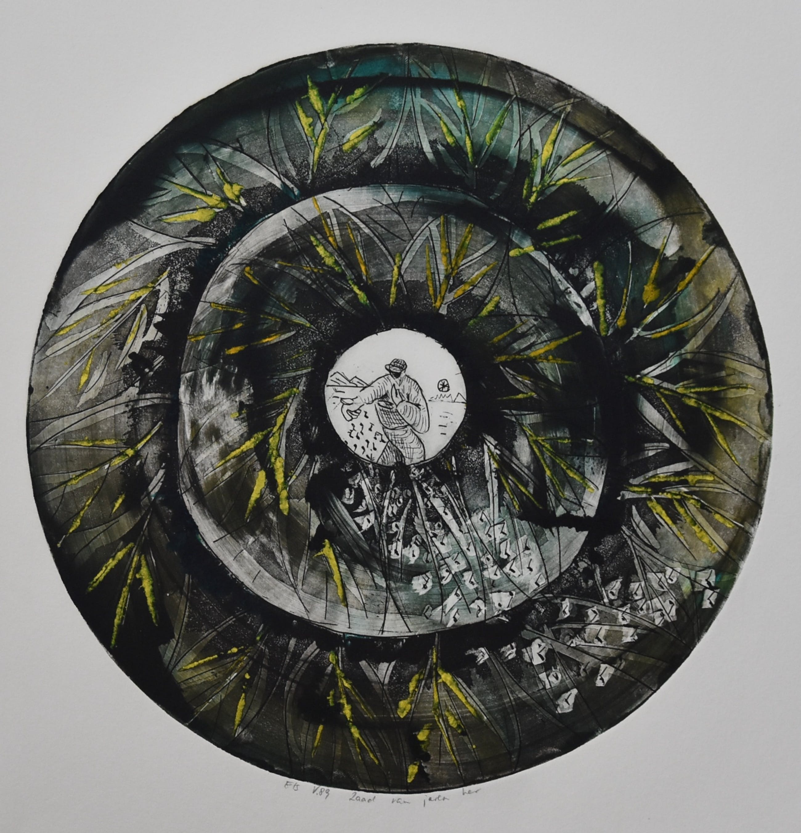 Kunstenaar : Bert Vredegoor titel : Zaad van Jaren her jaar: 1989 techniek: ets afmetingen : 32 x 30 cm. gesigneerd en getiteld : Ets V.89 Zaad van Jaren her ( in potlood) oplage : unicum ( handingekleurde ets)