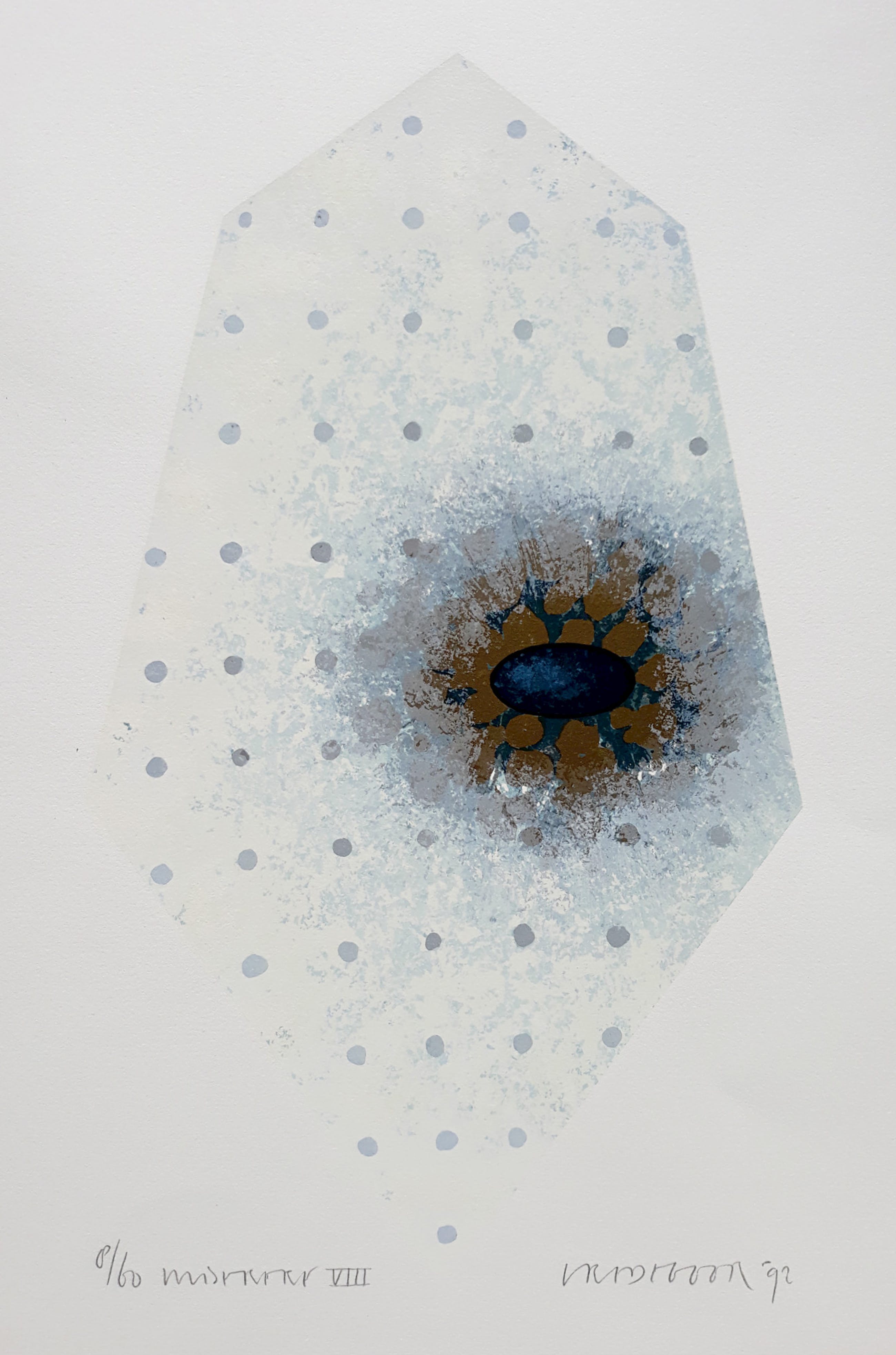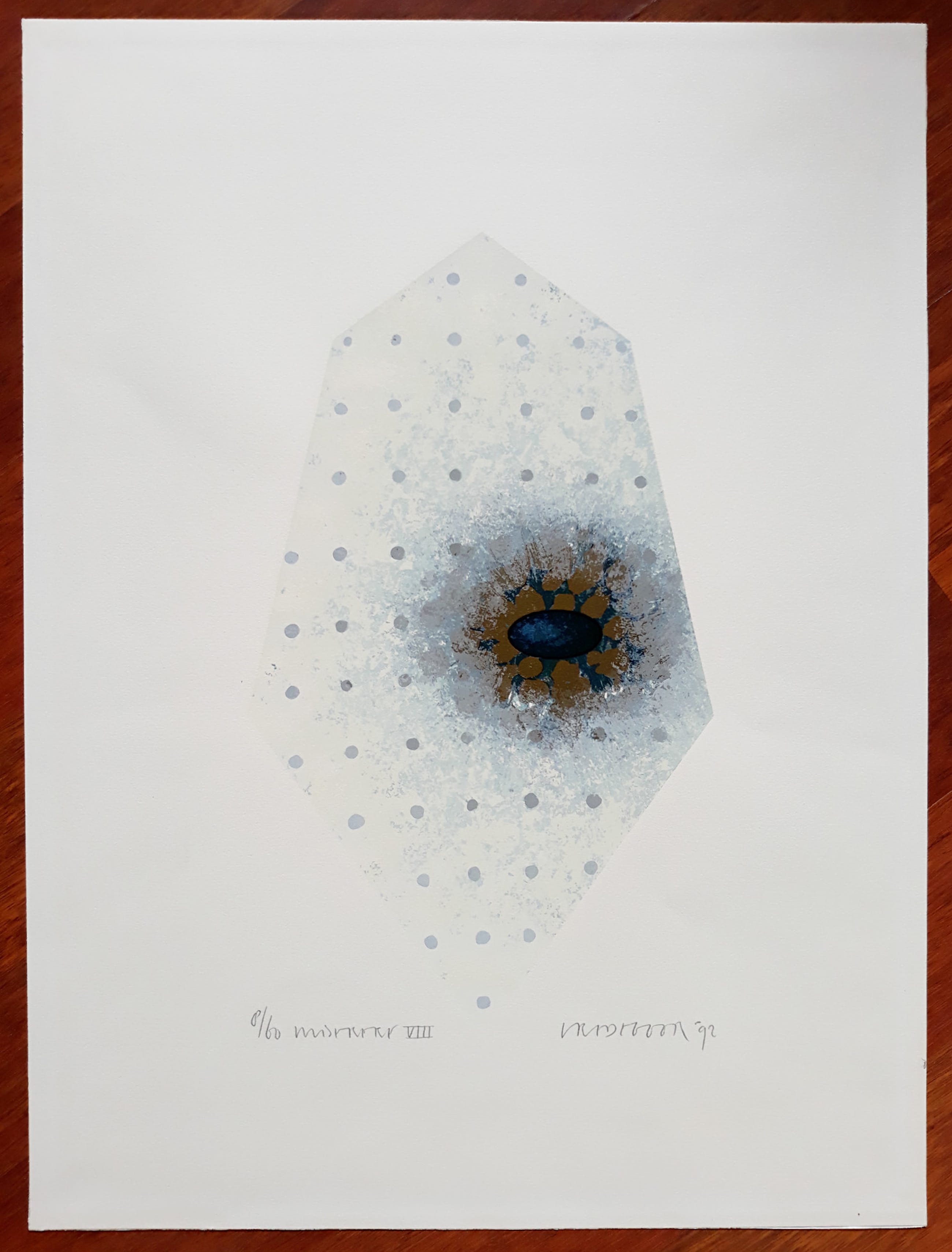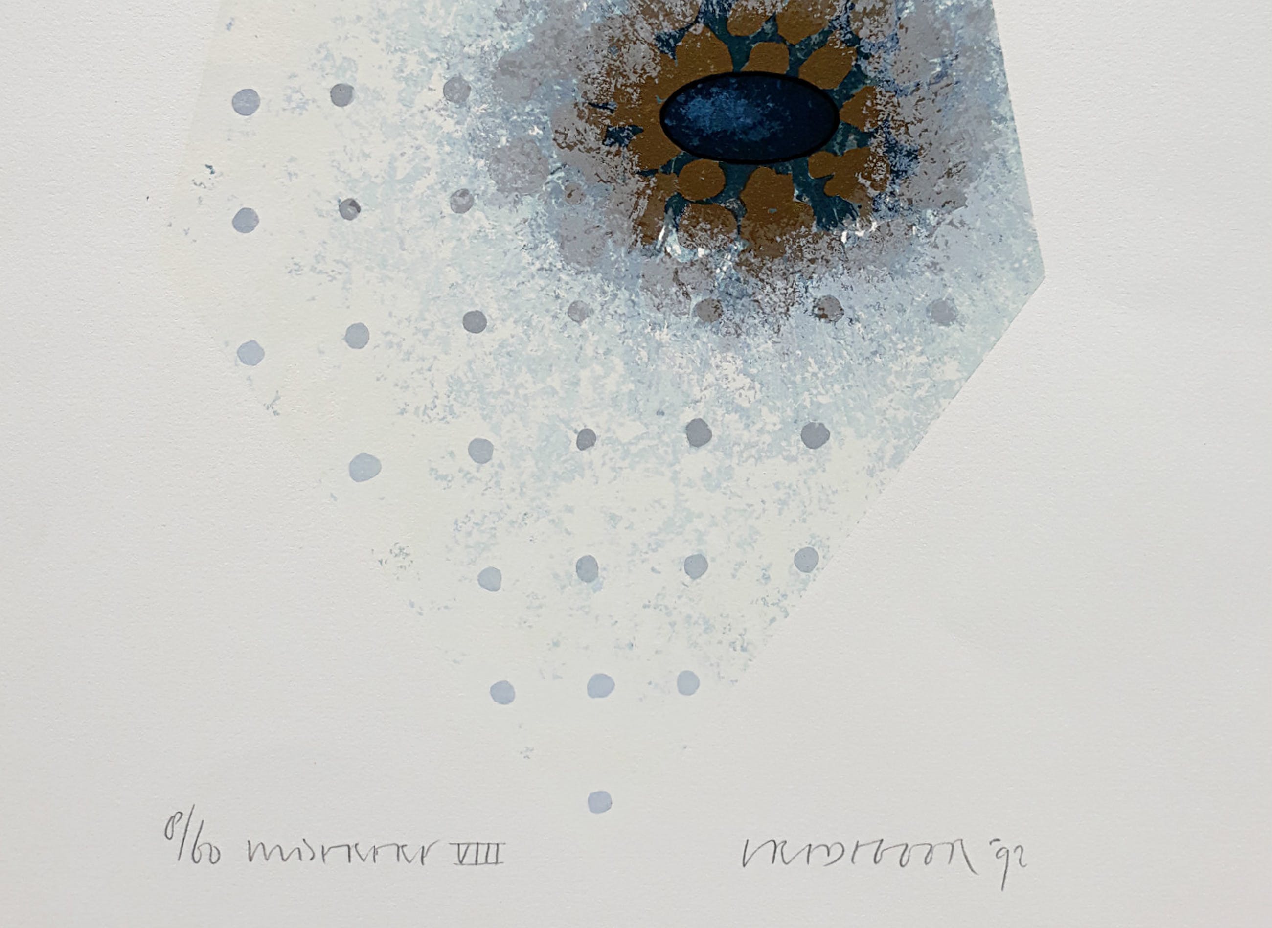 Subtiele compositie van Bert Vredegoor. Zeefdruk op papier, met potlood gesigneerd, gedateerd (‘92), getiteld (moeilijk te ontcijferen) en genummerd (8/60). Afkomstig uit de kunstcollectie van ABNAMRO, in zeer goede conditie.