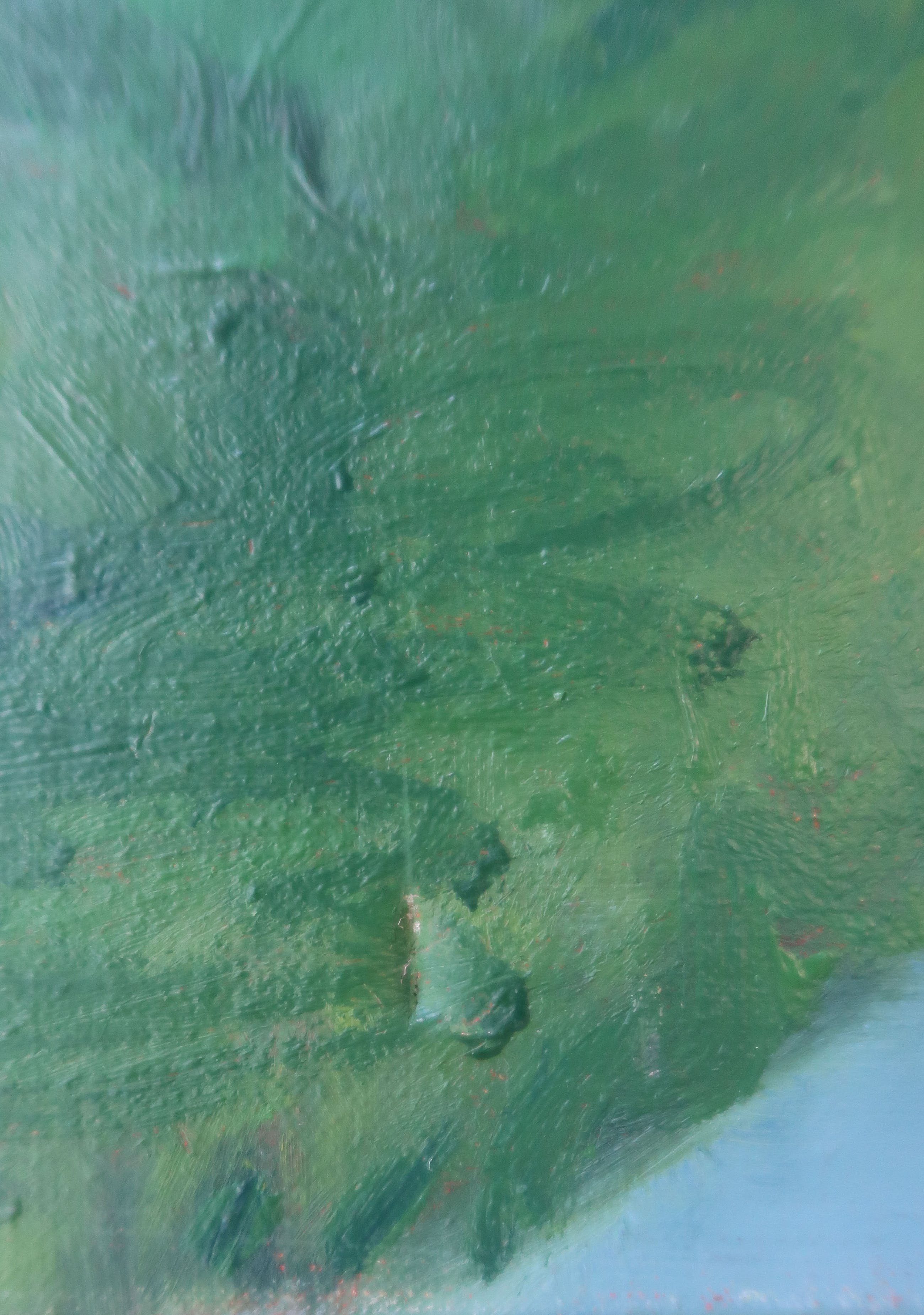 | Het doek verkeert grotendeels in goede staat. In het linkerdeel van het doek zit een kleine deuk (naar buiten toe), welke niet opvalt. Linksonder zit een klein gat in het canvas, zie hiervoor de detailfoto. De randen van het doek zijn verweerd. | |