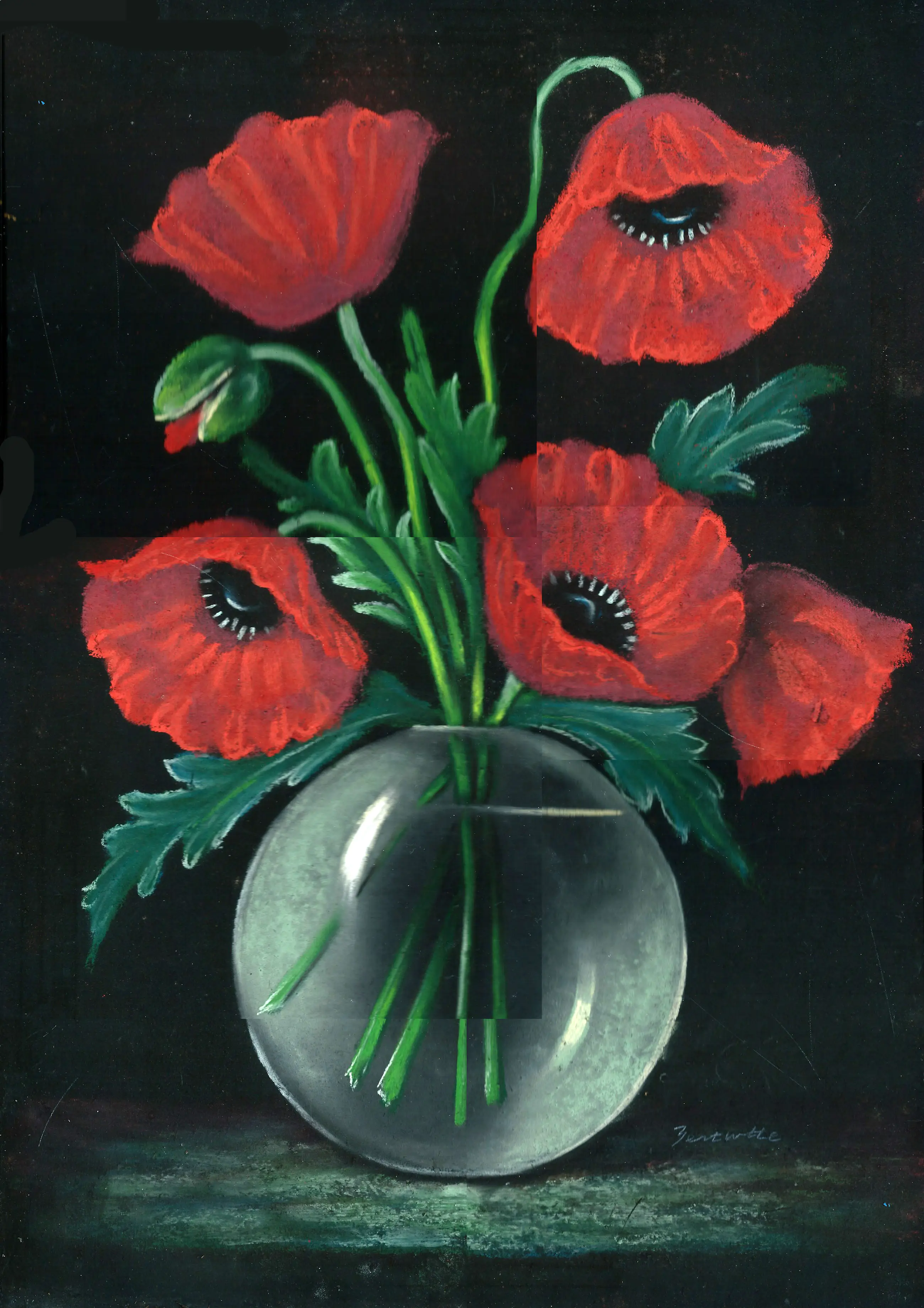 Werk van mulitkunstenaar Witte ("jeugdwerk") klaprozen in vaas met pastelkrijt (gefixeerd)