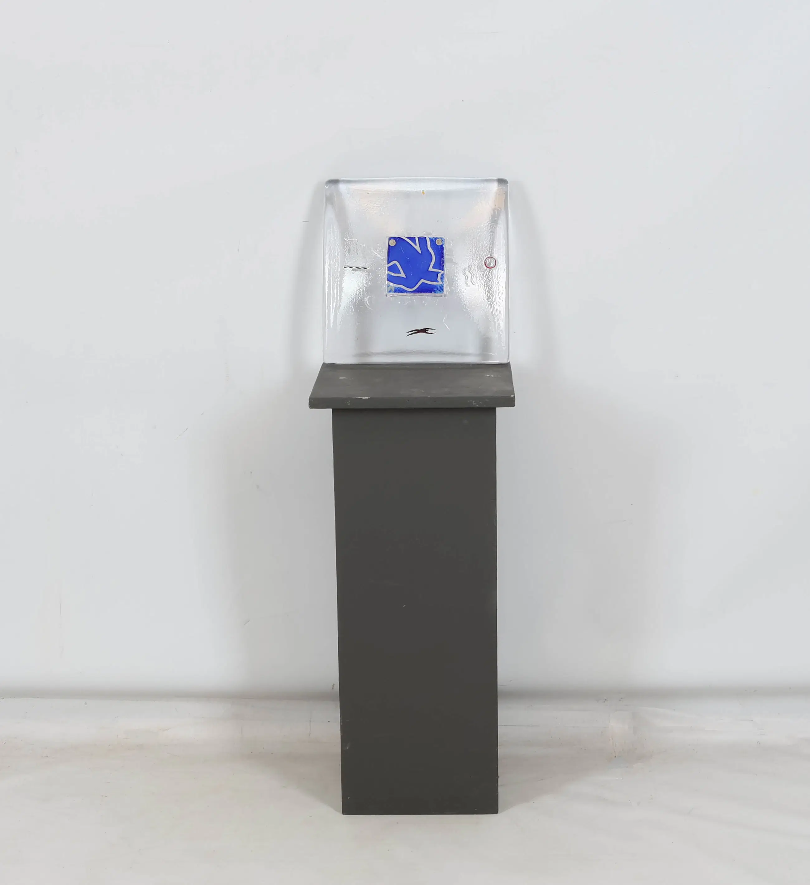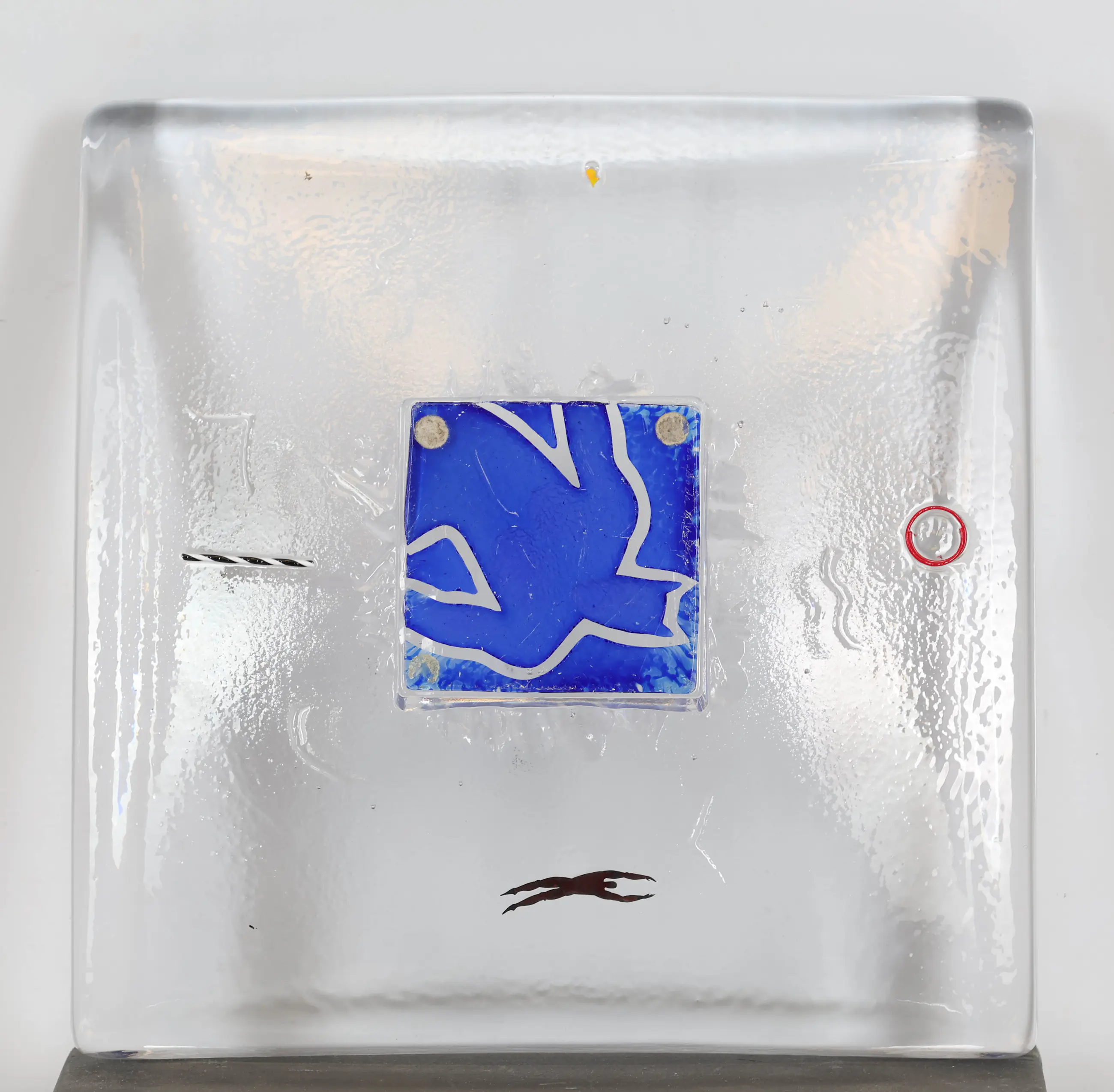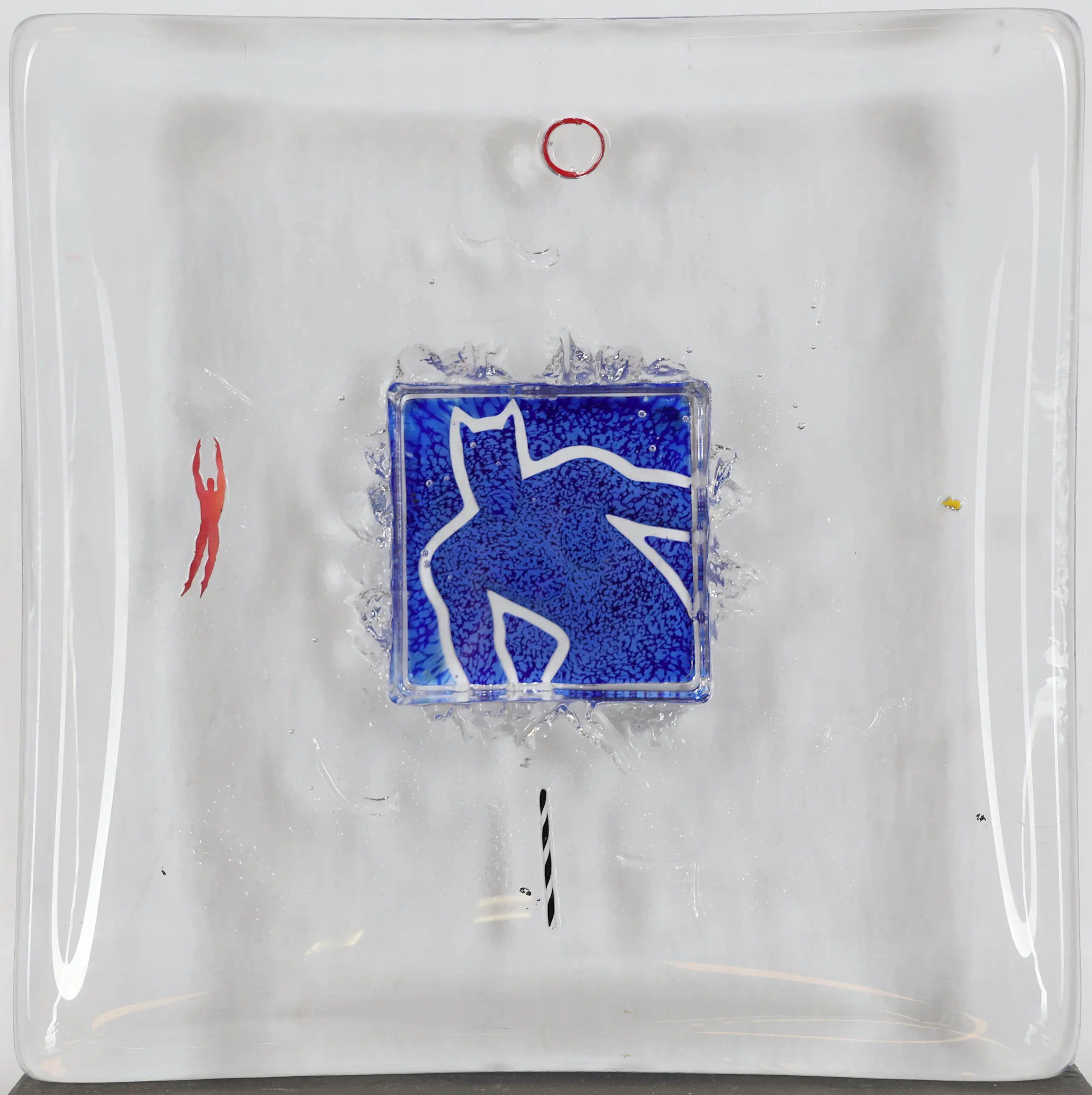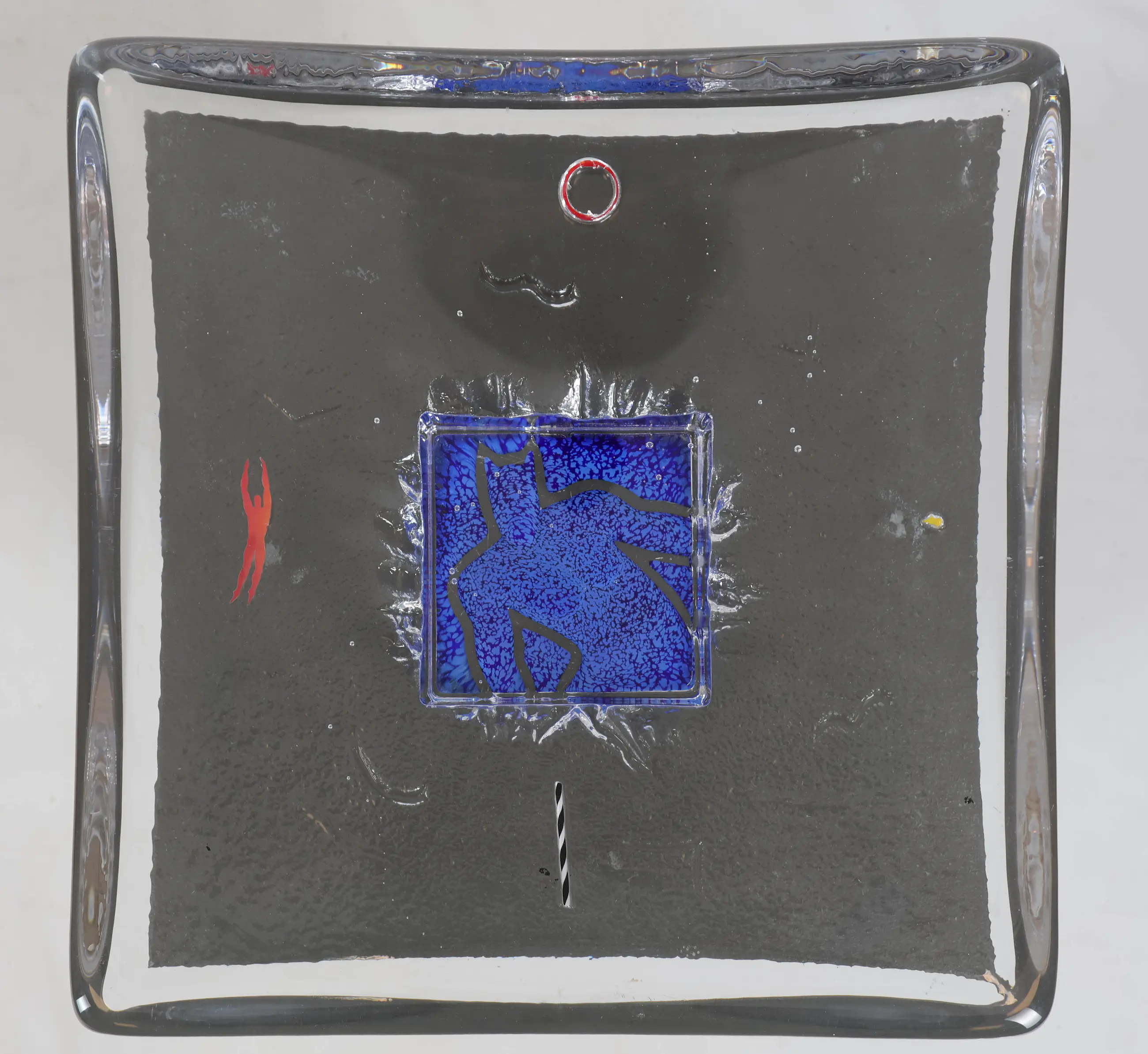Dit glaskunstwerk is vervaardigd door Bertil Vallien en bestaat uit een massief glazen schaalvorm waarin verschillende figuren zijn opgenomen, waaronder een klein zwemmend figuur. Het werk is typerend voor Valliens verhalende en symbolische benadering van glas, waarbij transparantie en diepte een belangrijke rol spelen.