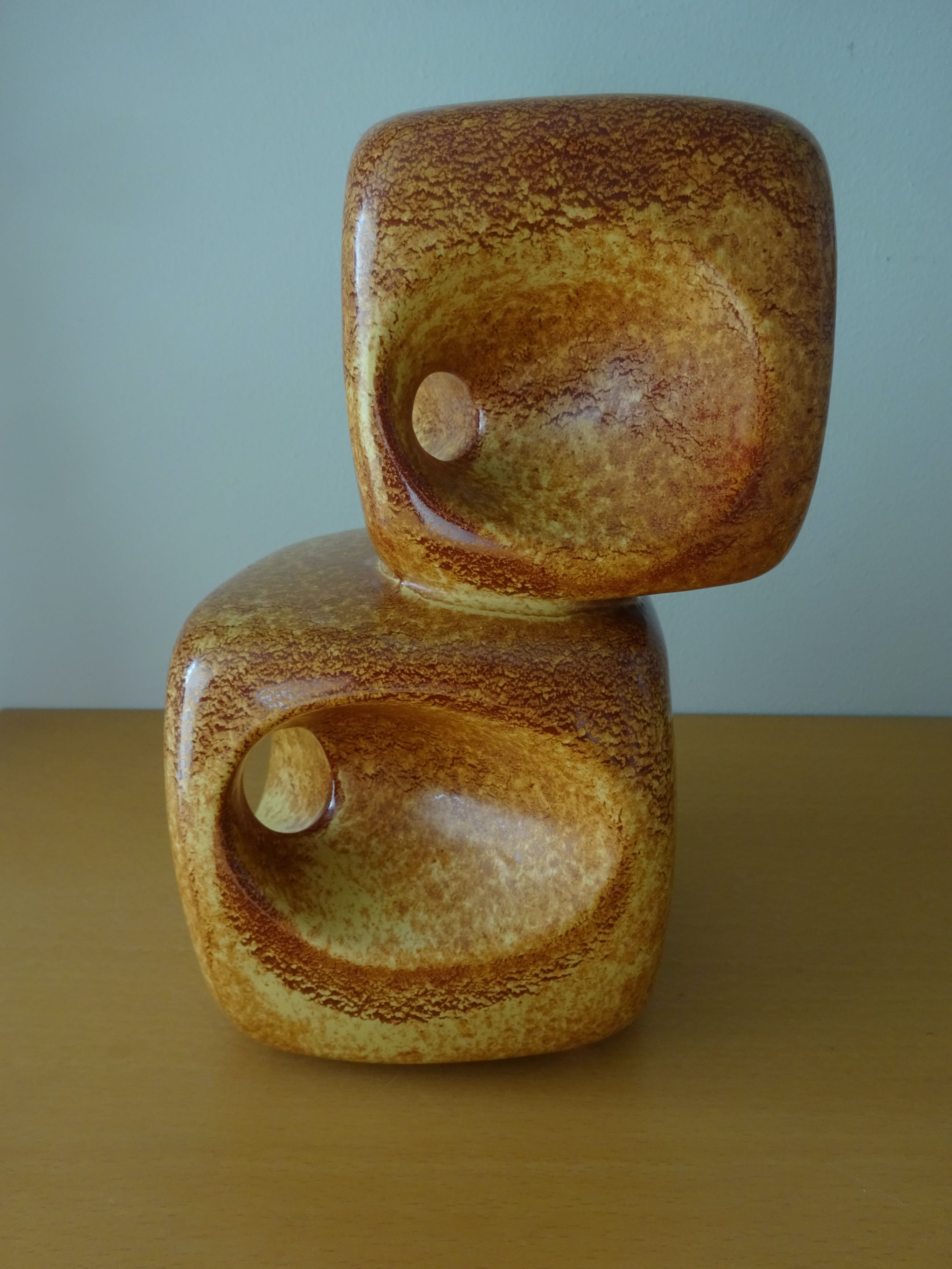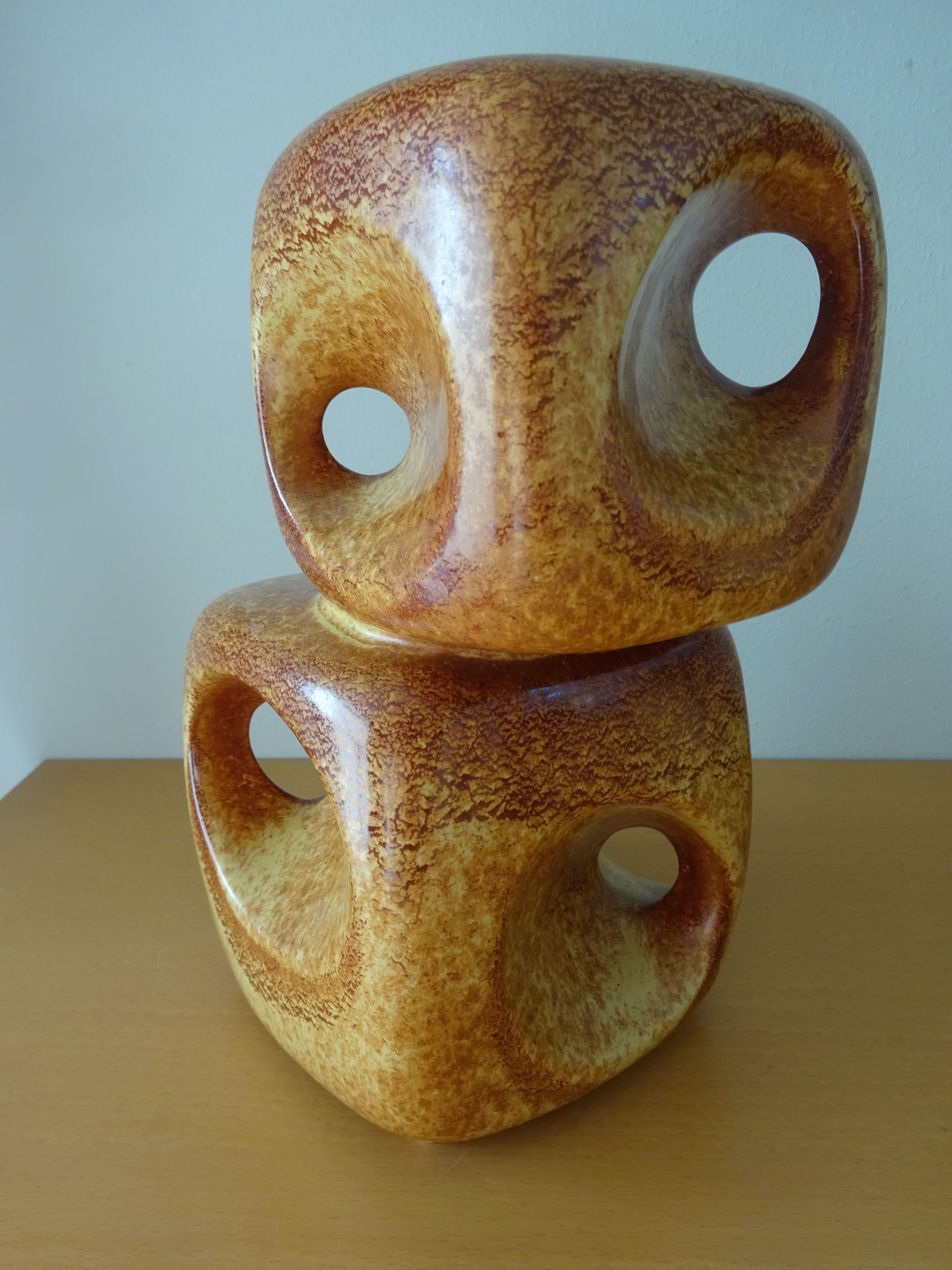 zand- en koffie kleurgebruik, zoals ook te zien is op deze voorwerpen. De vormen zijn geometrisch en monumentaal met veel