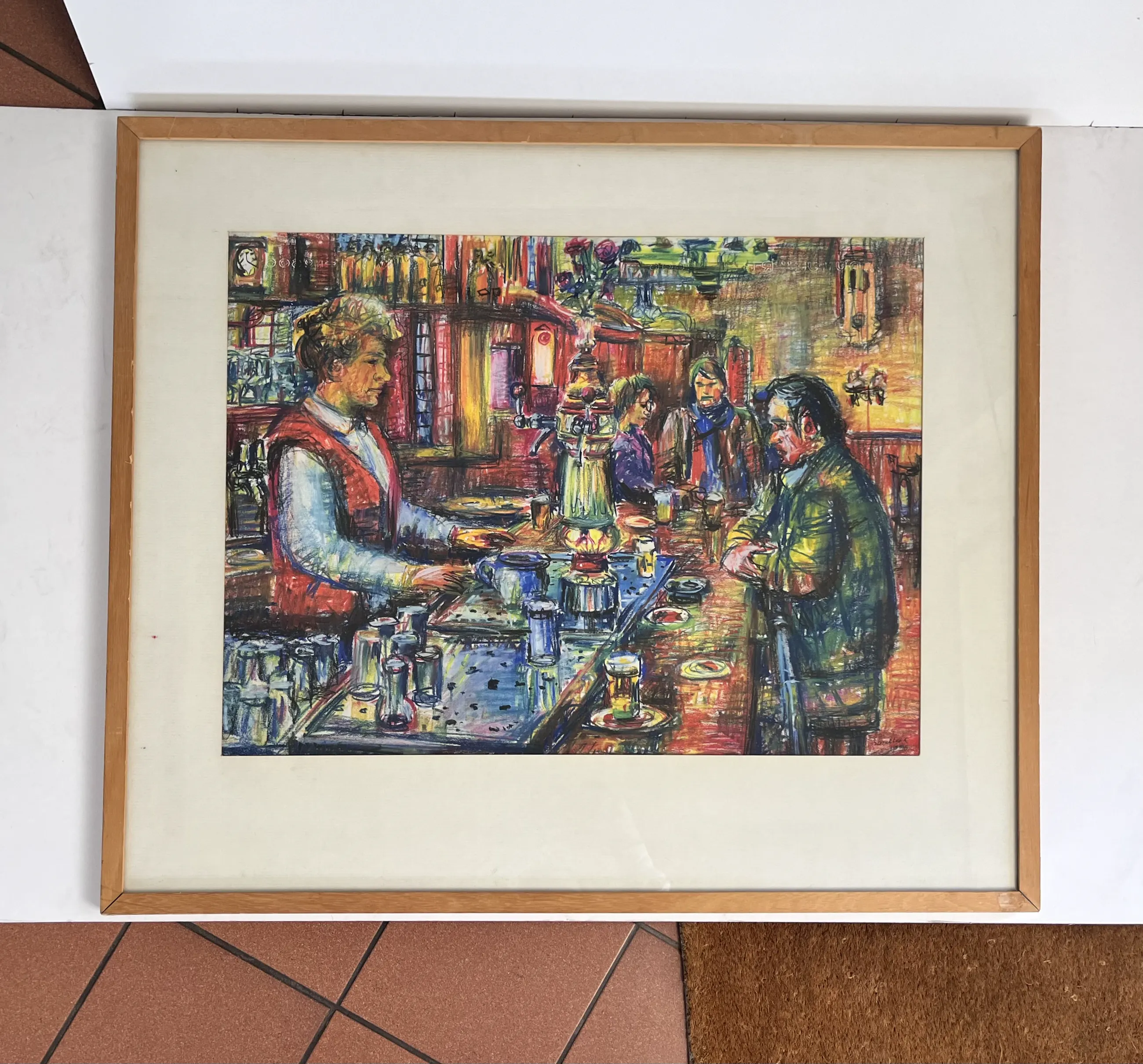 Mooi bar tafereel van Bessel kok. Origineel werk, oliepastel. U kunt het werk vooraf komen beoordelen in de schatkamer van galerie Rotor in Gorcum. In overleg kunt u uw aankopen laten opslaan in onze verwarmde opslagruimte en ze in een later stadium ophalen. Foto is door het glas van de lijst heen genomen.