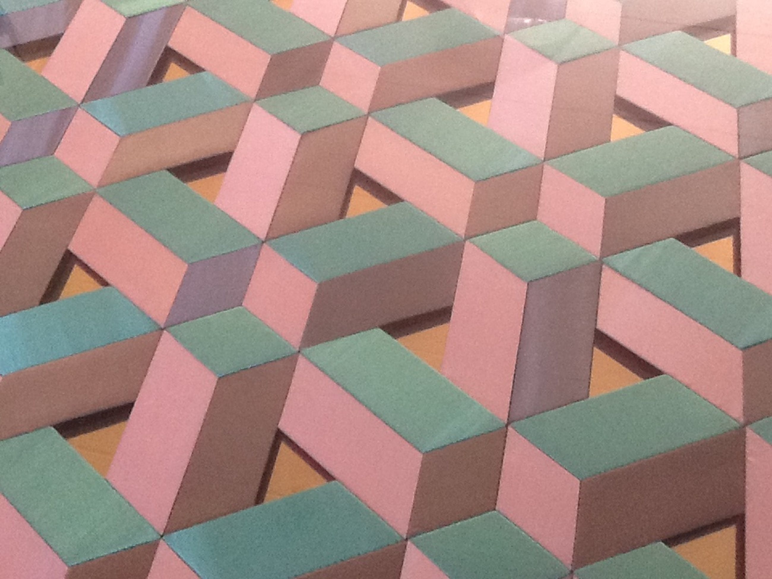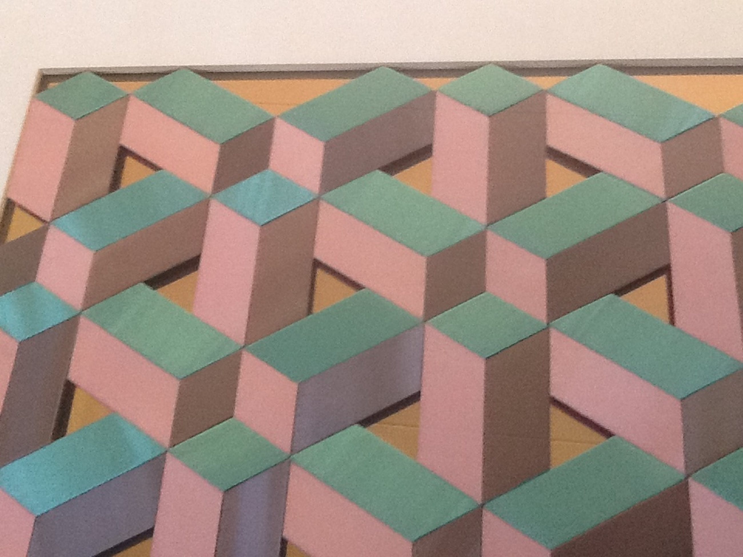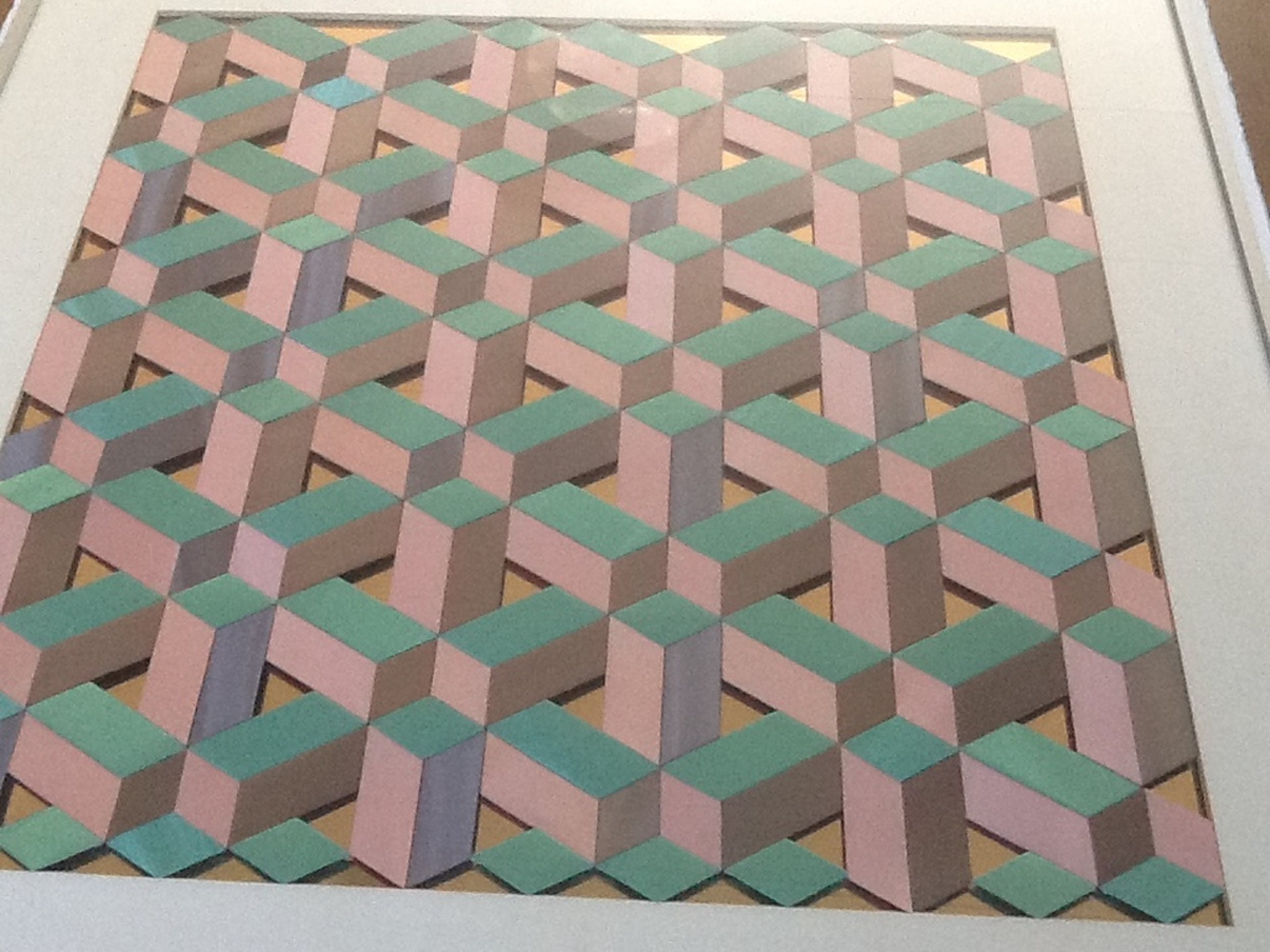 Bijzonder kunstwerk van Betsy Liepertz, patchwork vlakken op een geometrische wijze aan elkaar genaaid. Het 3D effect wordt versterkt door het spiegelende goudkleurige folie op de achtergrond