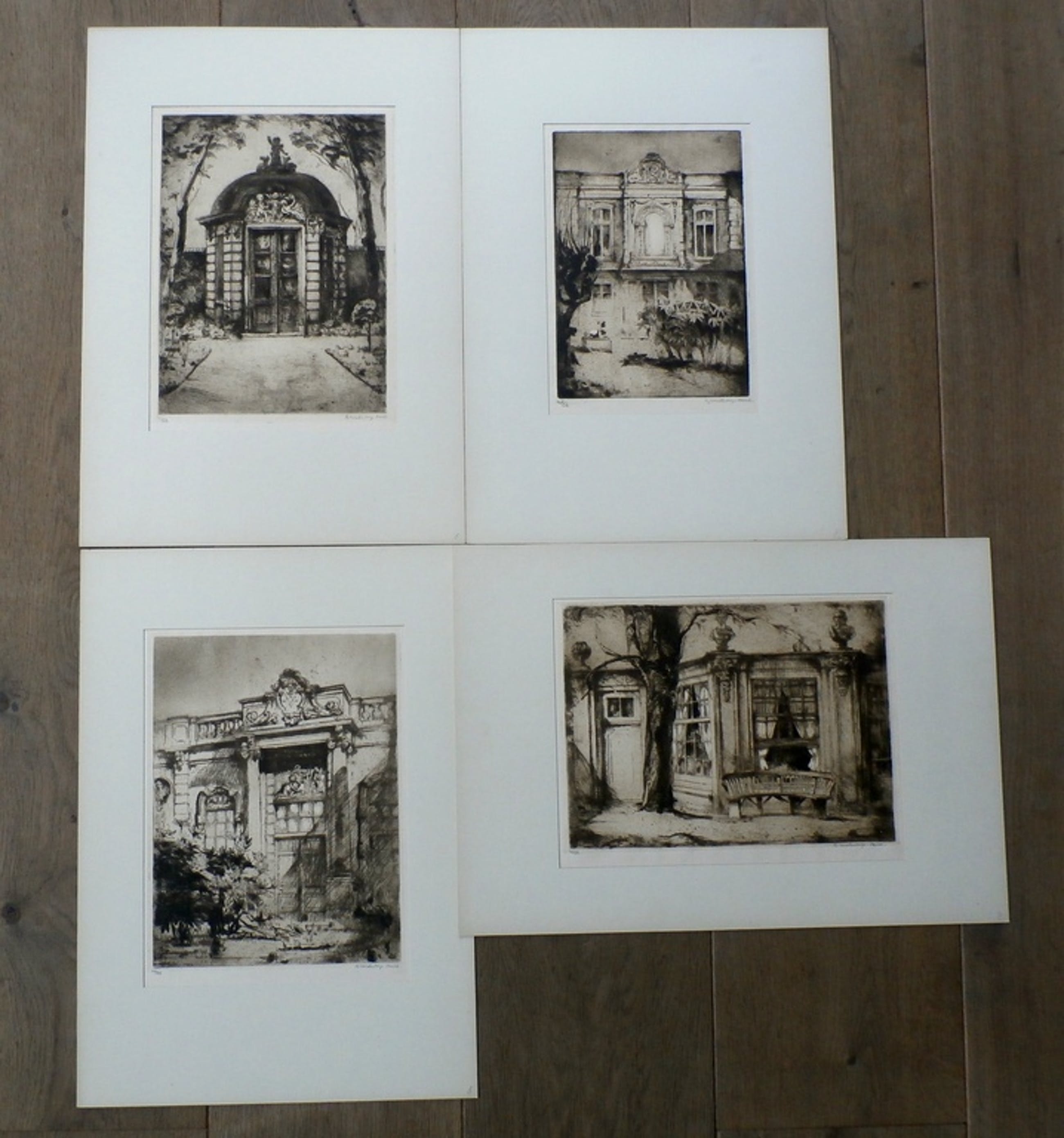 10 gesigneerde en genummerde etsen van Betty Westendorp - Osieck. Het betreft 10 voorstellingen van tuinhuizen in Amsterdam.