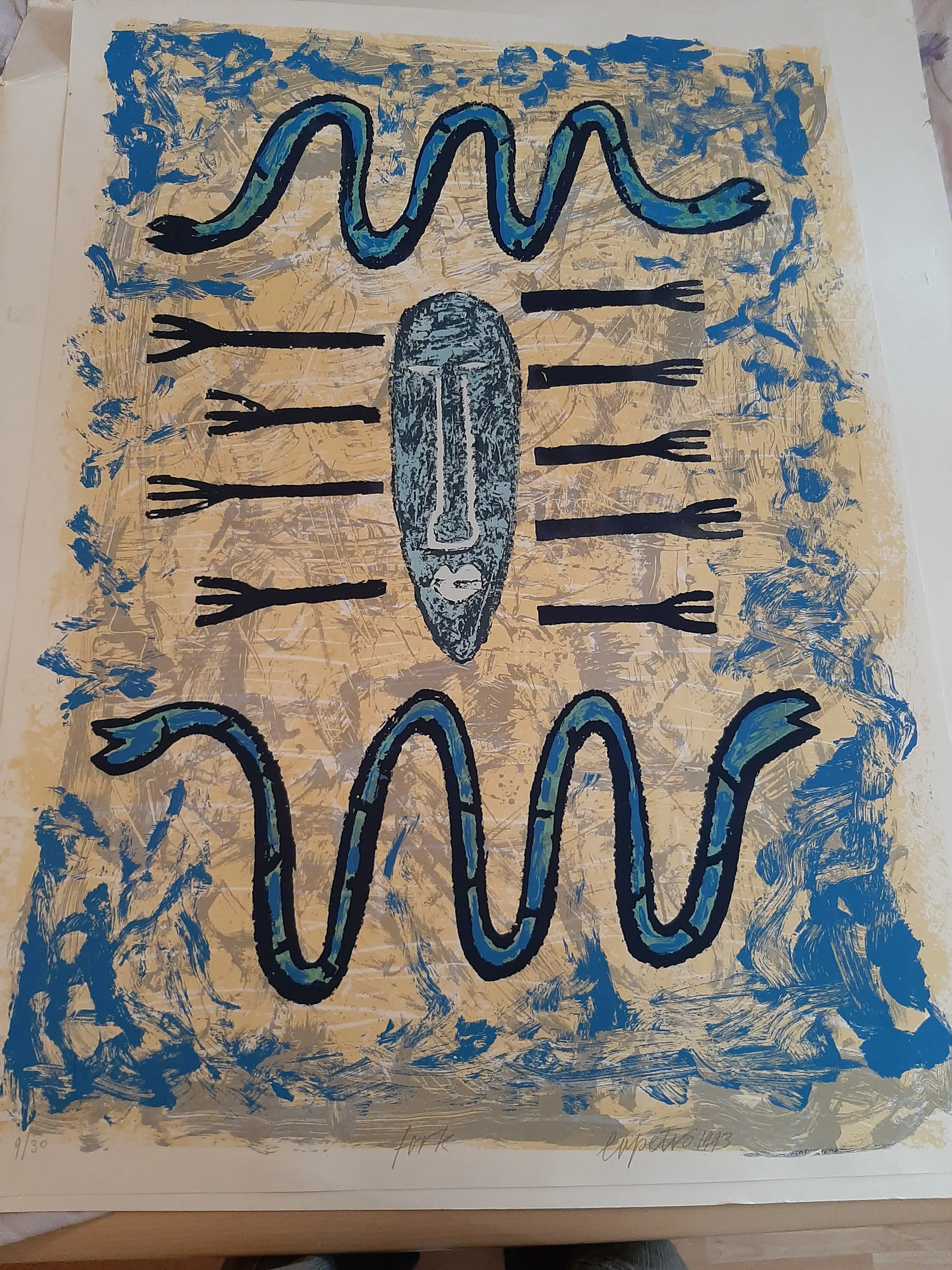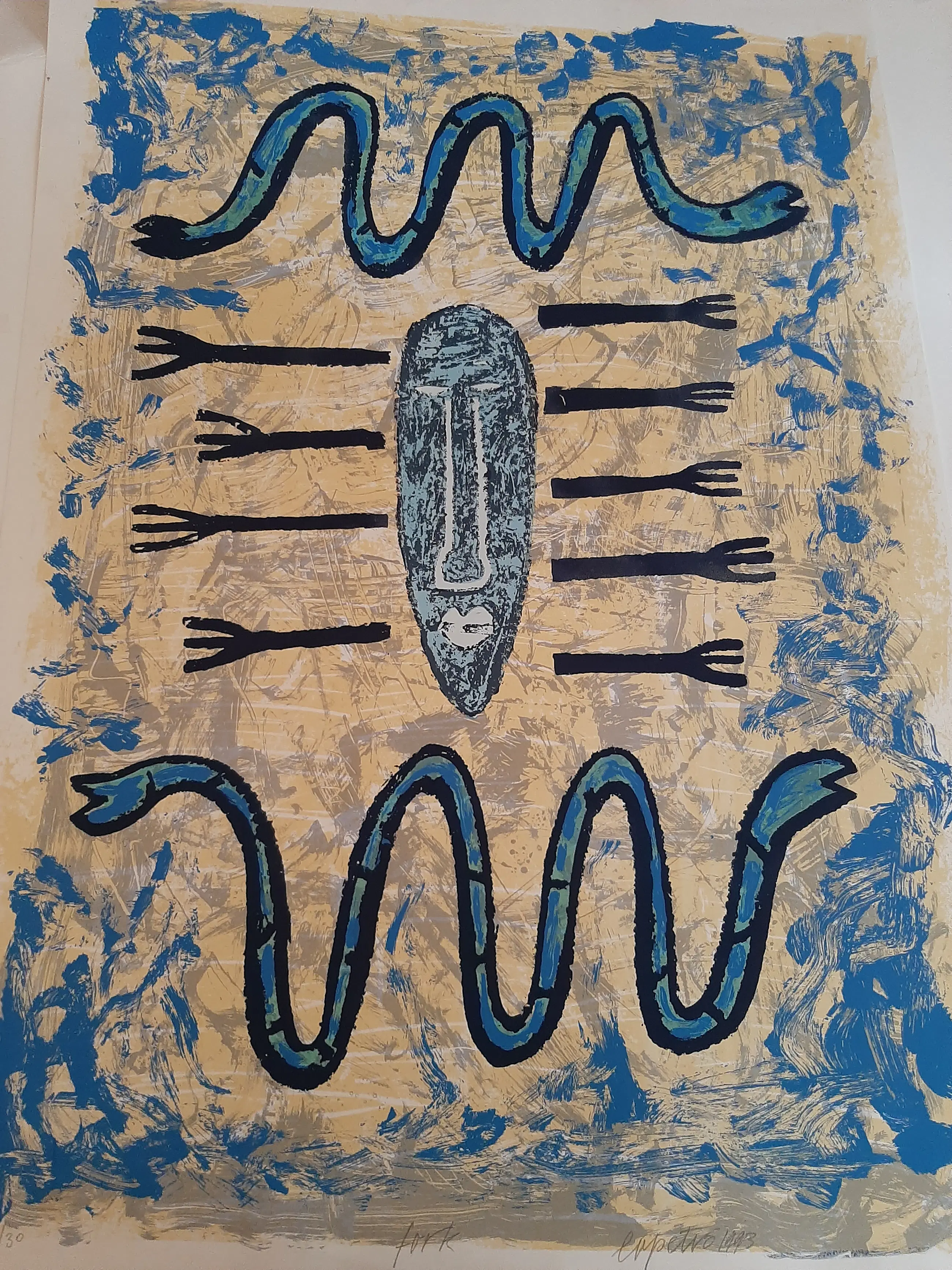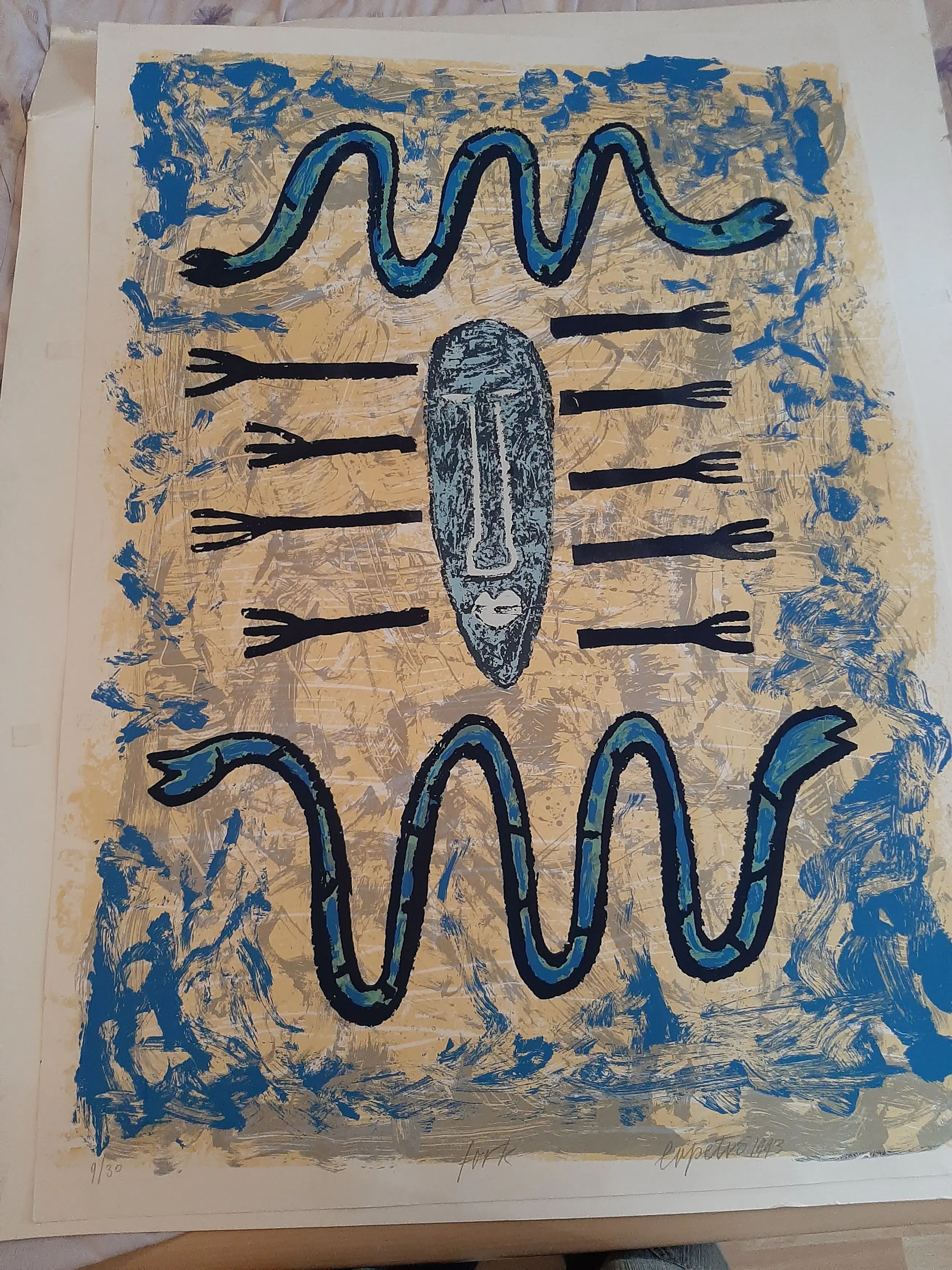 Deze grote en kleurrijke zeefdruk van Bettina Lopetro uit 1993 is in prima staat en heeft een afmeting van H. 100 x B. 70 cm.