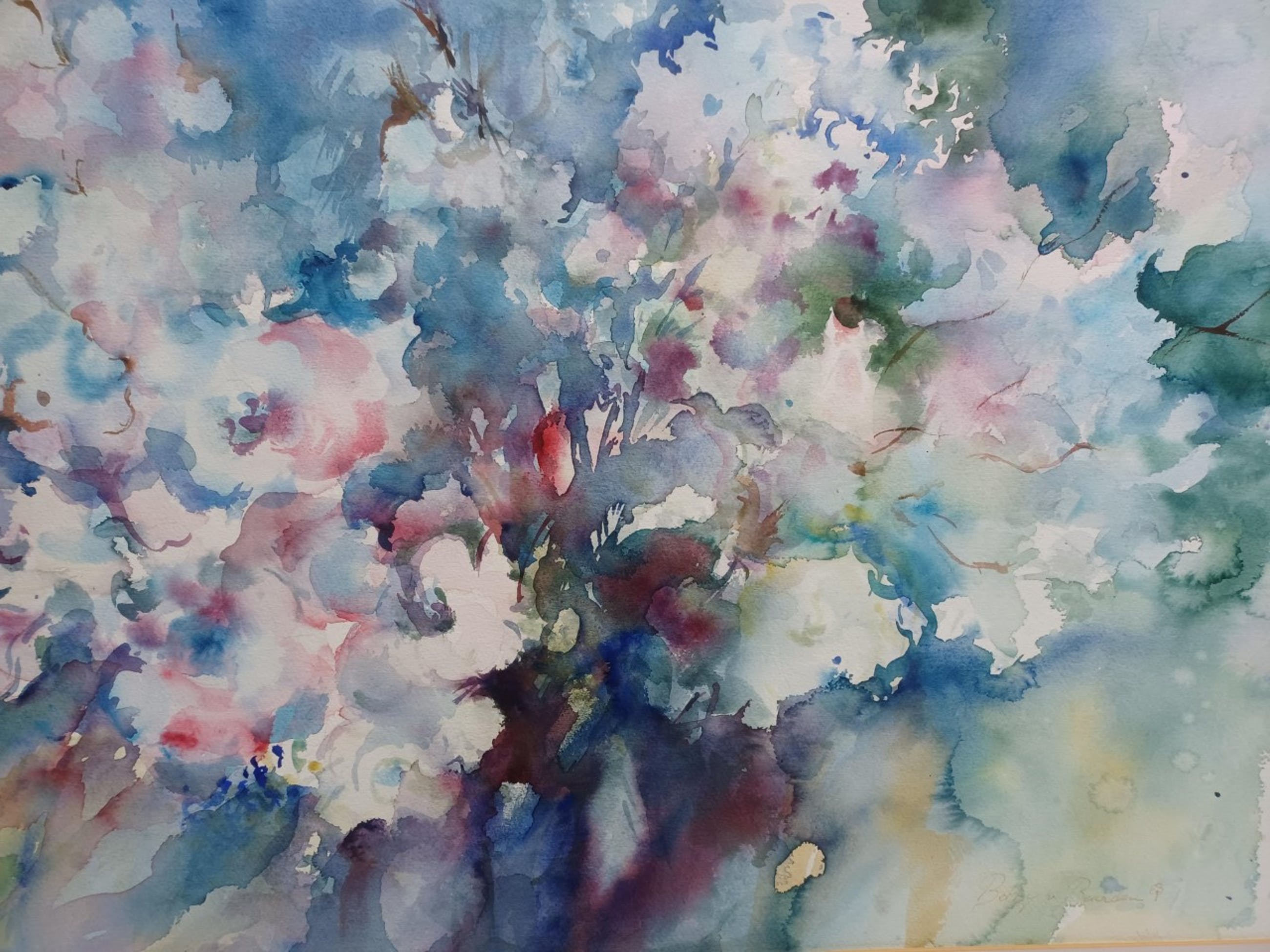 Maria Elisabeth Theodora Theeuwen, signeert met Betty van Beurden. Ze is in 1928 geboren in Eindhoven waar ze ook haar hele leven heeft gewerkt. Haar specialisme waren aquarellen van bloemstillevens, zoals dit schitterende grote werk van haar. Door het zeer grote formaat van de glasplaat is ophalen de beste optie. Opsturen is in dit geval geen goede optie. Kan ook worden bezorgd tegen afgesproken tarief
