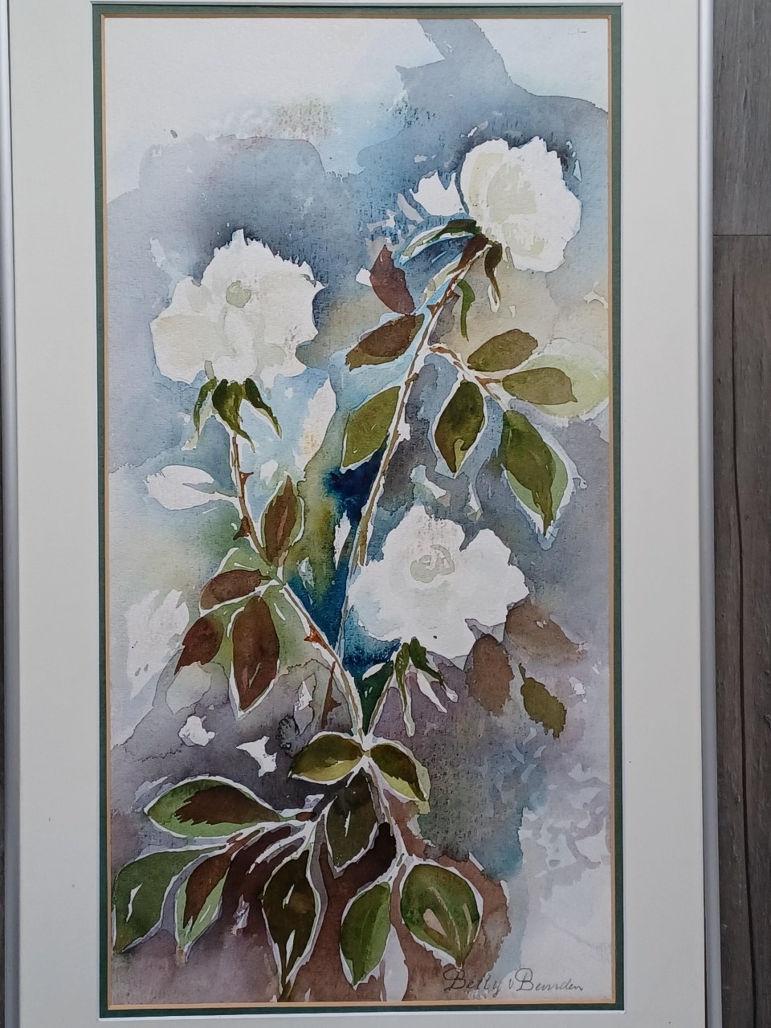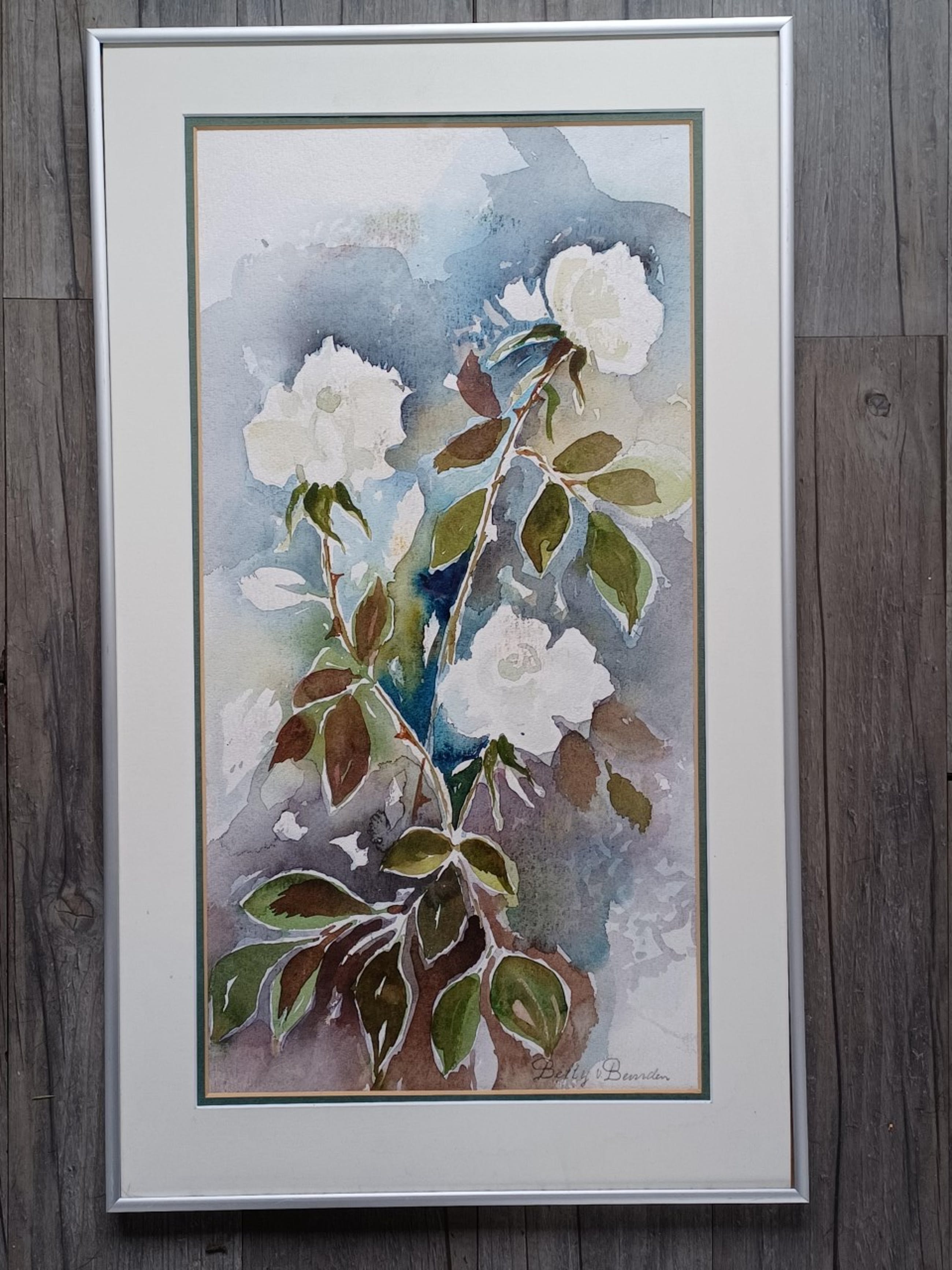 Maria Elisabeth Theodora Theeuwen, signeert met Betty van Beurden. Ze is in 1928 geboren in Eindhoven waar ze ook haar hele leven heeft gewerkt. Haar specialisme waren aquarellen van bloemstillevens, Zal worden verzonden in een op maat gemaakte kist om beschadiging te voorkomen, glasbreuk blijft risico koper. Kan ook worden afgehaald in Velsen-noord.