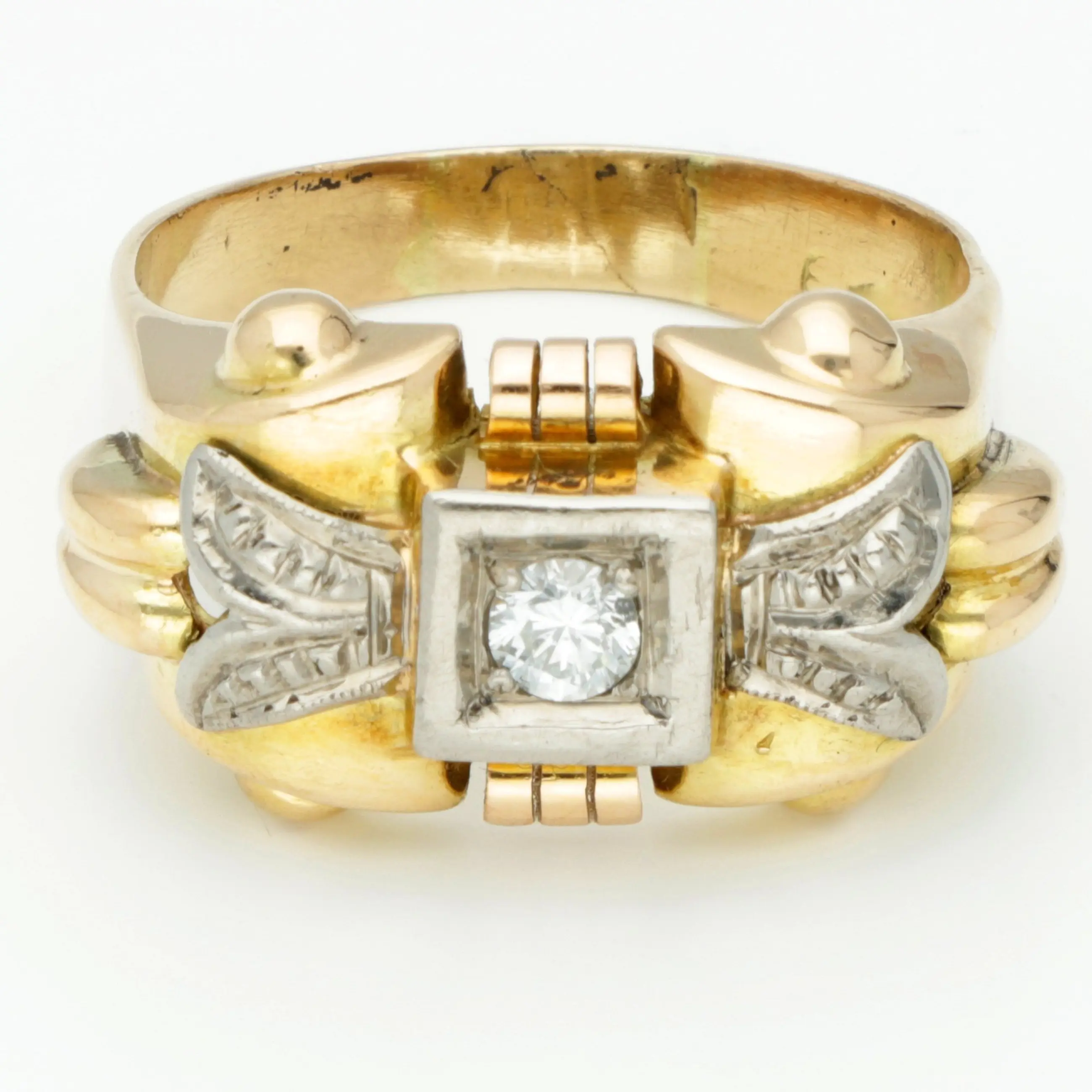 Type: Ring Geslacht: Dames Materiaal: Tweekleurig, Goud Materiaalfijnheid: 18 karaat Maat: 18.50 mm. Totaal gewicht: 6.20 g Staat: Zeer goede staat - een beetje gebruikt met kleine tekenen van slijtage Hoofdsteen: Diamant Diamant zuiverheid: SI1 / SI2 Diamant kleurgehalte: G Stijl: Vintage