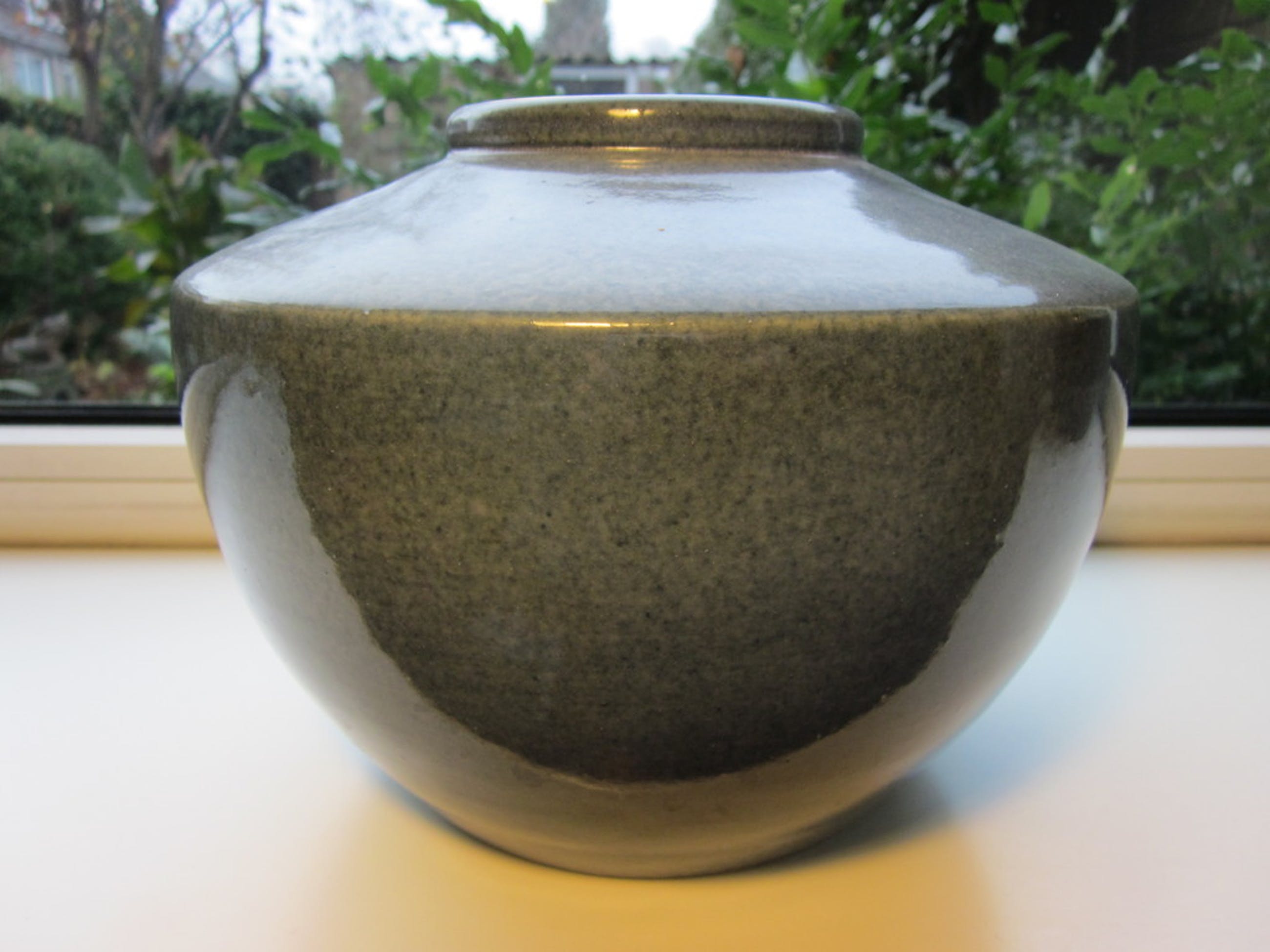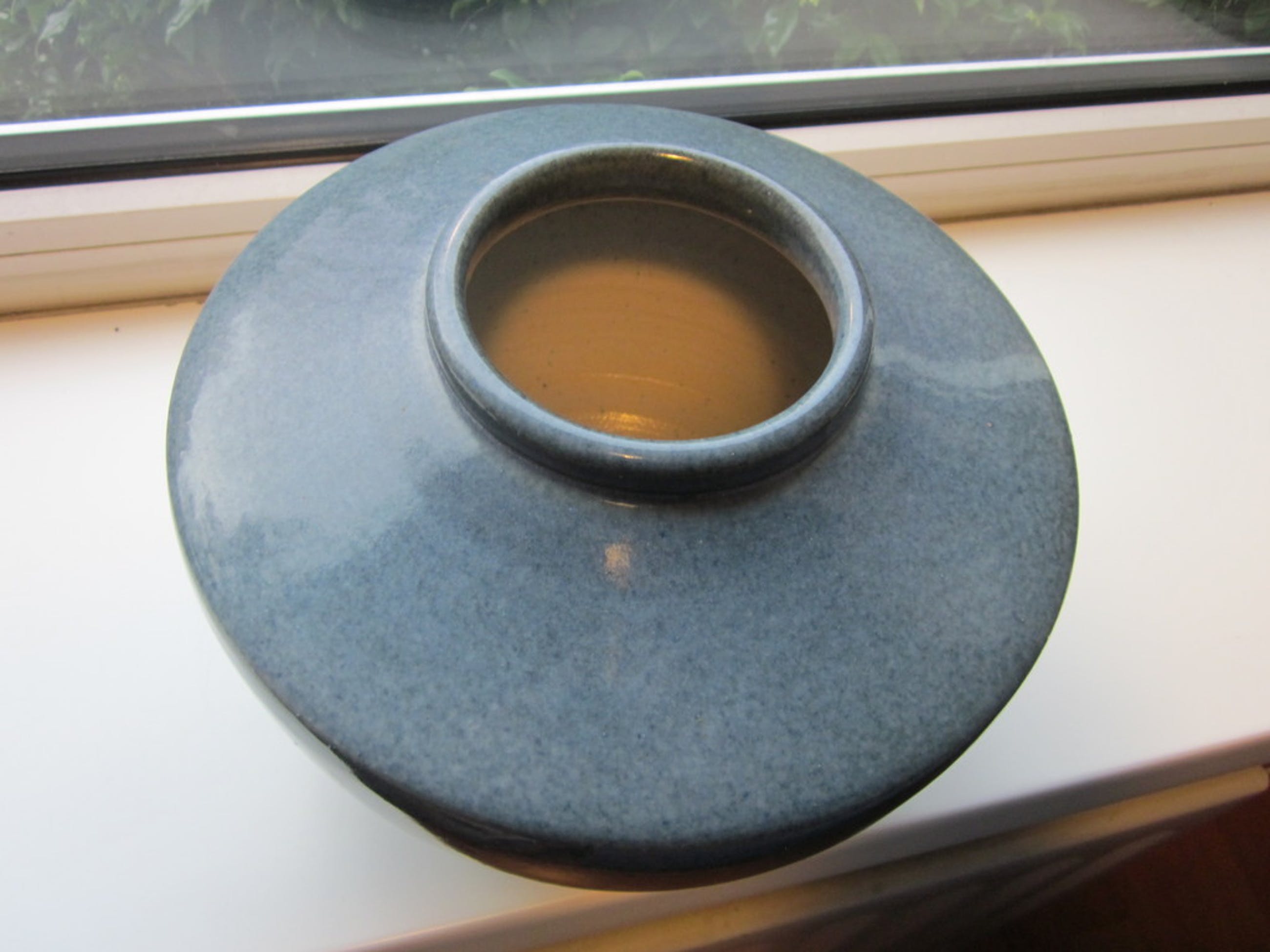 Robuuste, blauwe vaas in mooie vorm van de bekende keramiekfabriek in Katwijk. Behoeft geen bloemen om tot zijn recht te komen. Stamt uit het einde van de jaren '70 van de vorige eeuw. Monogram aan de onderzijde. Is in uitstekende staat. Afmetingen: h. ca. 18 cm, br. 22 cm. Gewicht: 2 kilo. Zie de foto's voor verdere informatie.