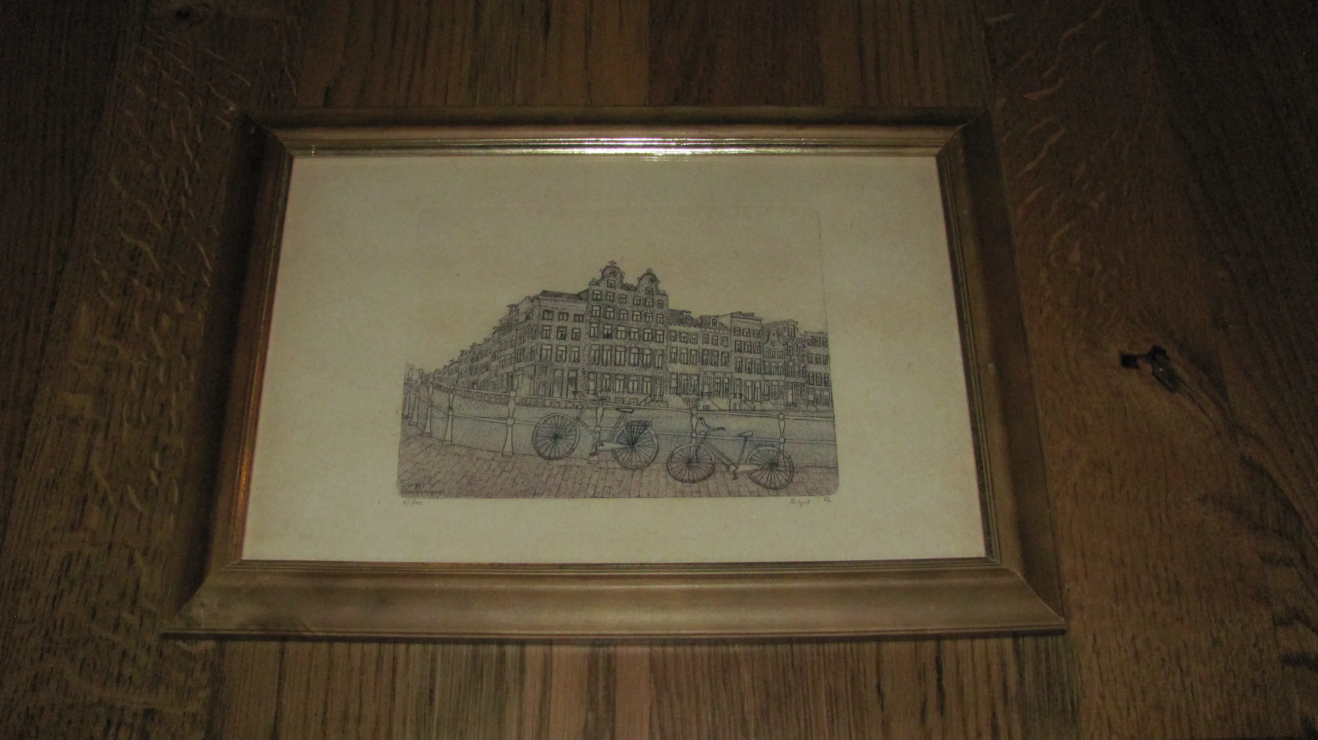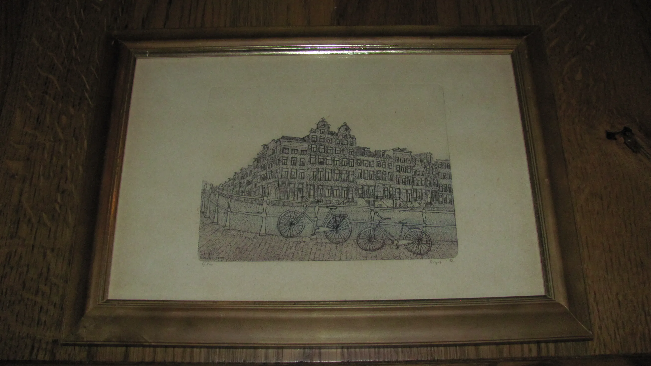 Ingelijst in een houten lijst met passe-partout en glasplaat.