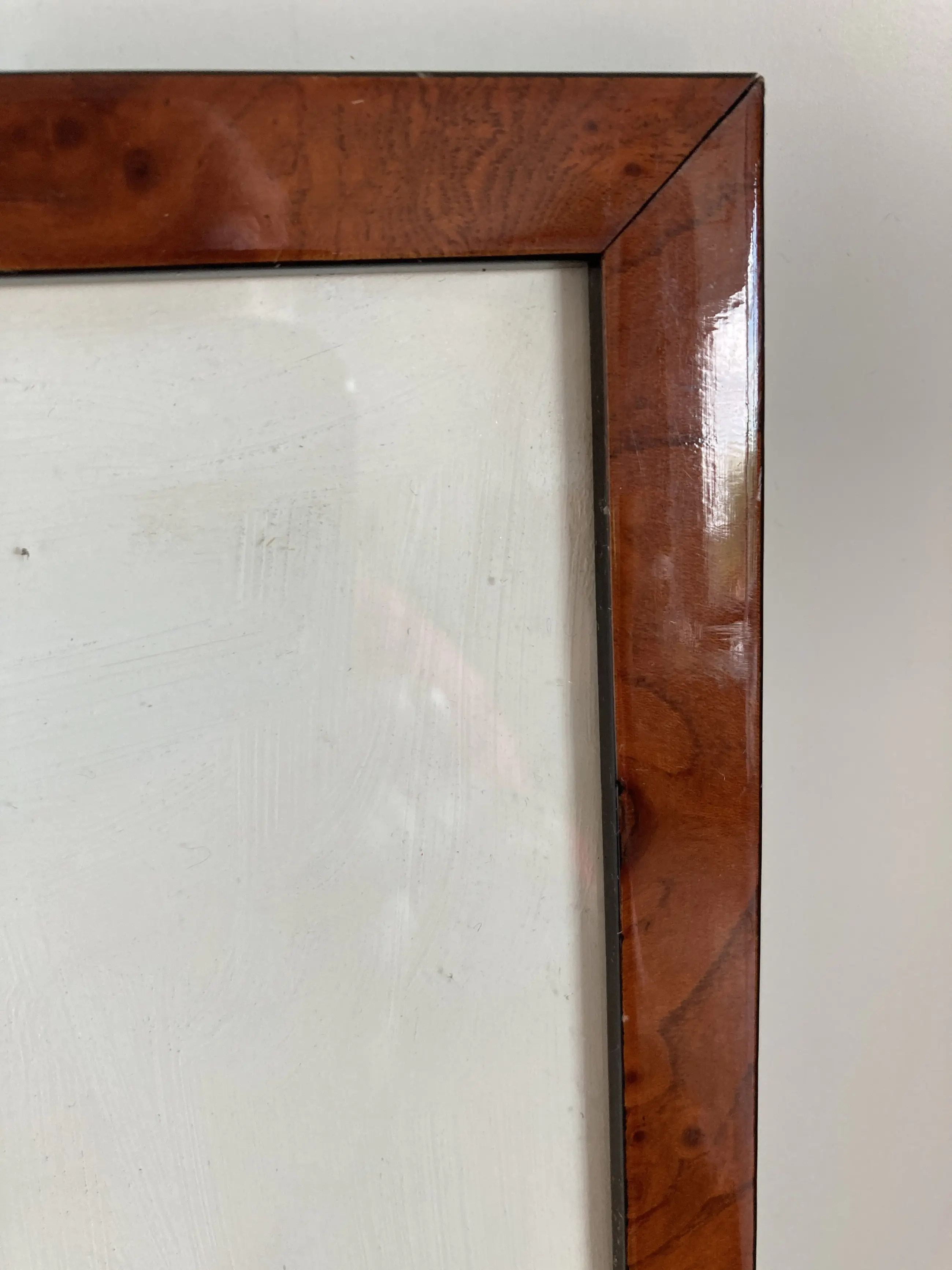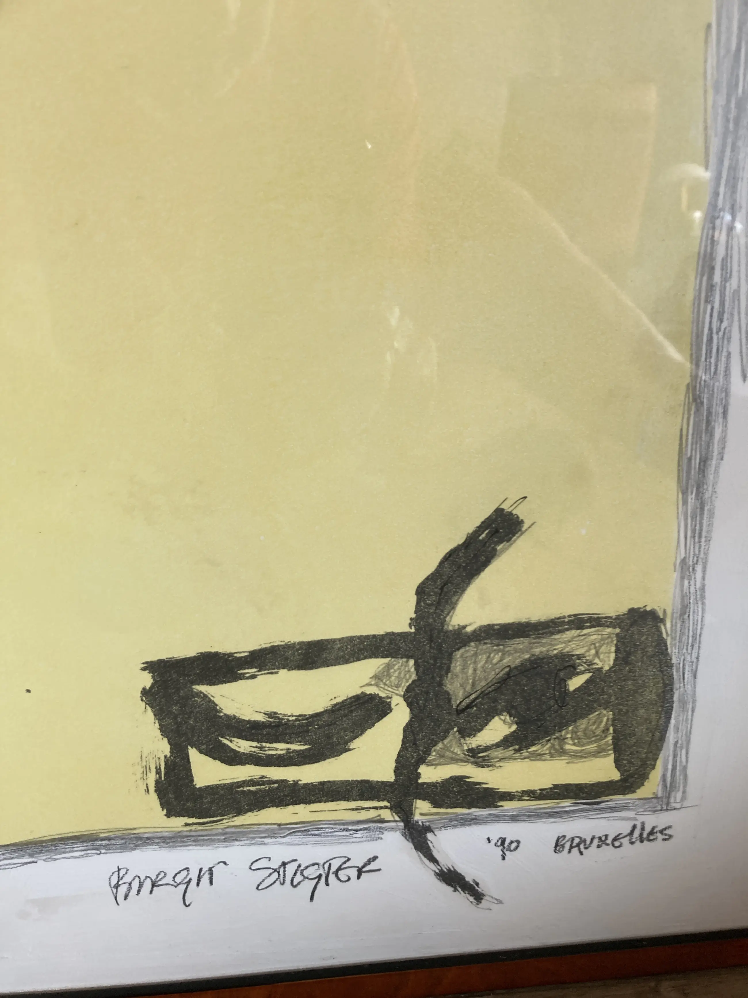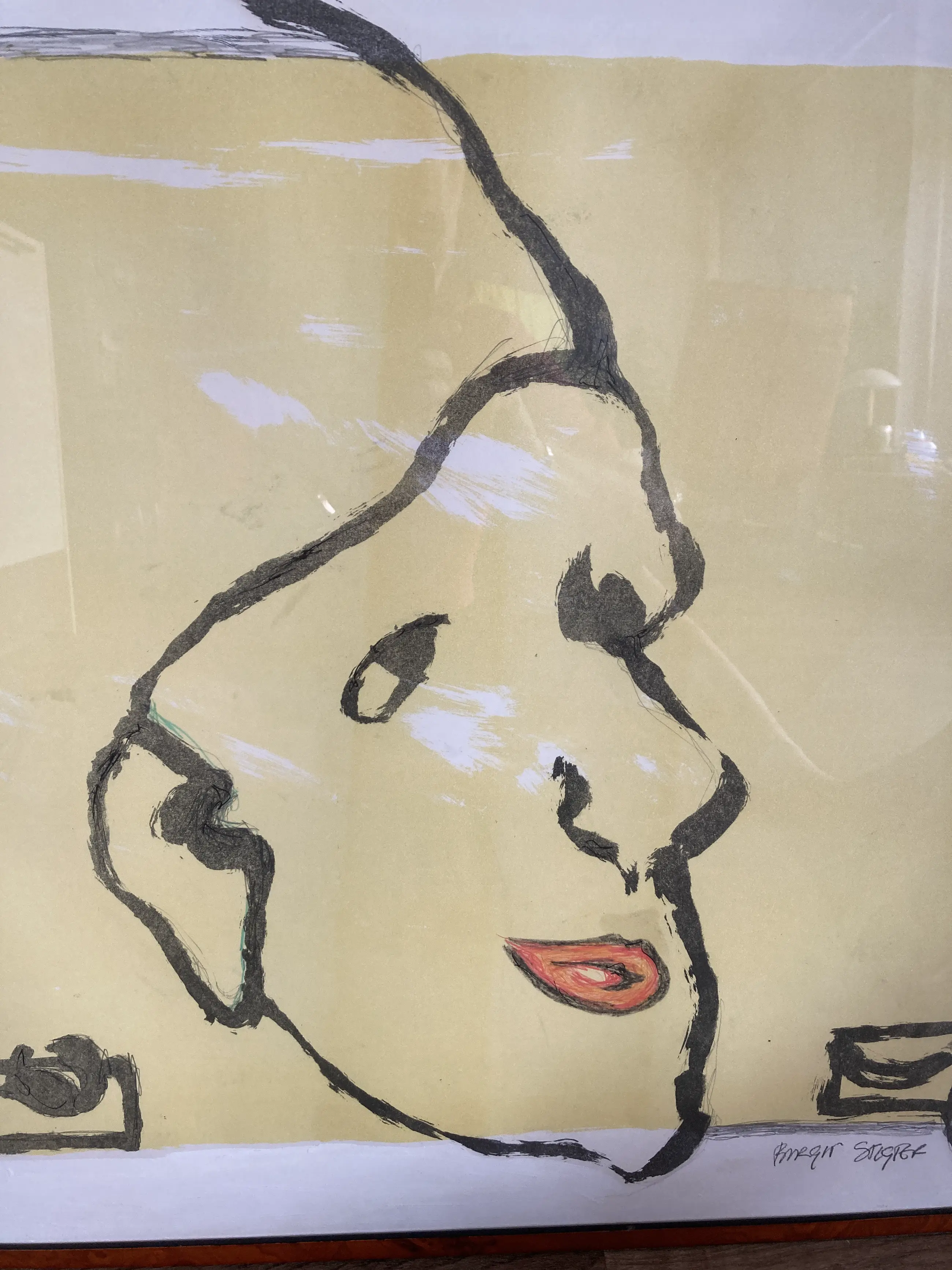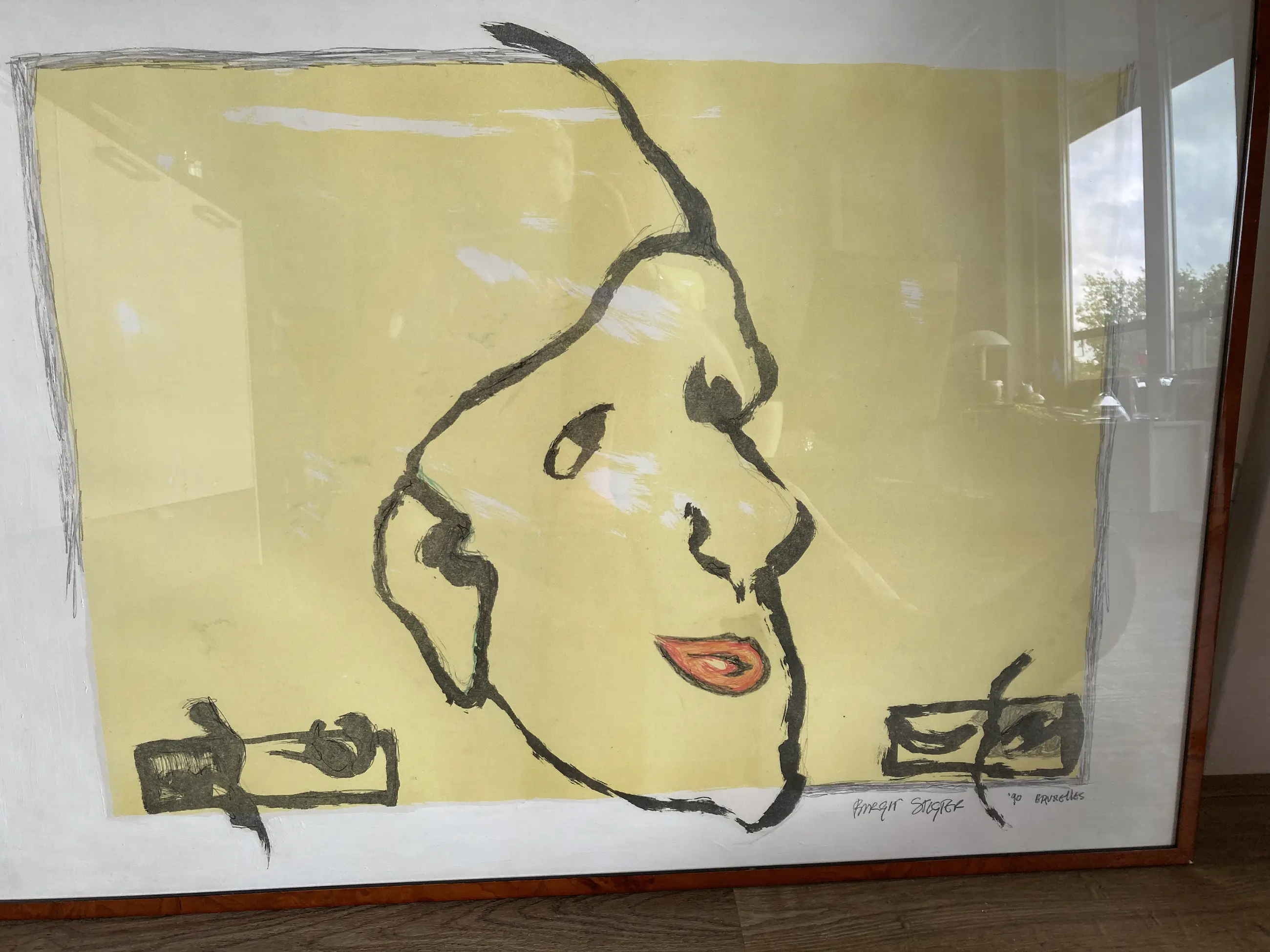 Met de afbeelding van een vrouwen gezicht. Met r.o. Birgit Stigter ‘90 Bruxelles met potlood. Het werk zit in een fraaie houten lijst.