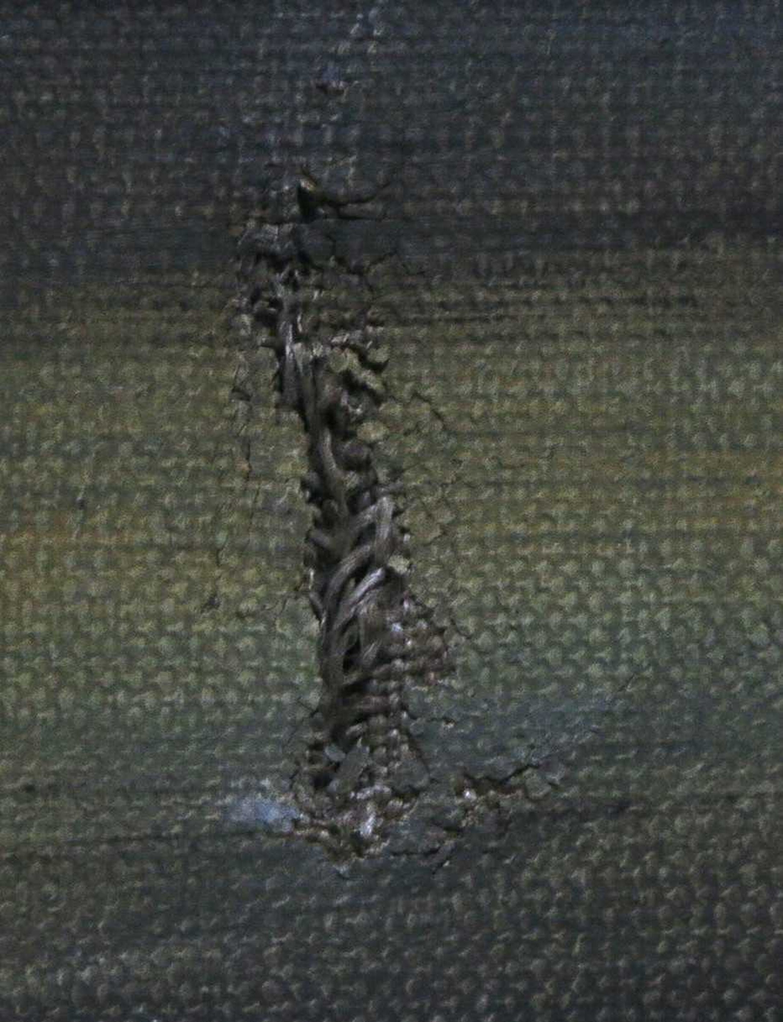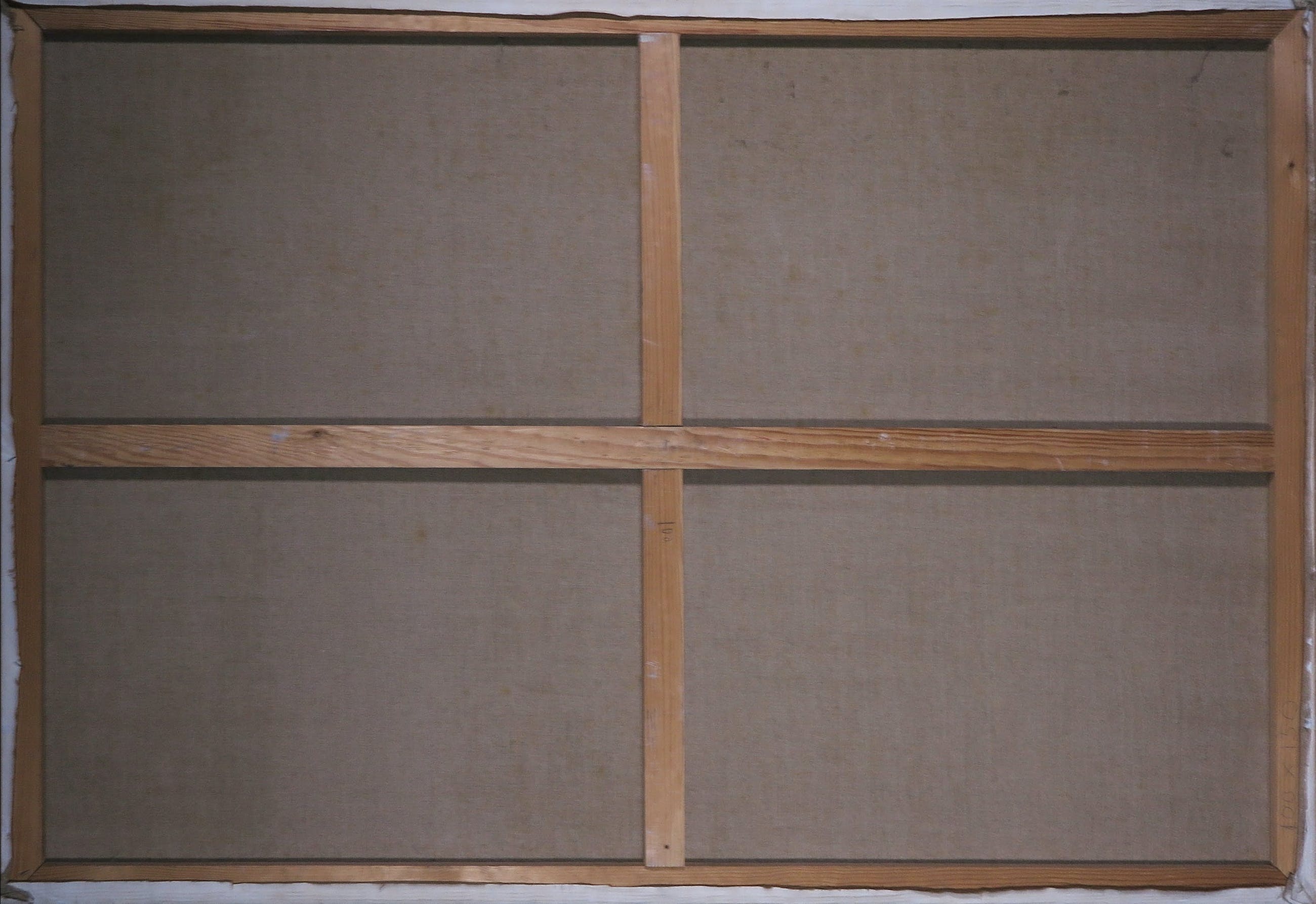 | Het werk heeft een gaatje in het doek onderin Het werk heeft een aan drie kanten een houten omlijsting. | |