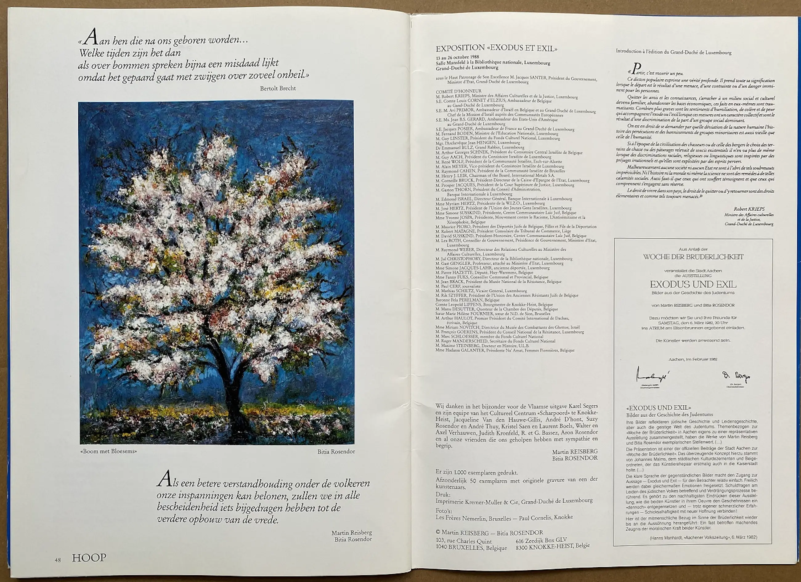In 1990 publiceerde zij samen met Martin Reisberg ter gelegenheid van een tentoonstelling in Cultureel Centrum Scharpoort te Knokke-Heist [B] (23 maart – 23 april 1990) het boek ‘Exodus & Exil’, een pleidooi tegen de oorlog, het exil, het lijden, het vergeten. Dit album werd geïnspireerd door de tragische gebeurtenissen die zich tijdens WOII afgespeeld hebben en vooral het Joodse volk troffen. De tekeningen, grafiek, aquarellen en schilderijen in het boek verwijzen naar aspecten van de Joodse traditie en geschiedenis. Deze tentoonstelling vond eerder plaats in de Stadthalle van Aachen [D] (februari-maart 1982) en in de Salle Mansfield van de Bibliotèque Nationale Luxembourg (13-26 oktober 1988).