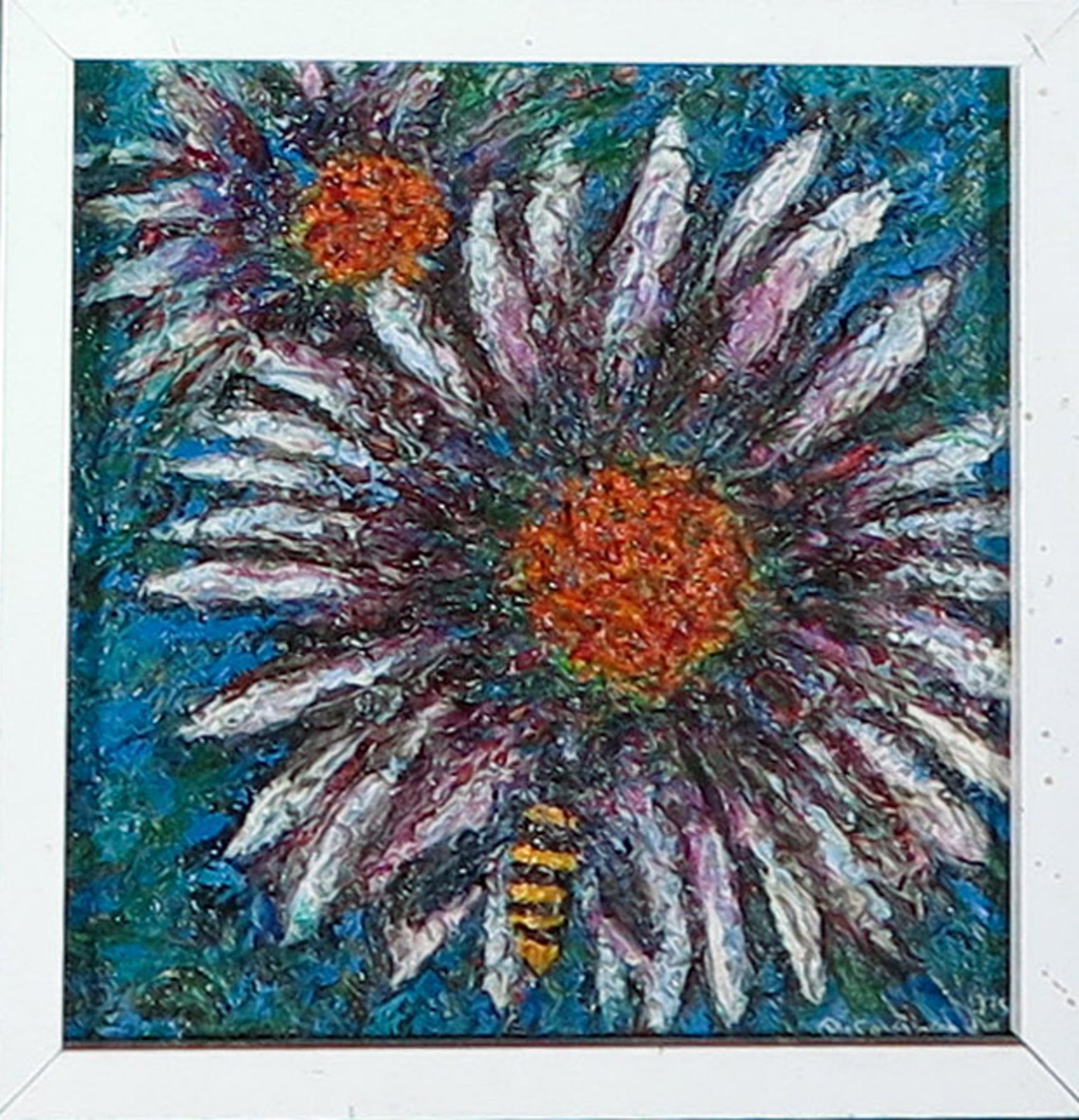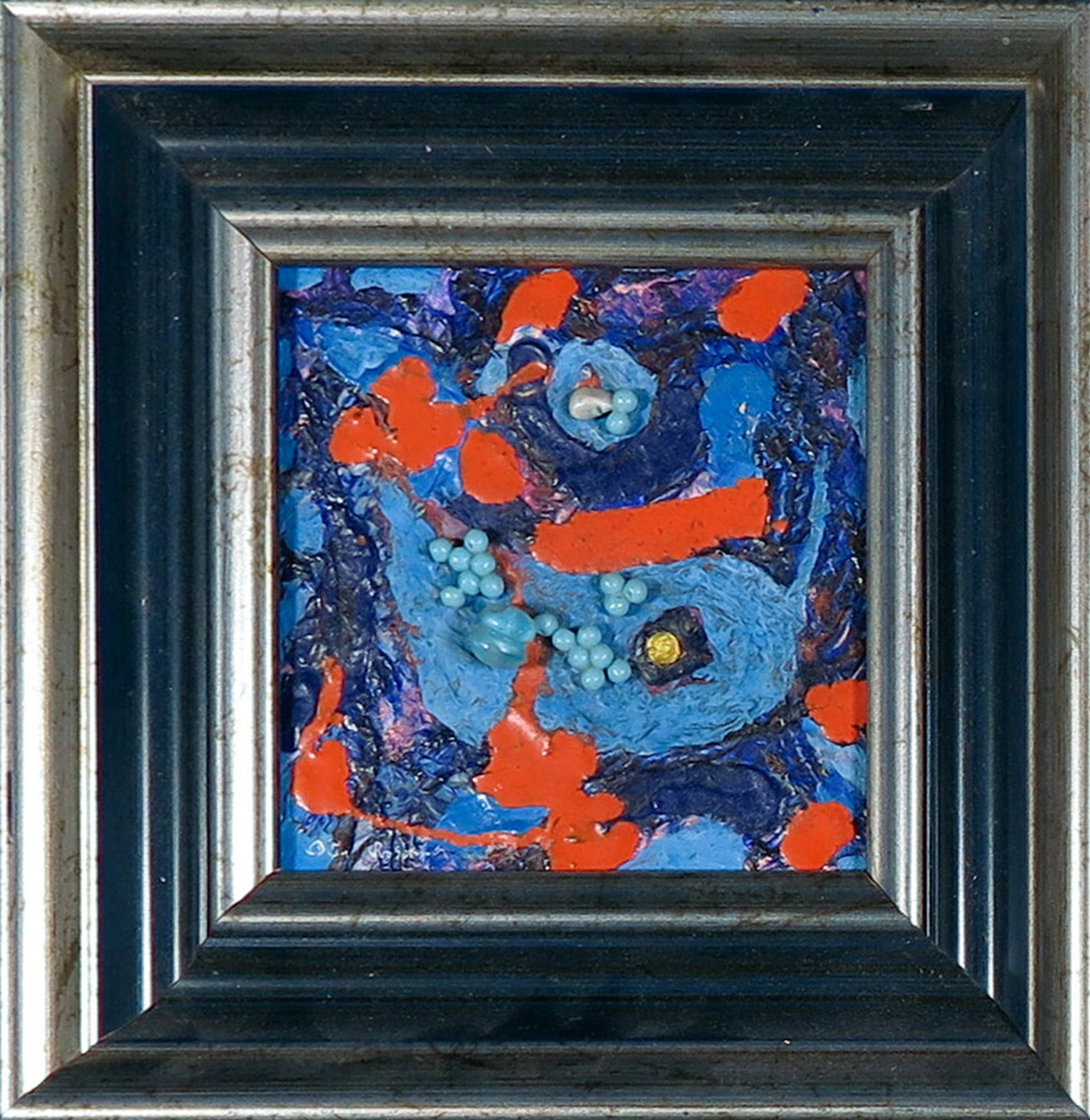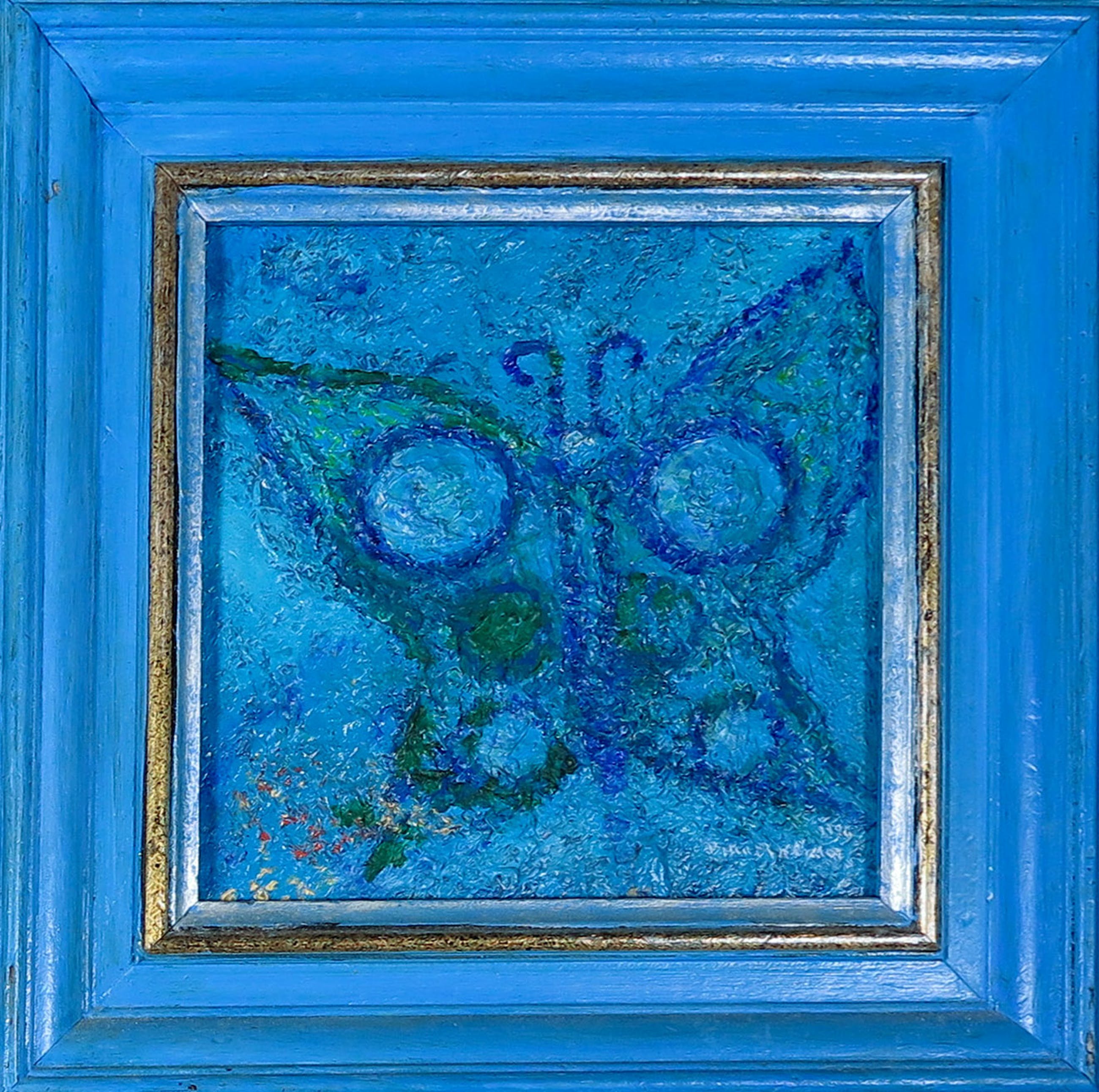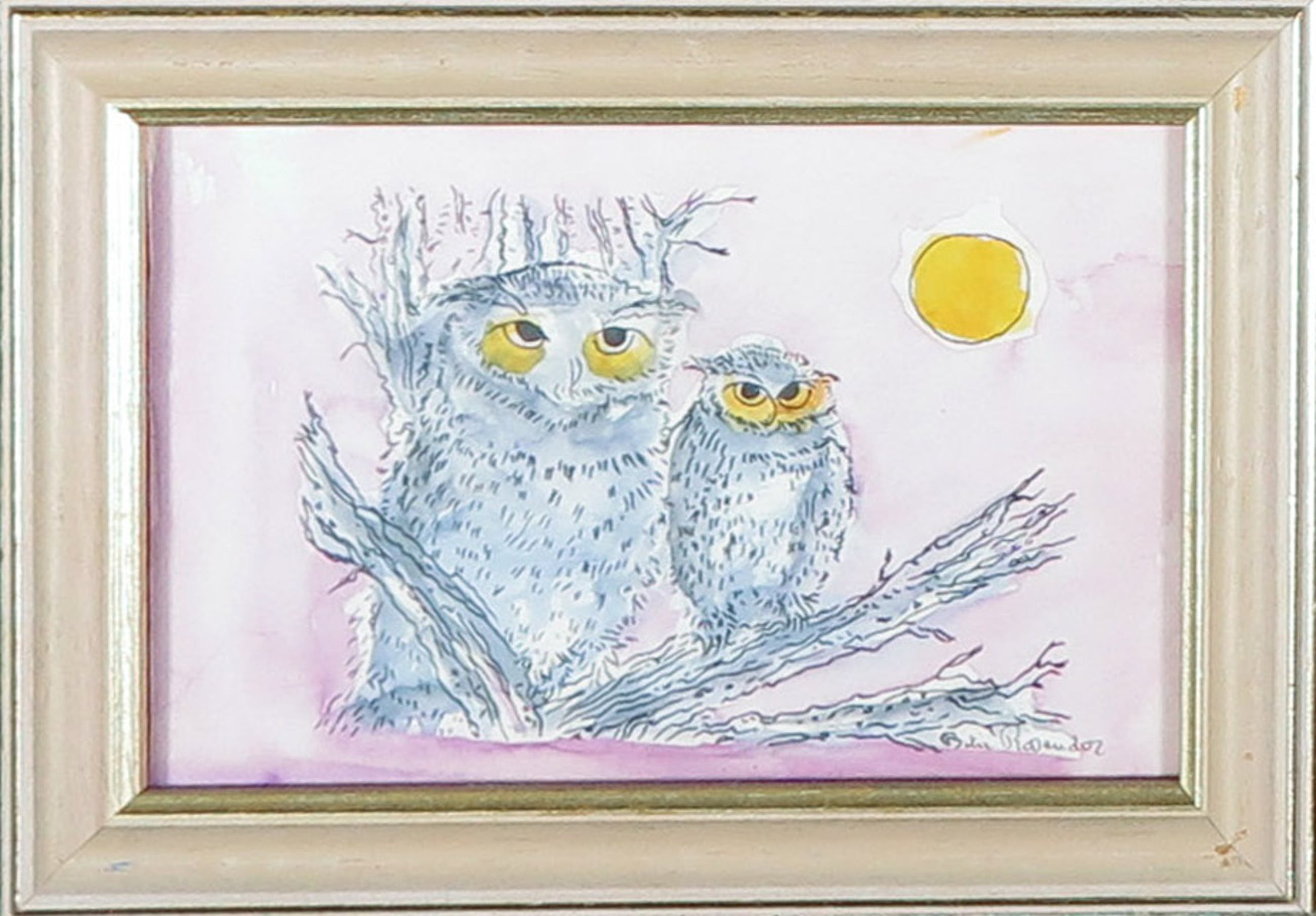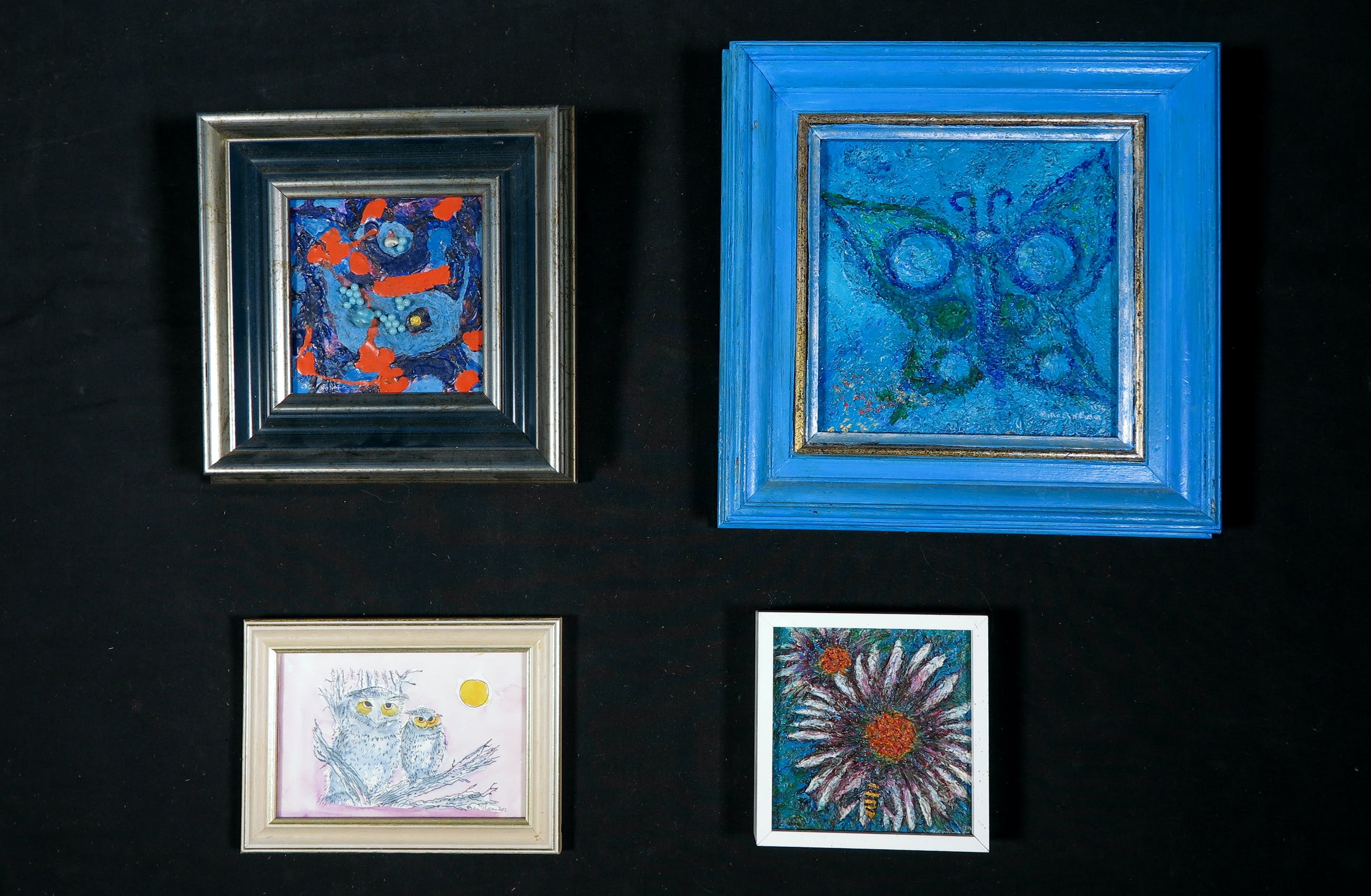 Lot van vier werken van Bitia Rosendor, de vlinder(bovenstaande afmetingen) en de bloem( 12.5x12.5cm) zijn acryl op board, het abstracte werk(20x20cm) is een gemengde techniek en het werk met de uiltjes(13.5x18cm) is een aquarel op papier.