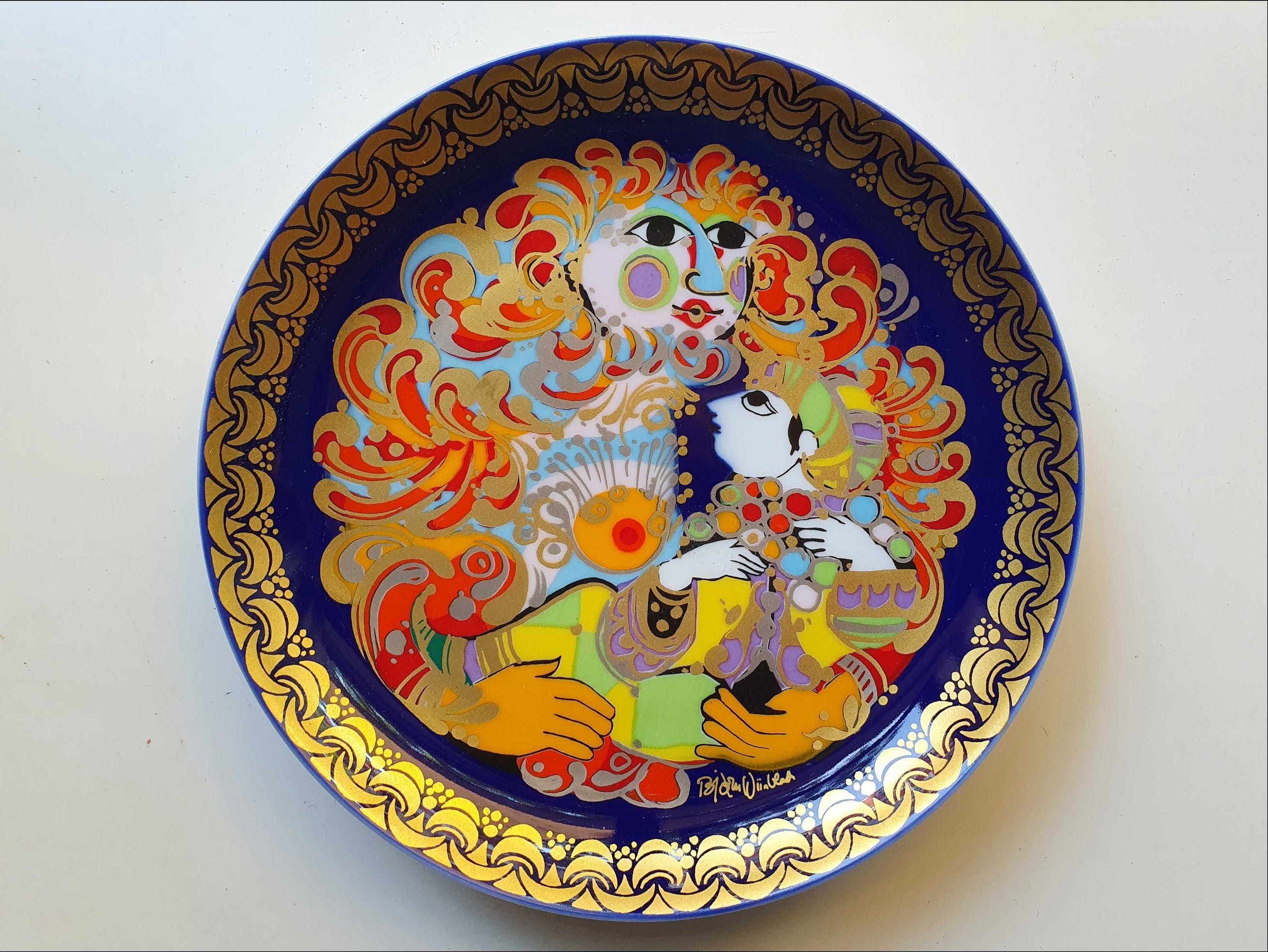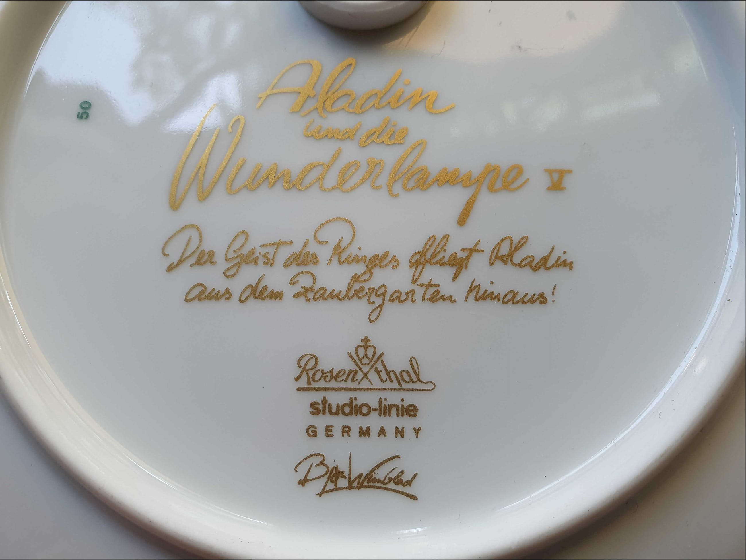 Fraai polychroom gedecoreerd en verguld porseleinen wandbordje uit de Aladdin reeks van Rosenthal. Het ontwerp is van Bjorn Wiinblad. Het gaat hier om nummer V uit de serie.