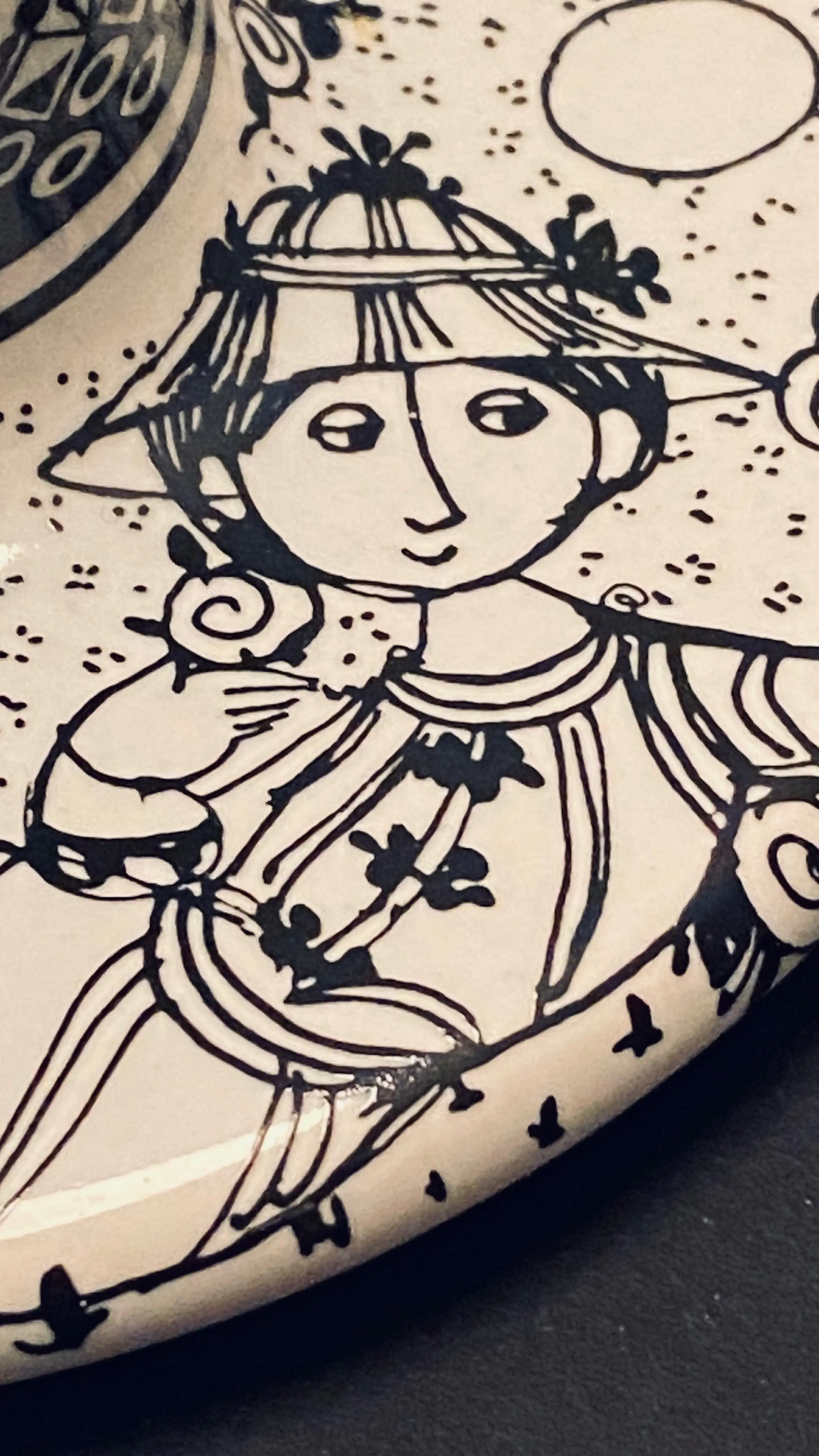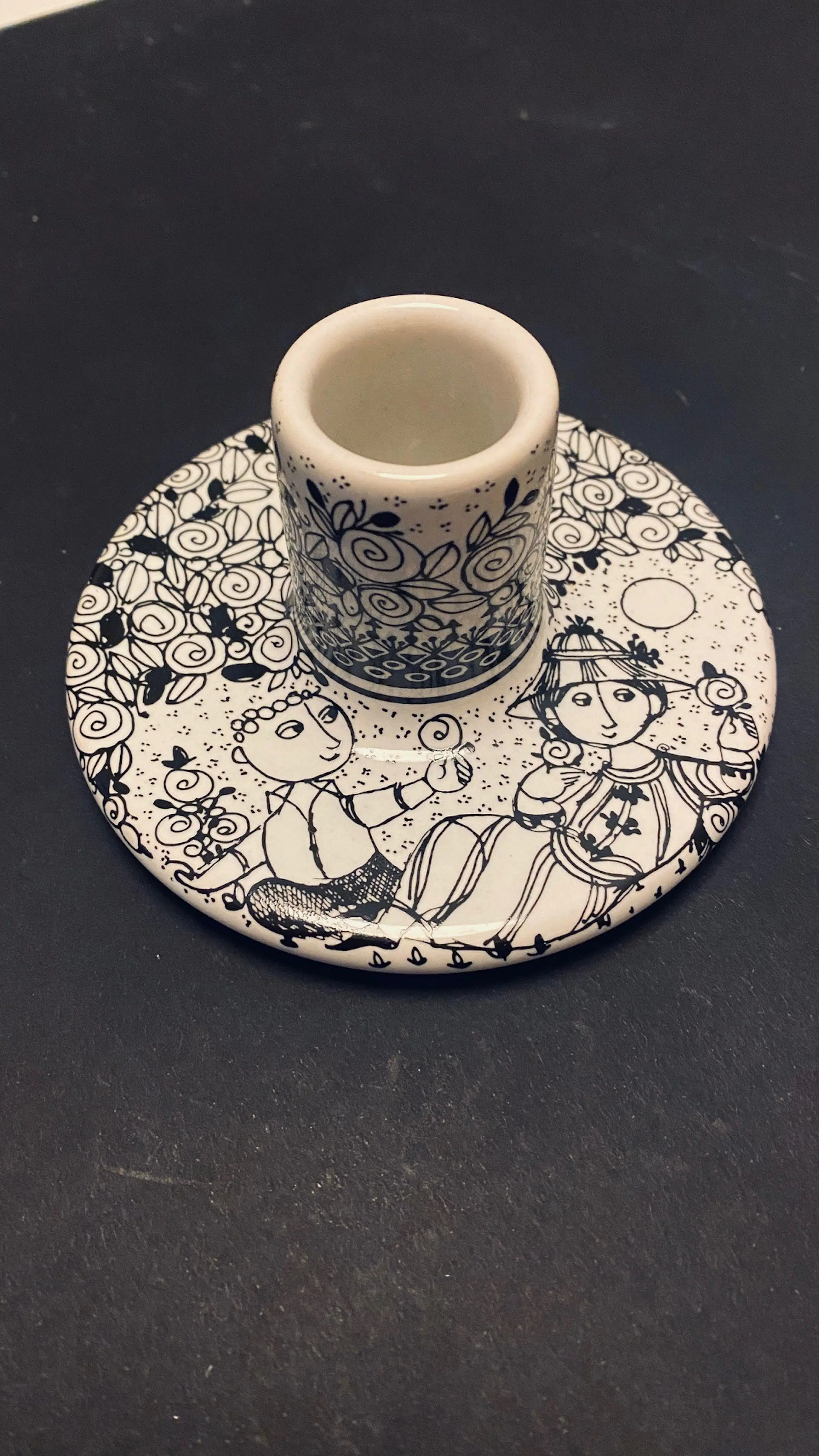Beschrijving: Unieke vintage kaarsenstandaard van de Deense kunstenaar Björn Wiinblad (1918–2006), bekend om zijn speelse en poëtische ontwerpen. Dit exemplaar toont twee gestileerde figuren in een bloemenveld, uitgevoerd in fijne zwarte lijntekening op wit keramiek. De decoratie loopt door op de houder en voet, wat het stuk een harmonieus en artistiek karakter geeft.