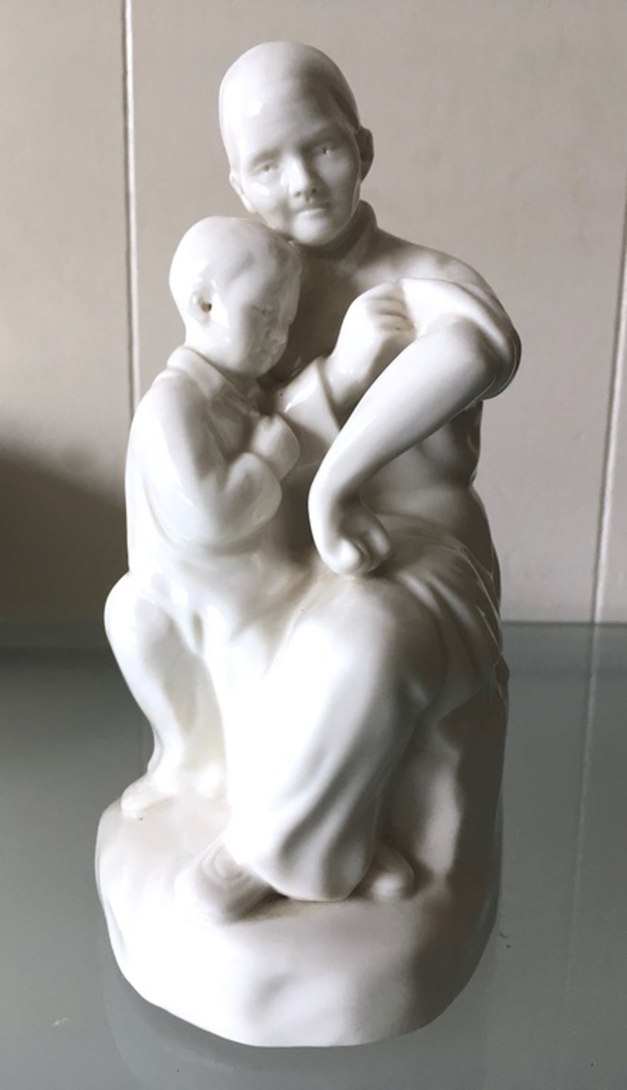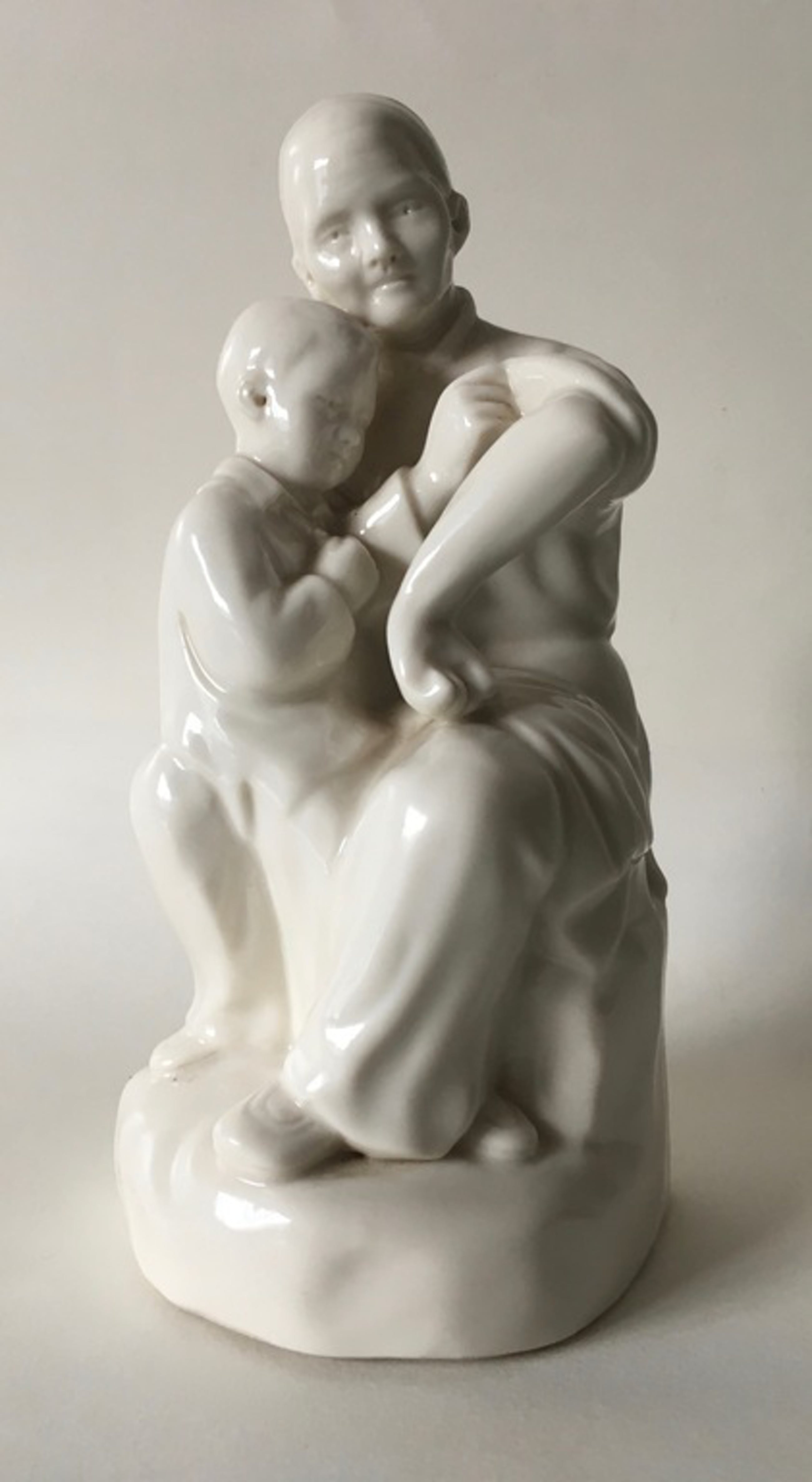 Een uitzonderlijk fijne blanc de Chine porseleinen sculptuur van een moeder met kind. De sculptuur is bijna propagandistisch van aard met een krachtige boodschap van moederschap. Zondermeer een prachtige sculptuur.