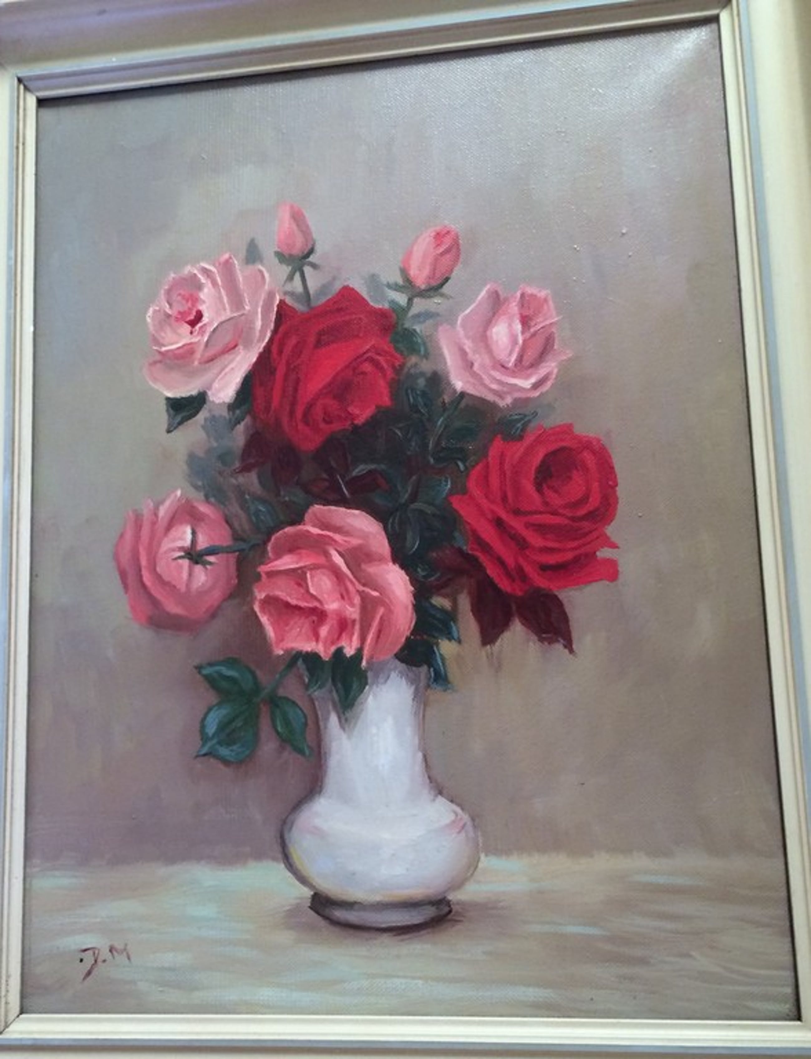 Leuk bloemstilleven op doek : in frisse kleuren algebeelde rozen in vaasje.