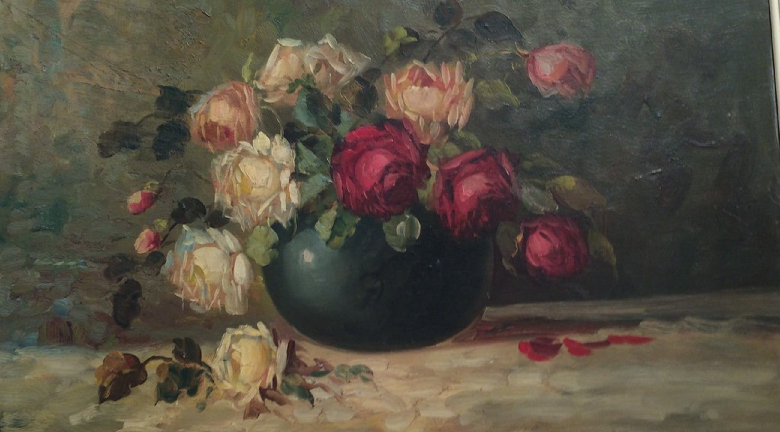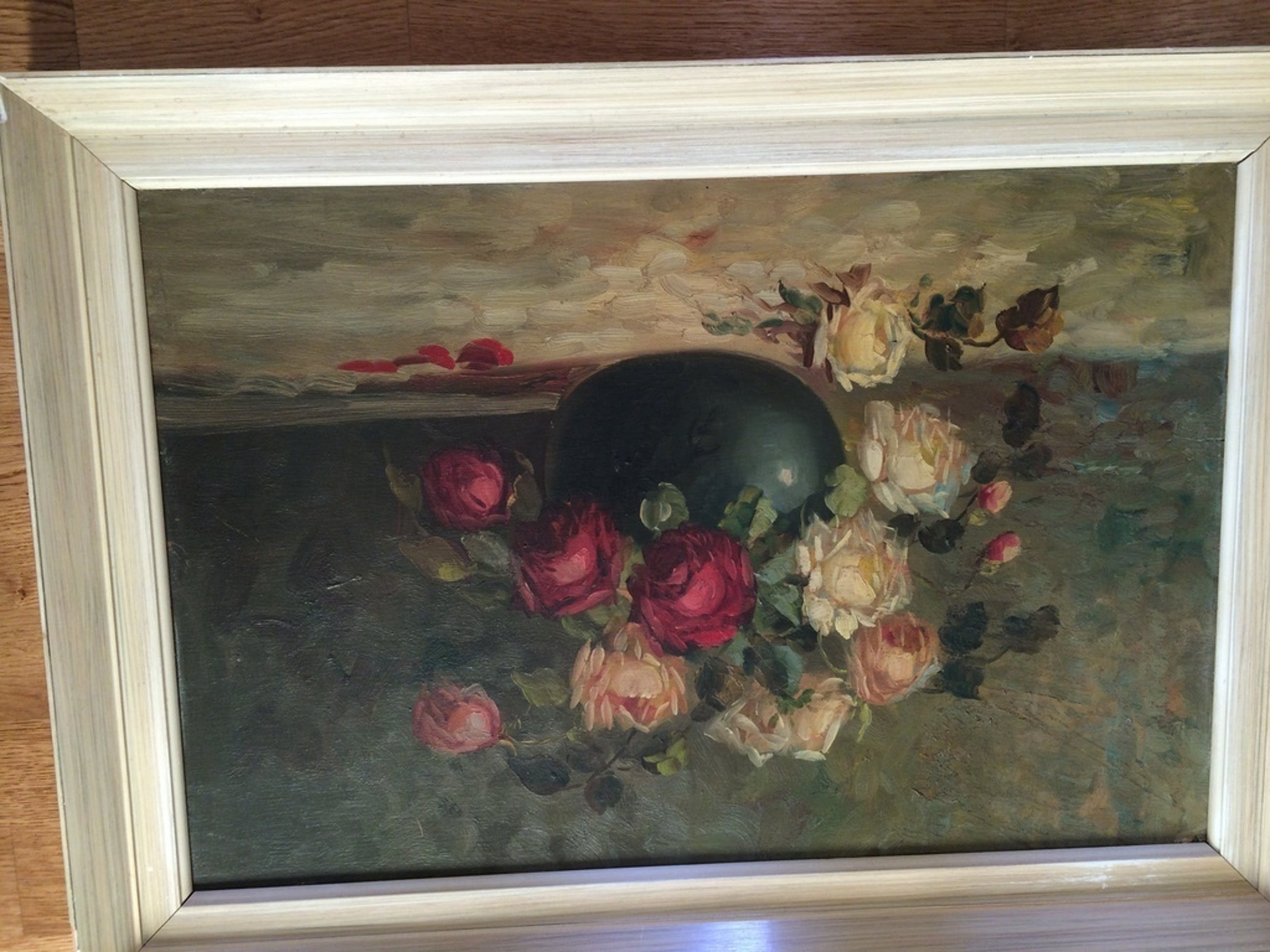 vrij fors bloemstilleven met te vervangen of op te knappen houten lijst;