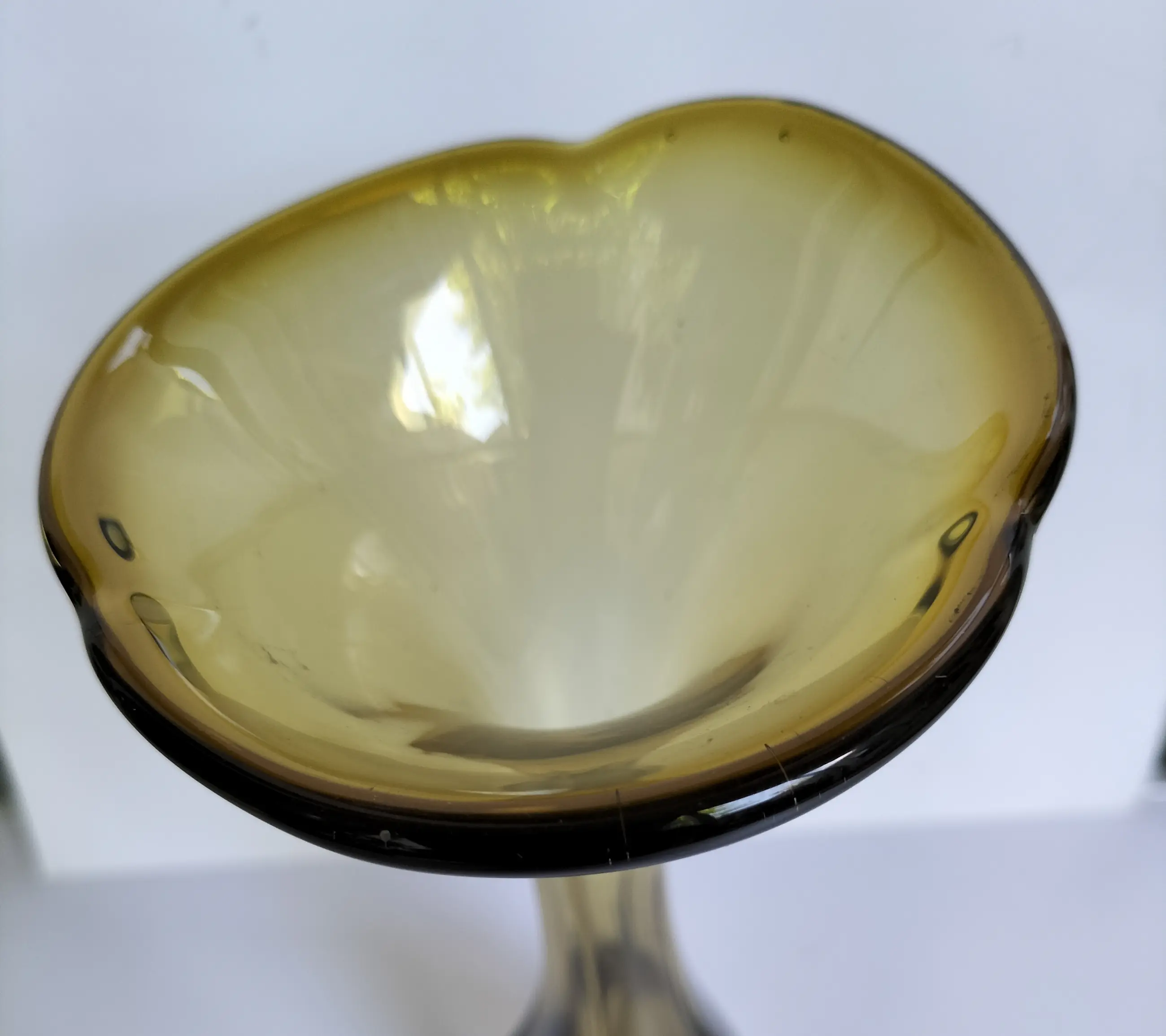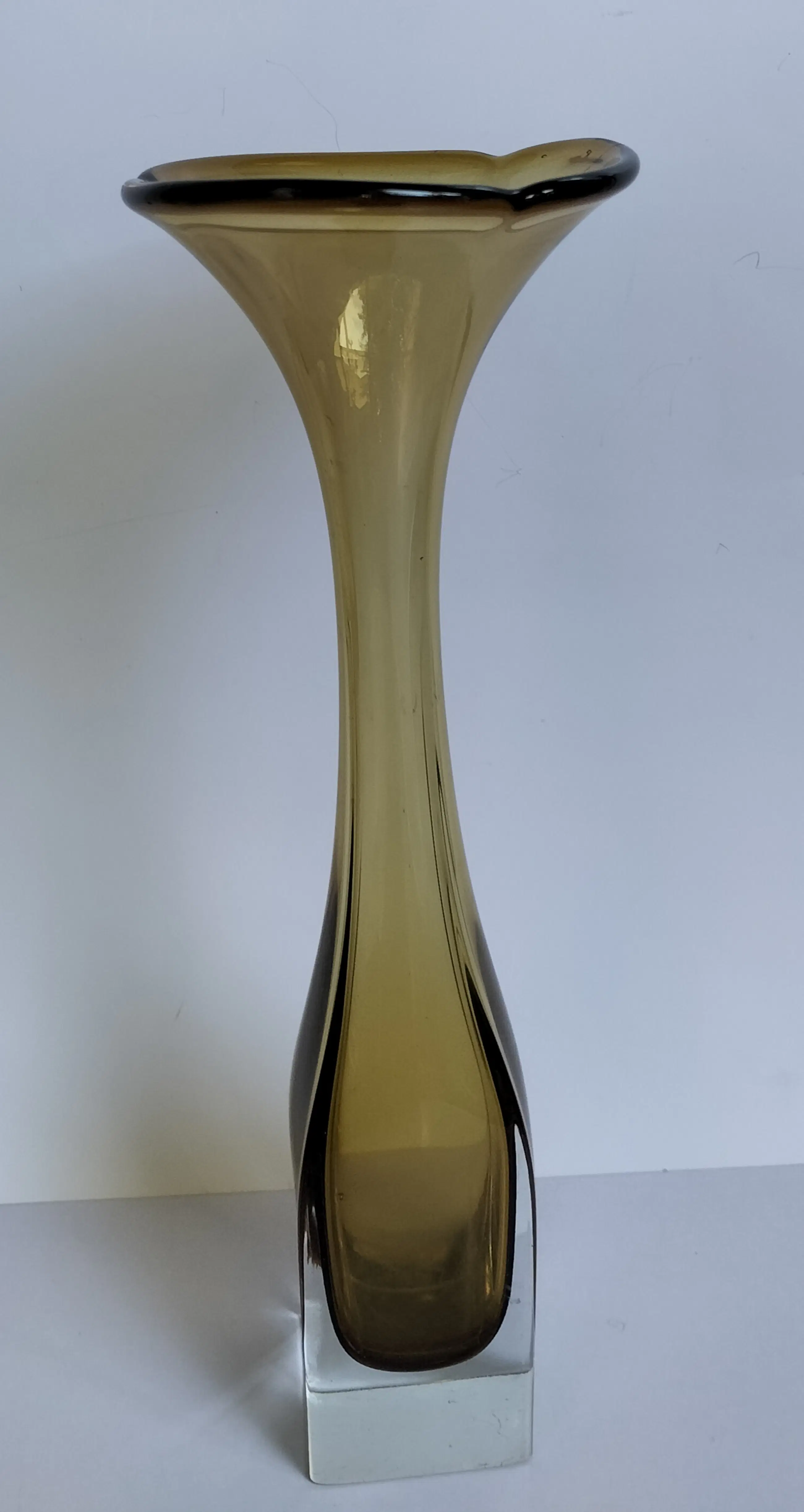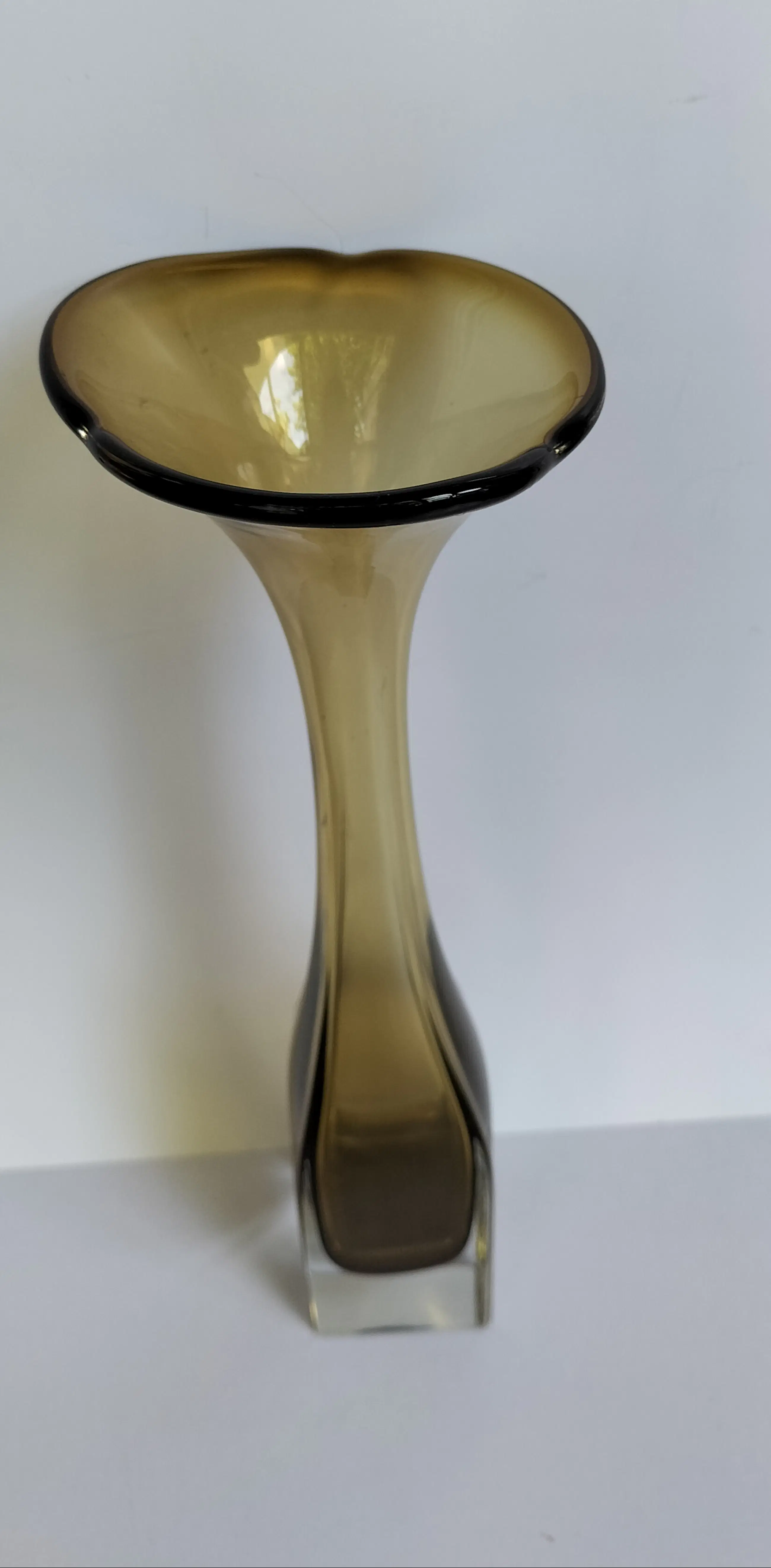 De vaas heeft als voet een vierkant blok, heeft dan een slank middenstuk en loopt naar boven uit in een soort bloemvorm. De vaas is gemaakt in de jaren 60 en vervaardigd van prachtig groen/goud/amberkleurig glas, wat op kunstige manier zijn basis vindt in de transparant niet gekleurde glazen voet.