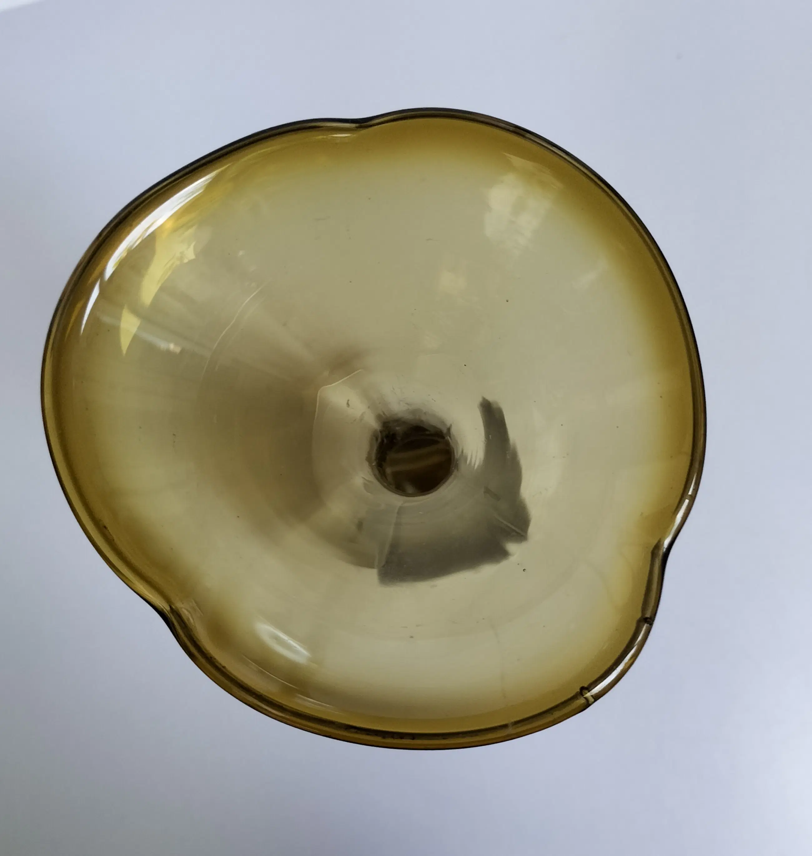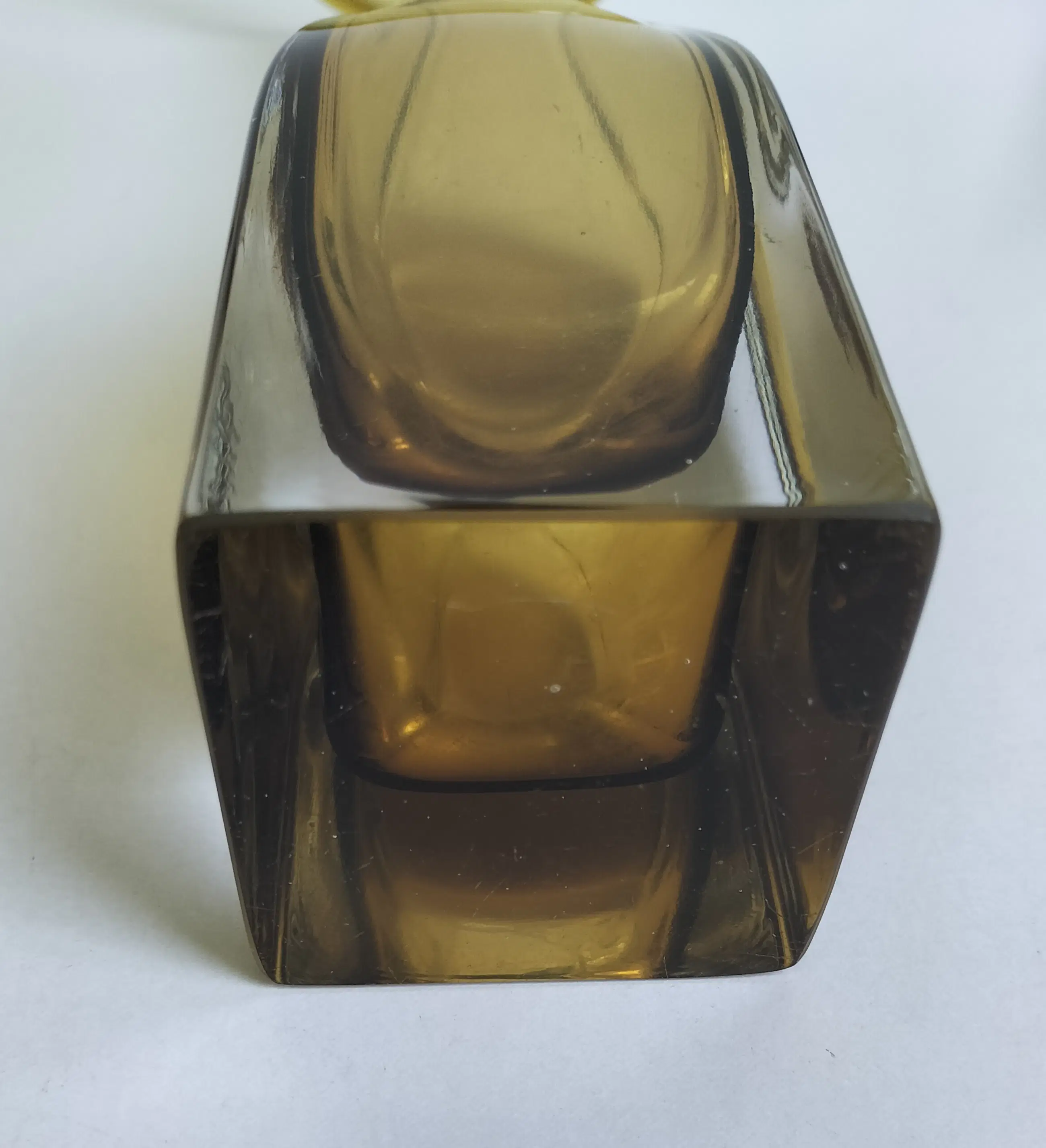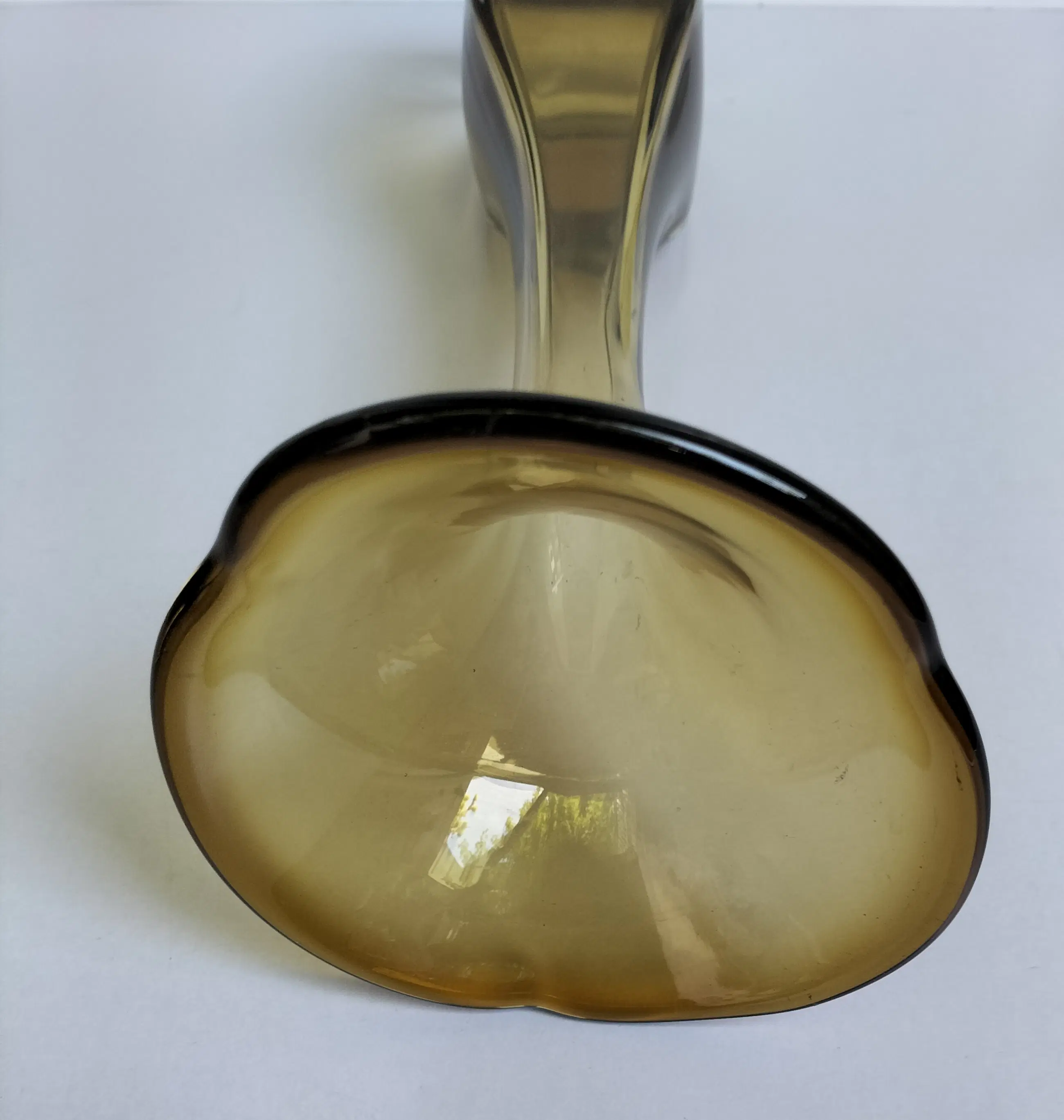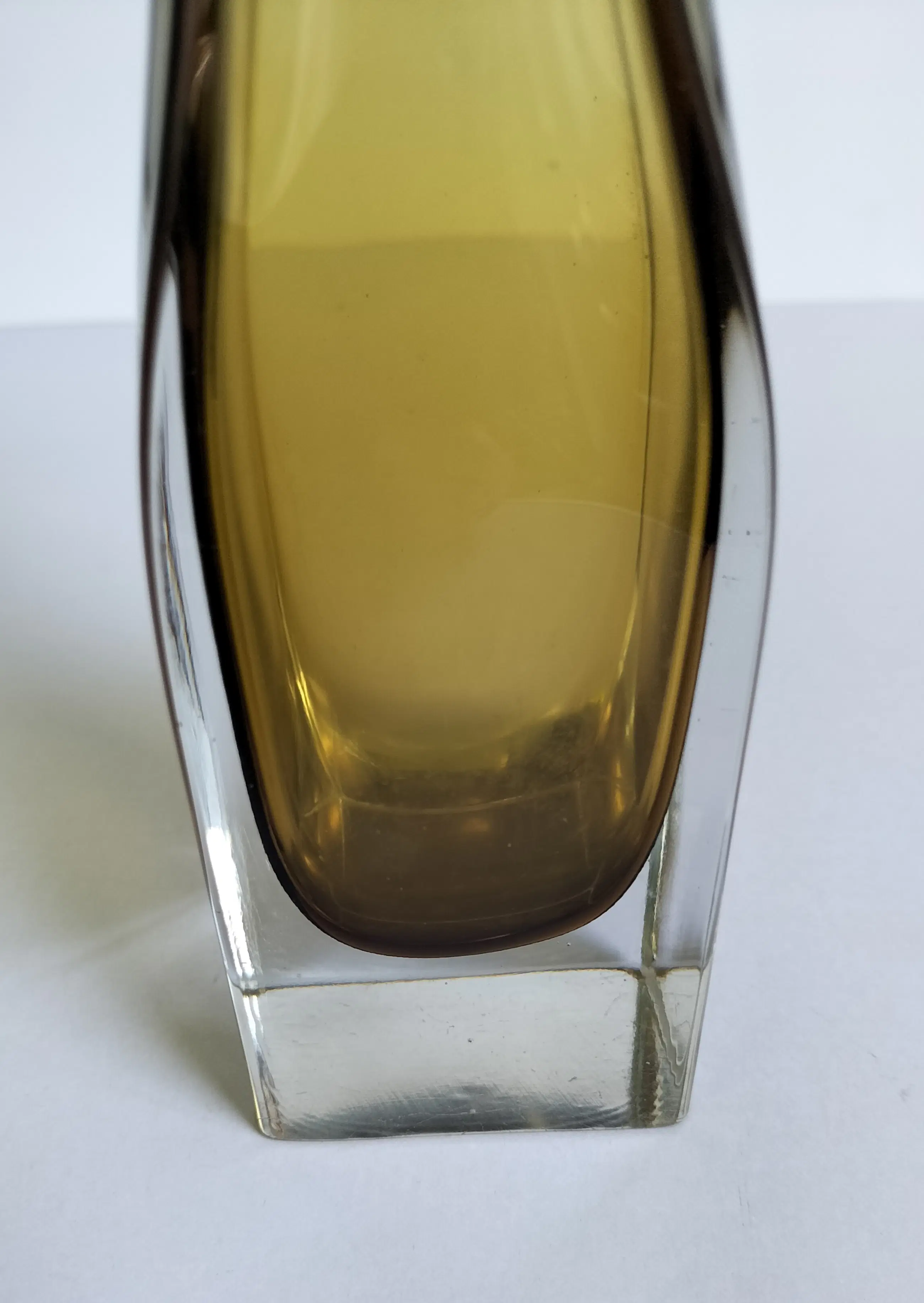 De vaas heeft als voet een vierkant blok, heeft dan een slank middenstuk en loopt naar boven uit in een soort bloemvorm. De vaas is gemaakt in de jaren 60 en vervaardigd van prachtig groen/goud/amberkleurig glas, wat op kunstige manier zijn basis vindt in de transparant niet gekleurde glazen voet.