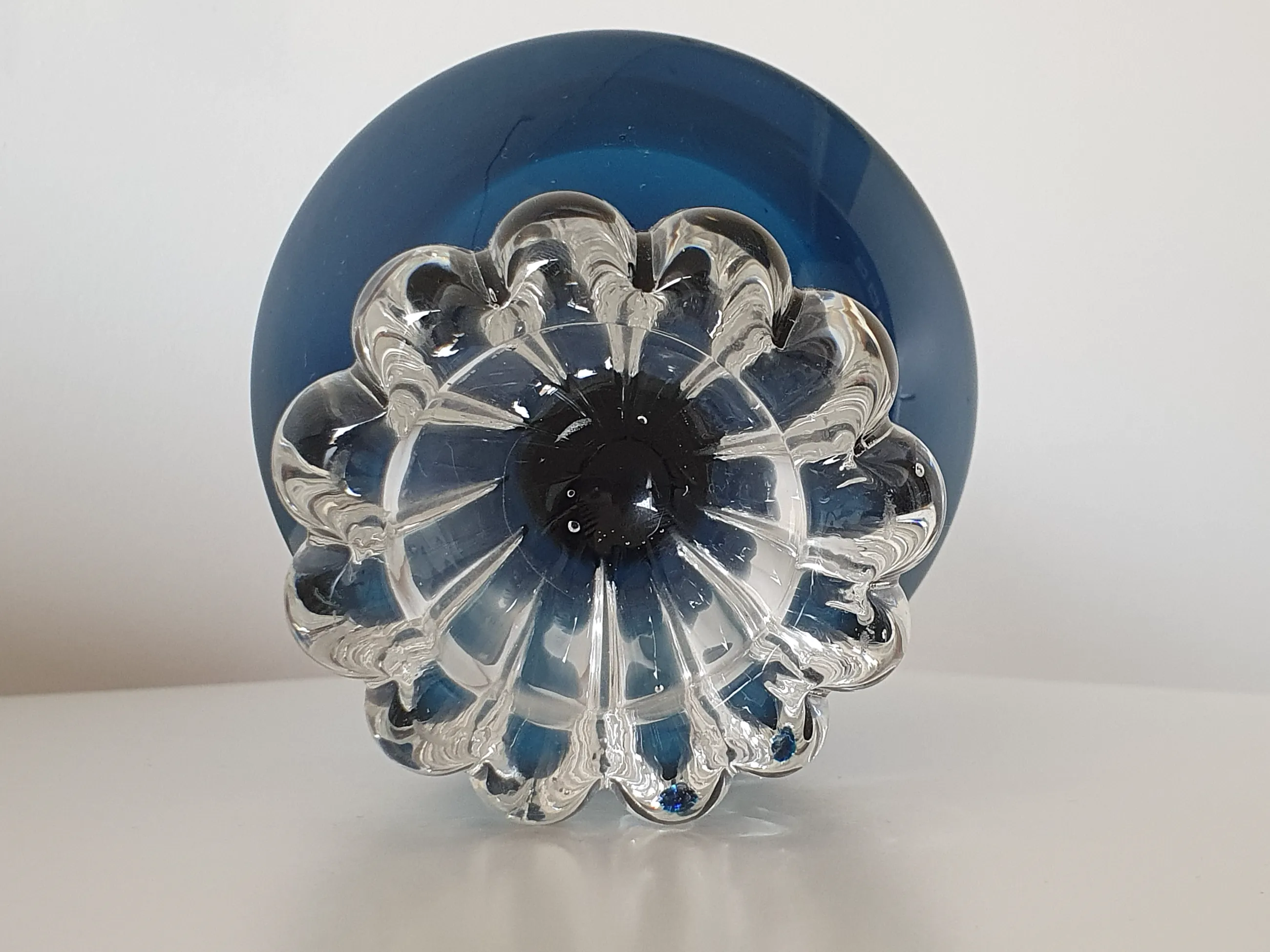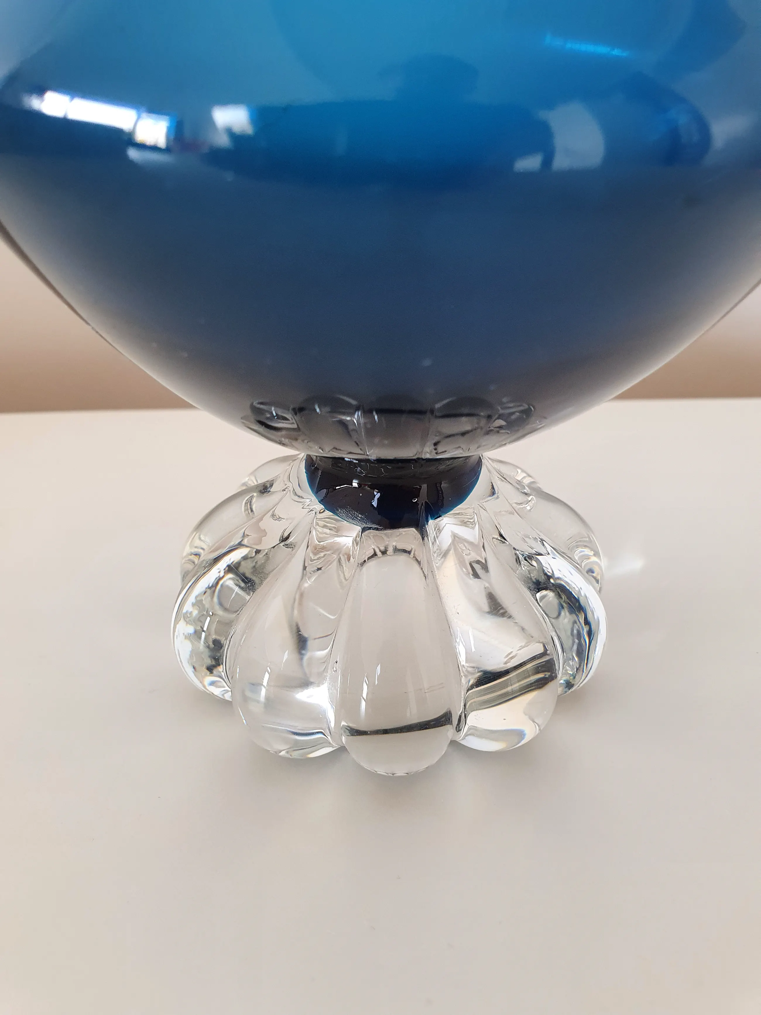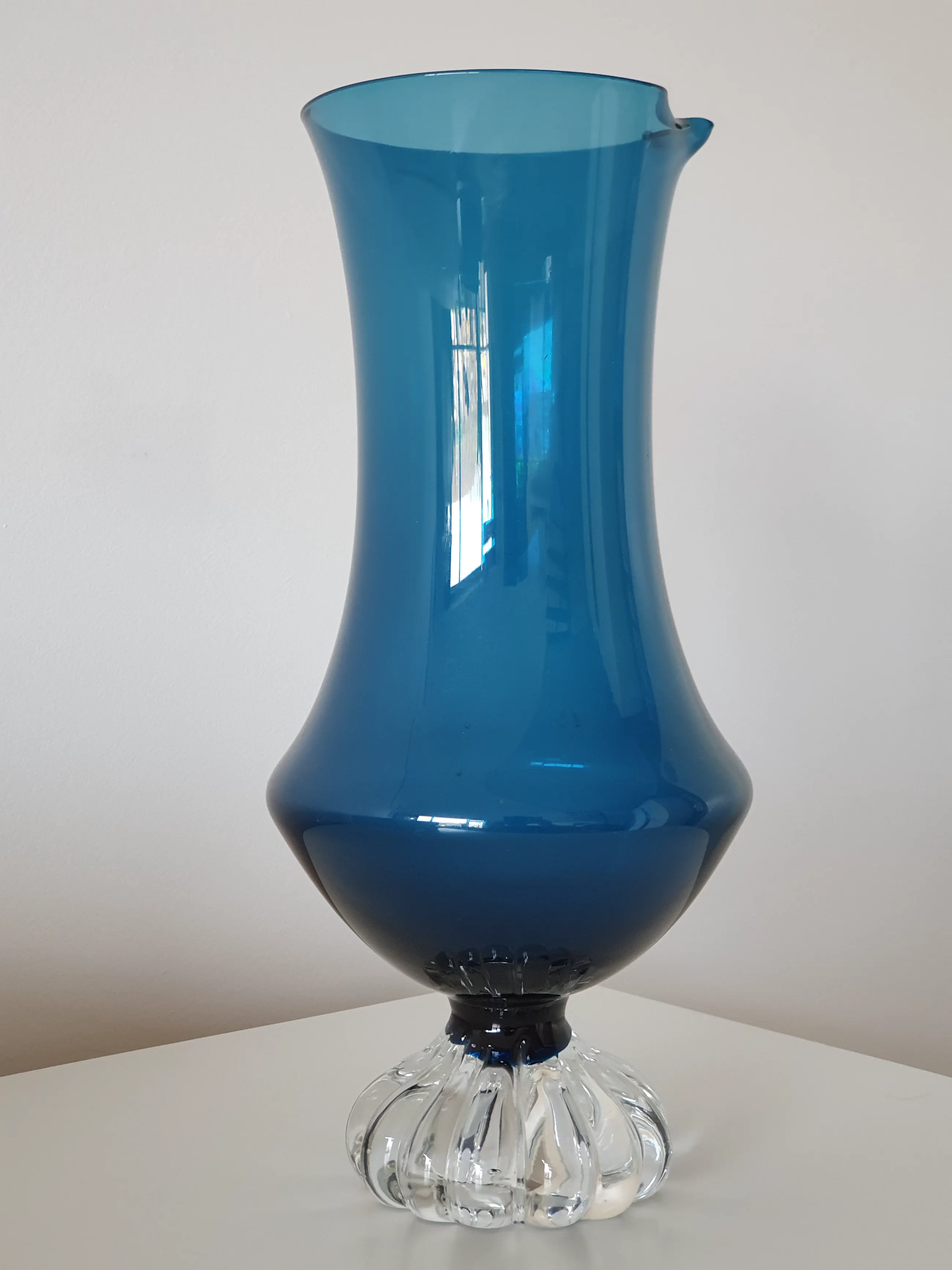 Prachtige Zweedse blauwe glazen schenkkan met heldere voet, ontworpen door Bo Borgstrom voor Aseda Glasbruk. De heldere glazen geribbelde voet is typerend voor andere Aseda-ontwerpen, waarschijnlijk uit de jaren 60 en 70. Oorspronkelijk is dit onderdeel van een set met zes blauwe glaasjes met vergelijkbaar voetje.