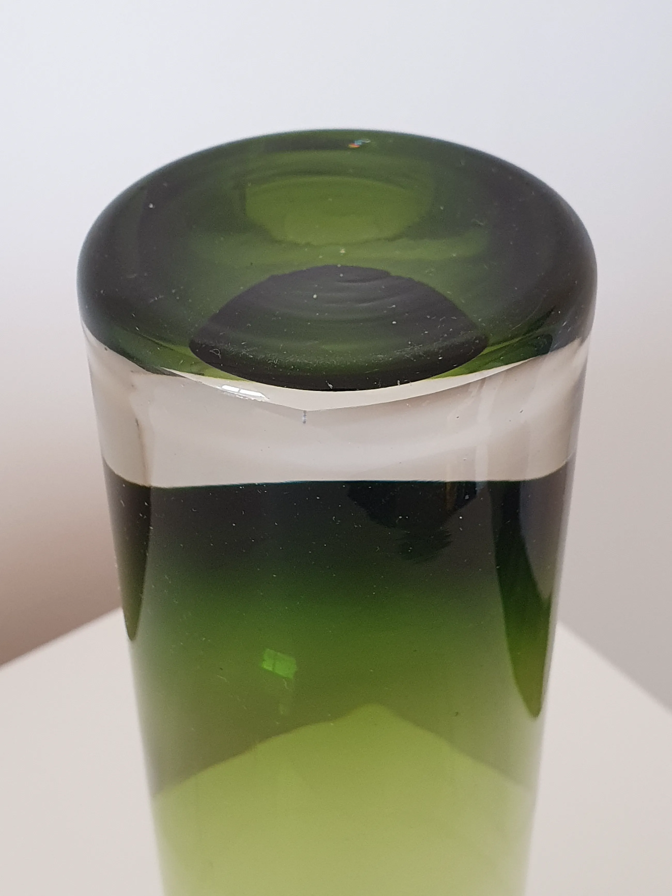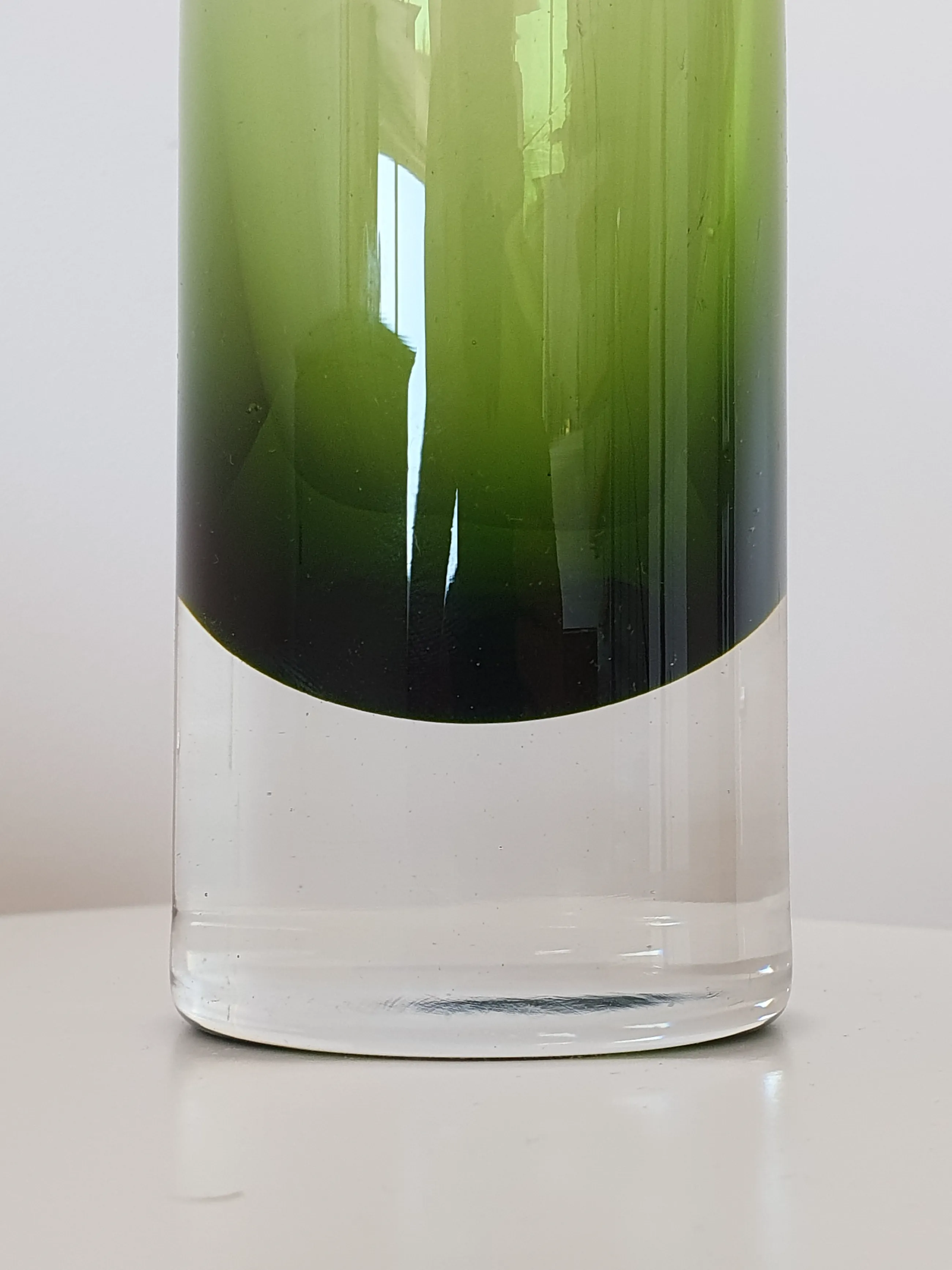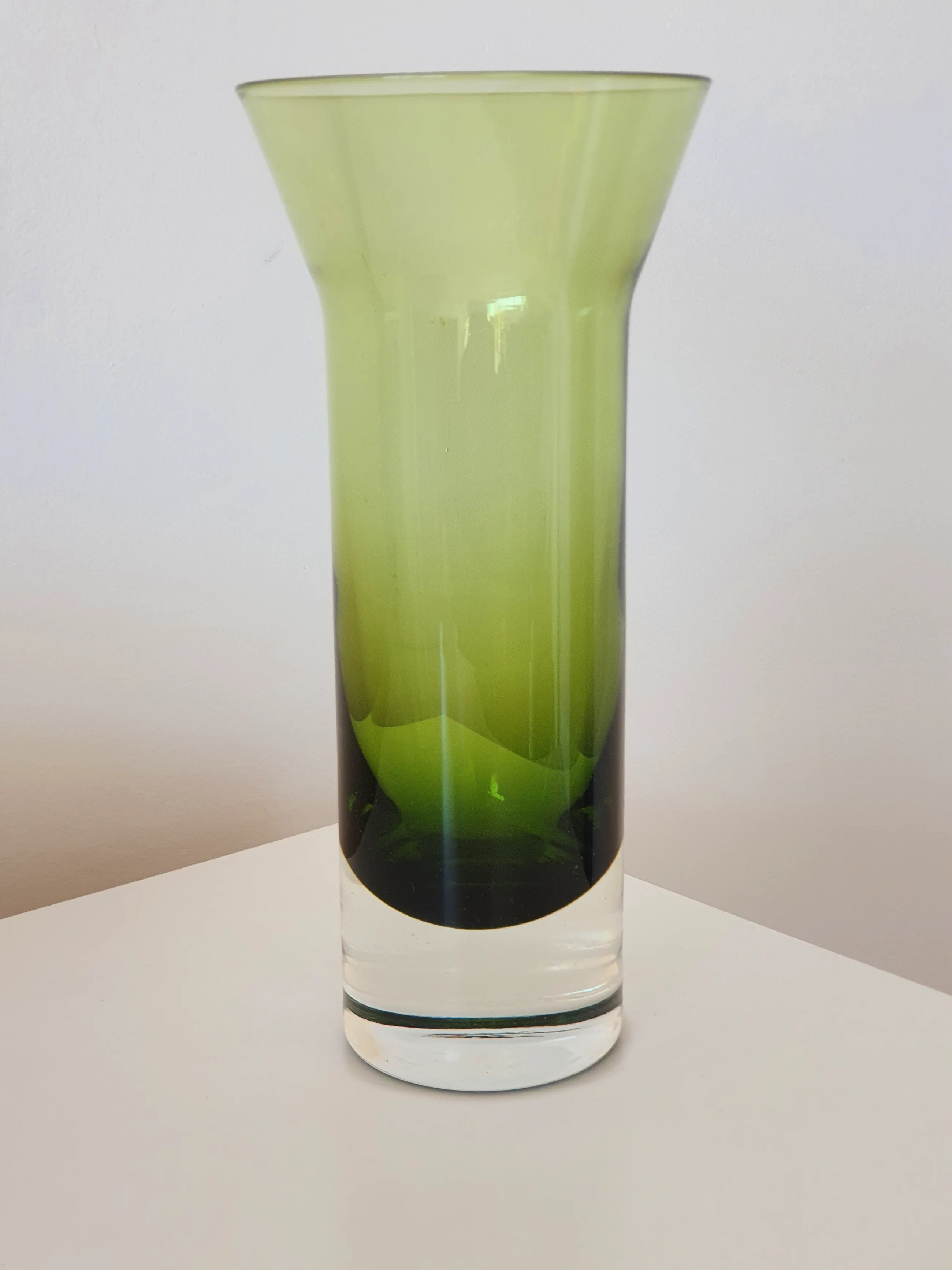 Deze iconische vaas van Bo Borgström met de vorm van een watertoren, in groen glas aan de bovenkant, helder glas aan de voet en in een zeer moderne uitvoering. Het werd in de jaren zestig ontworpen door Bo Borgström en vervaardigd in de glasfabriek van Åseda. Iconisch Zweeds design uit het midden van de 20e eeuw!