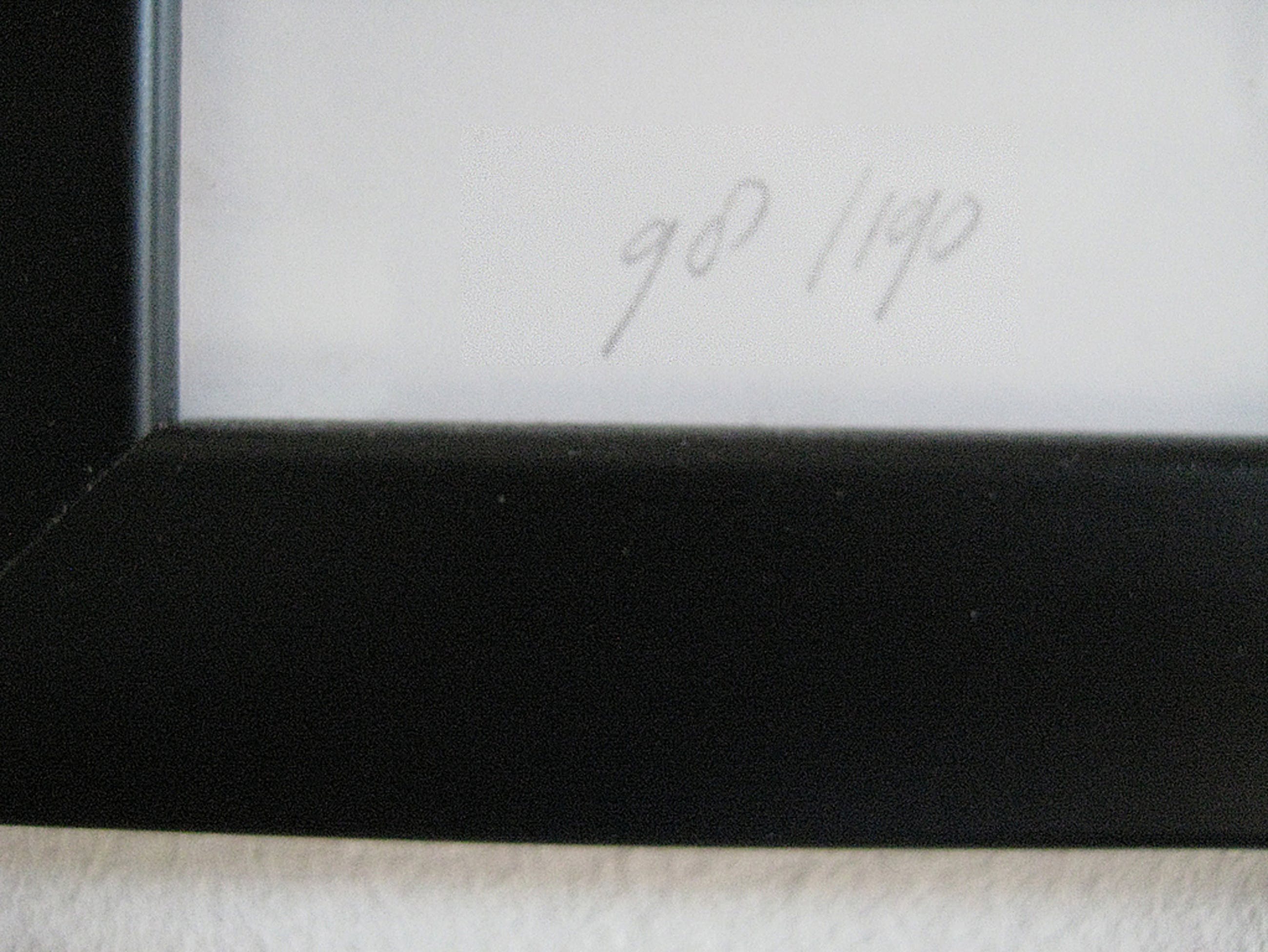 Ingelijst (achter glas, zwart houten lijst) 68 x 68 cm. Beeld 63,5 x 63, 5 cm. In potlood gesigneerd rechtsonder: Bonies '73. In potlood linksonder 98/190. Perfecte staat.
