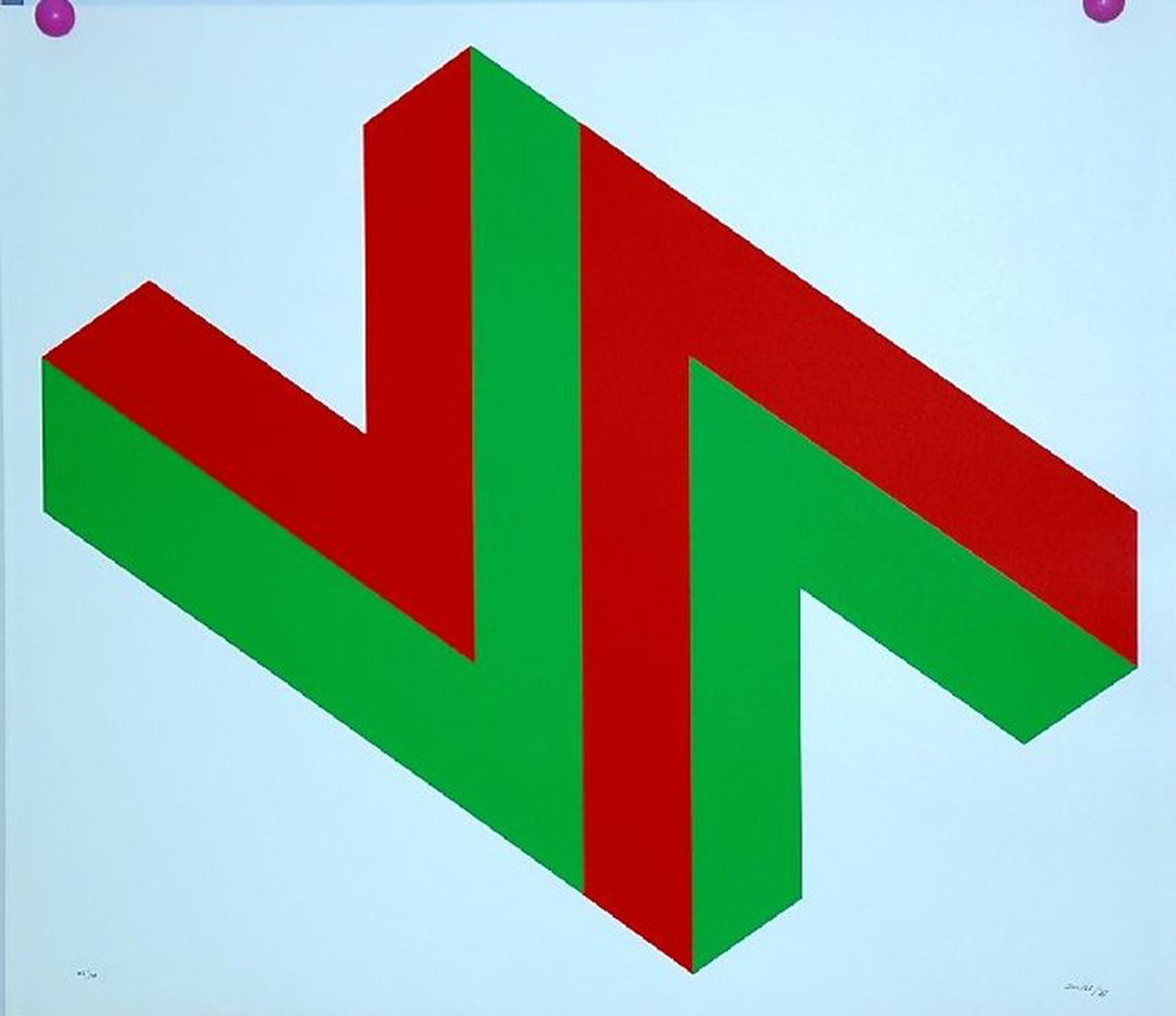 Mooie abstracte zeefdruk in twee kleuren (rood en groen) van Bob Bonies. Deze kleuren zijn gewoon mooi egaal (foto op beeldscherm kan wat vertroebeling geven, door het comprimeren van de foto)