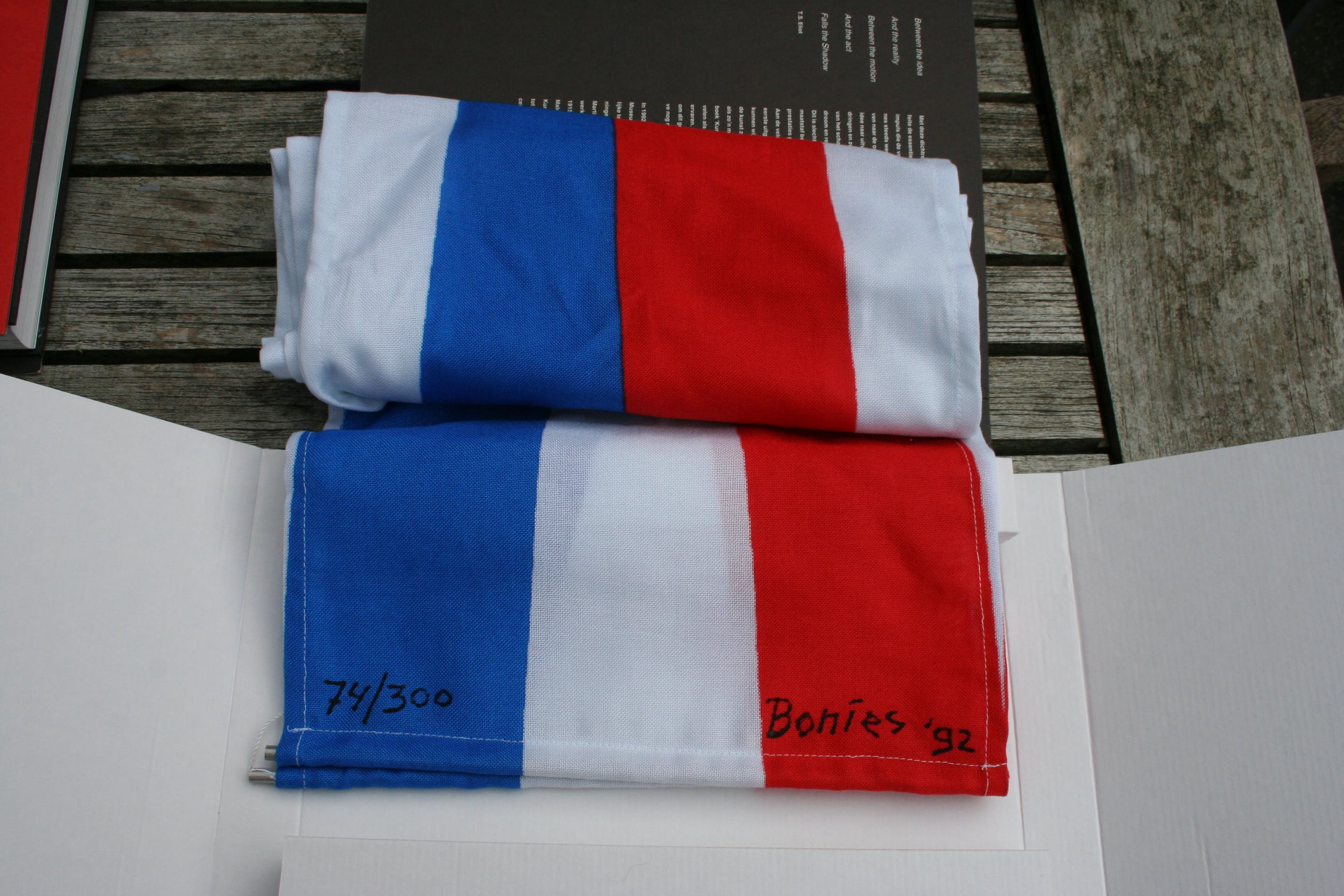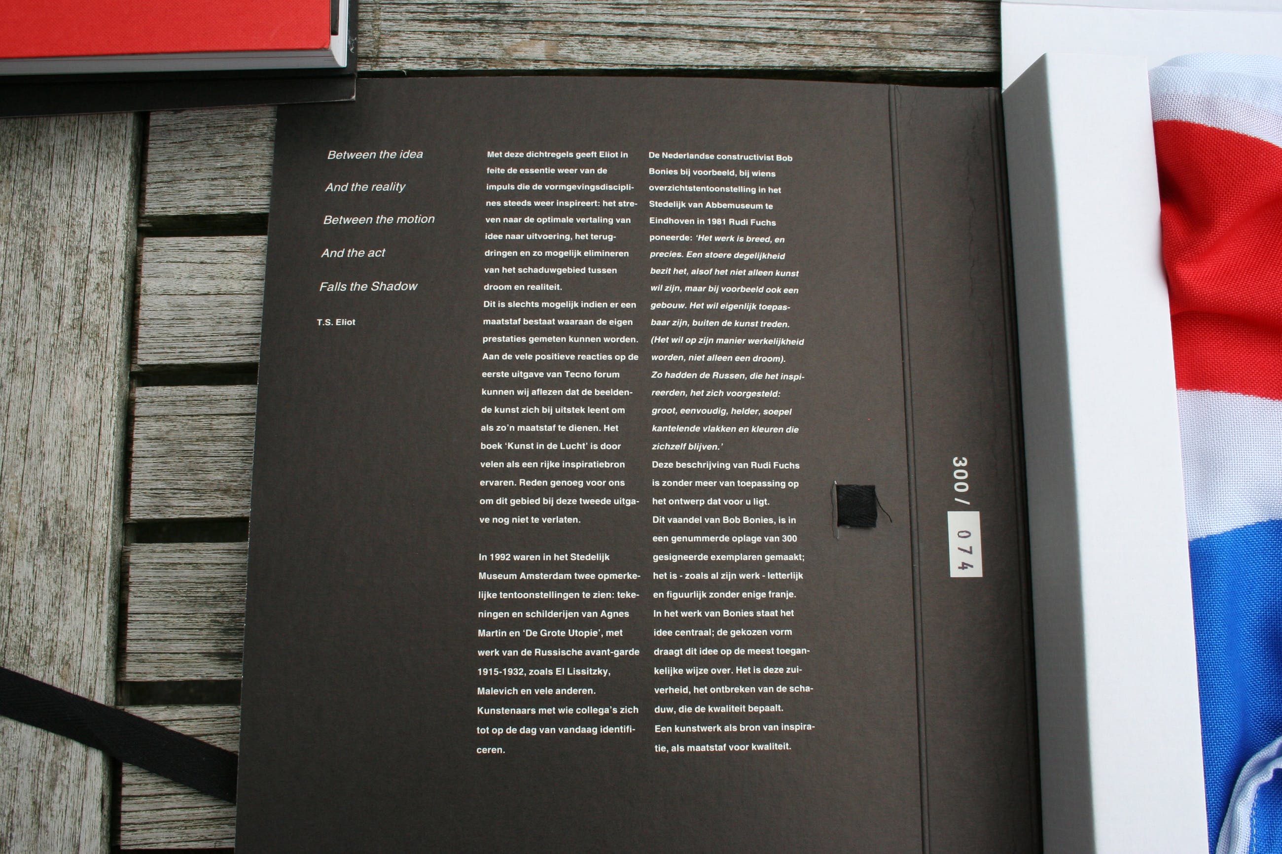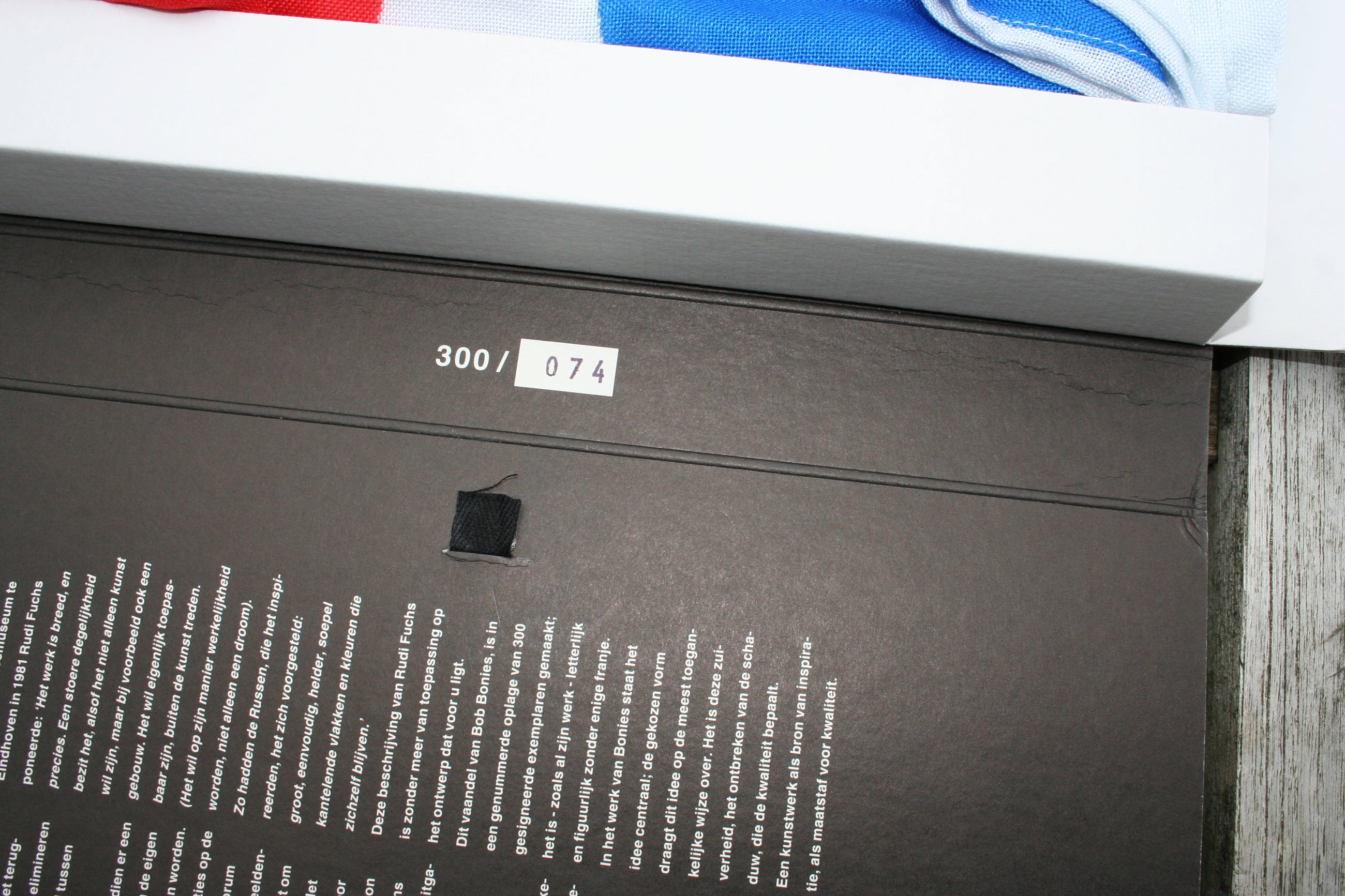 Het vaandel is,zoals al zijn werk,letterlijk en figuurlijk zonder enige franje.In het werk van Bonies staat het idee centraal;de gekozen vorm draagt dit idee op de meest toegankelijke wijze over.Het is deze zuiverheid,het ontbreken van de schaduw,die de kwaliteit bepaald.en kunstwerk als bron van inspiratie,als maatstaf voor kwaliteit.Boek en vaandel zijn in nieuwstaat,de cassette dozen zelf zijn iets wat verkleurd.