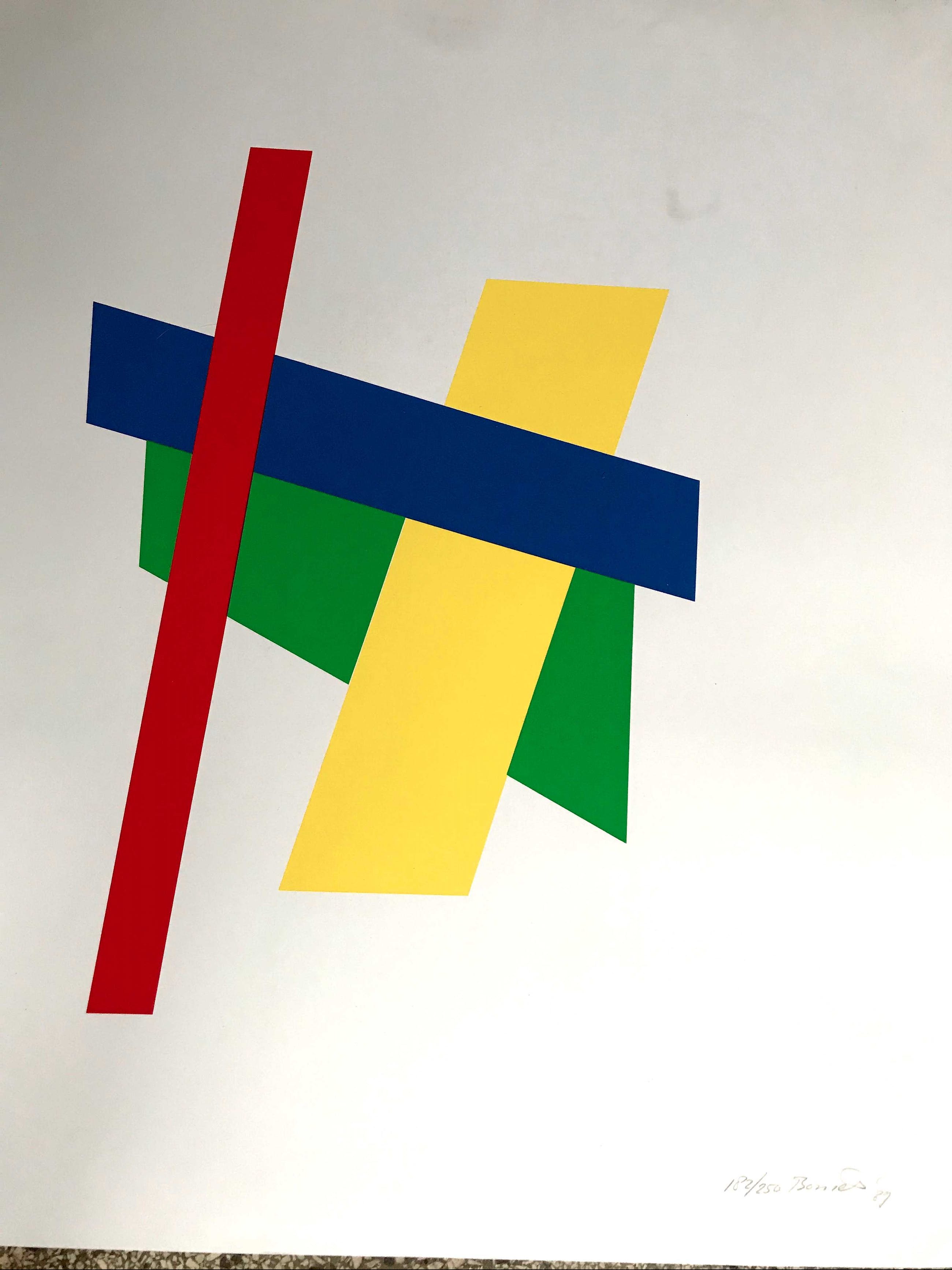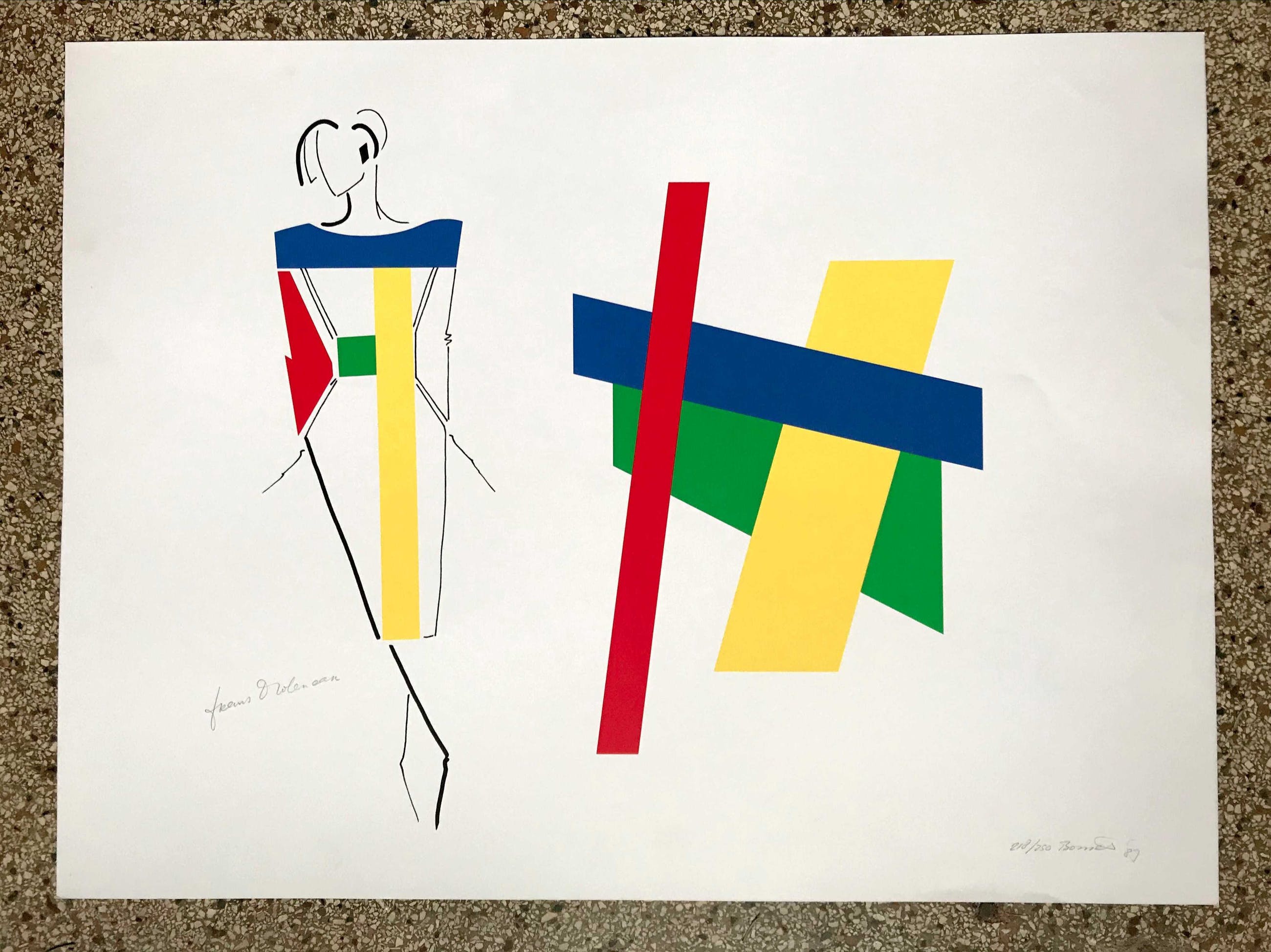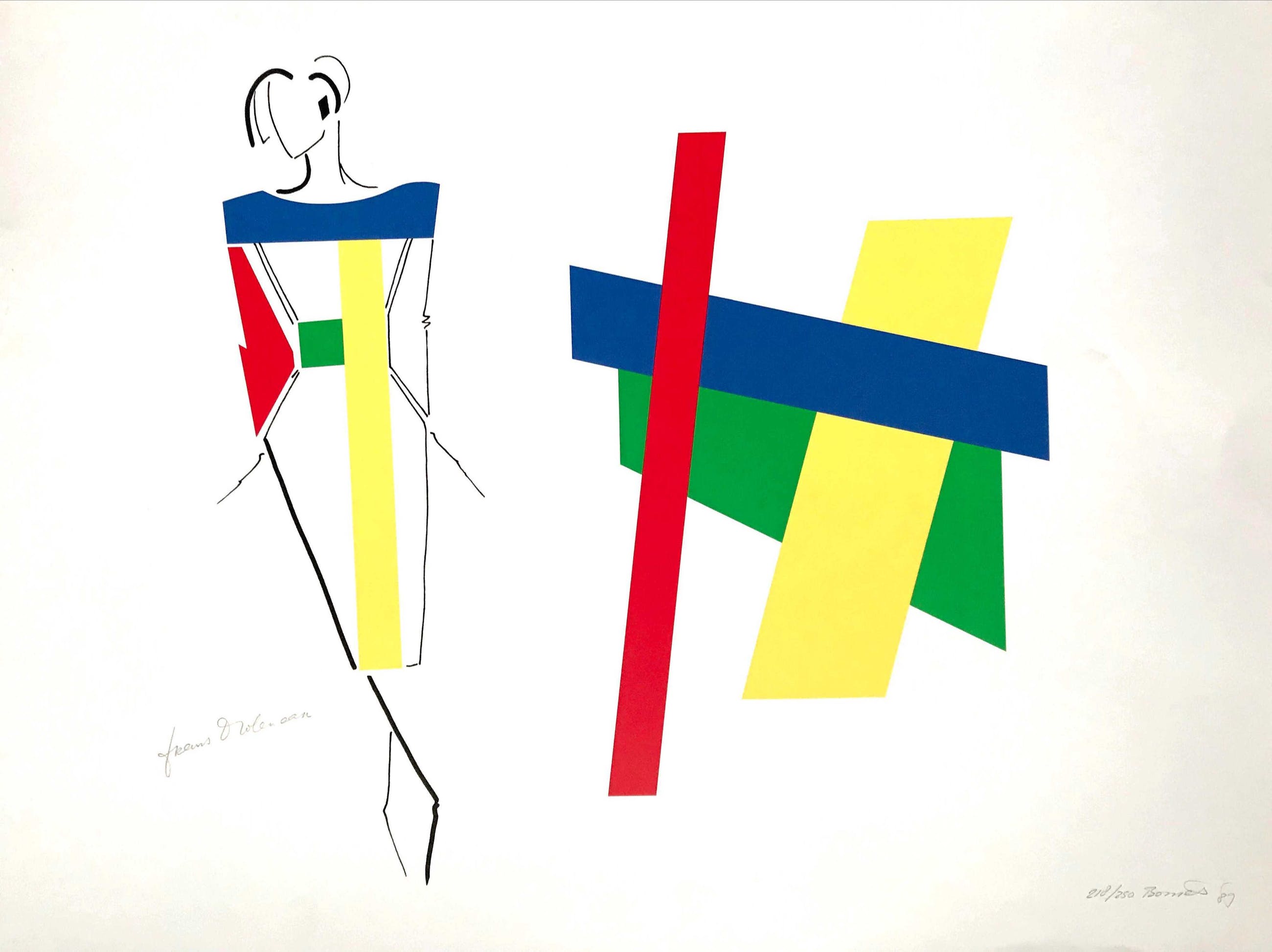Zeefdruk van Bob Bonies (1937) en couturier Frans Molenaar (1940 - 2015) uit 1989 voor de tentoonstelling ‘Constructivistisch Drieluik’ in het Centraal Museum, Utrecht.