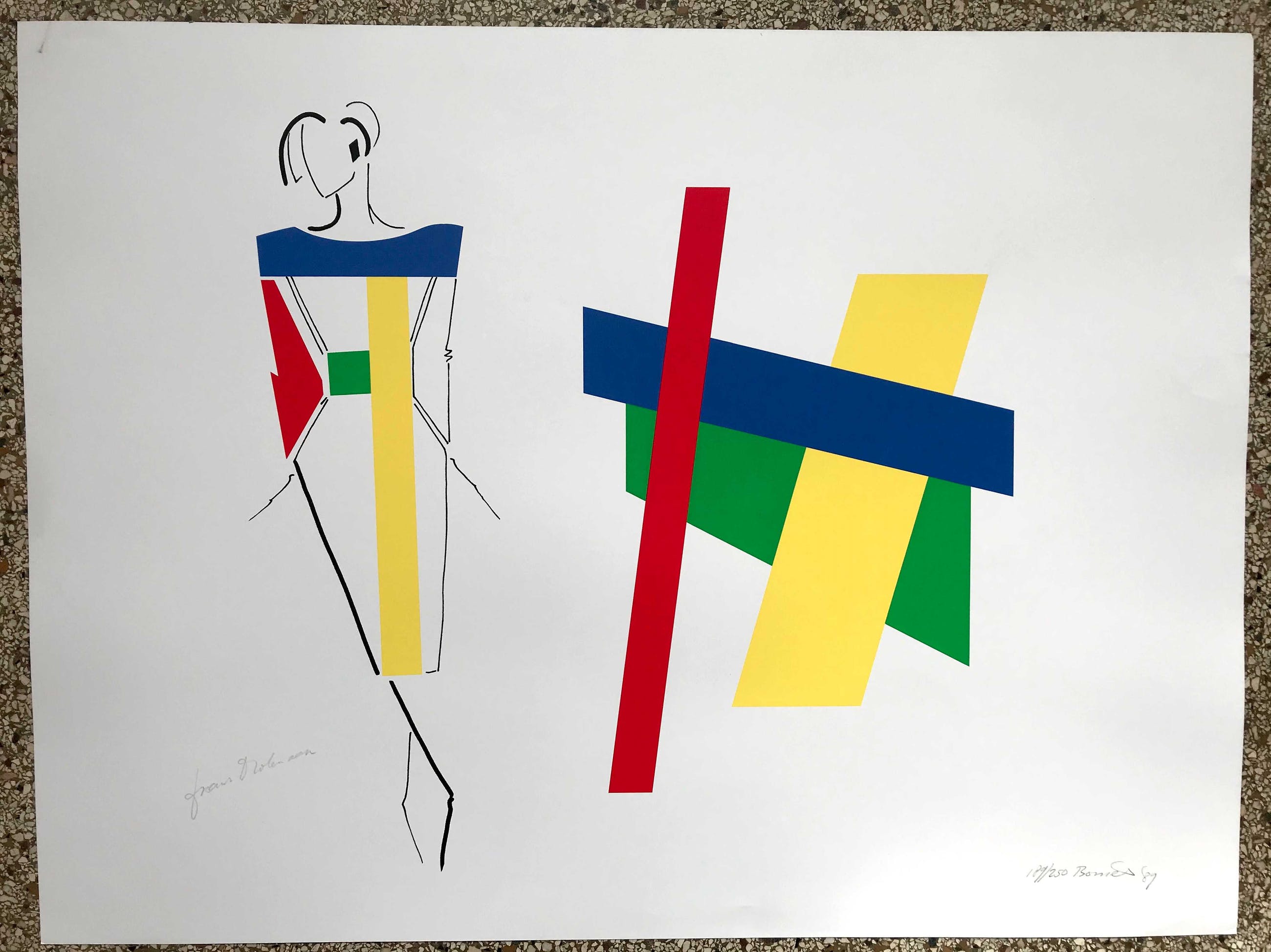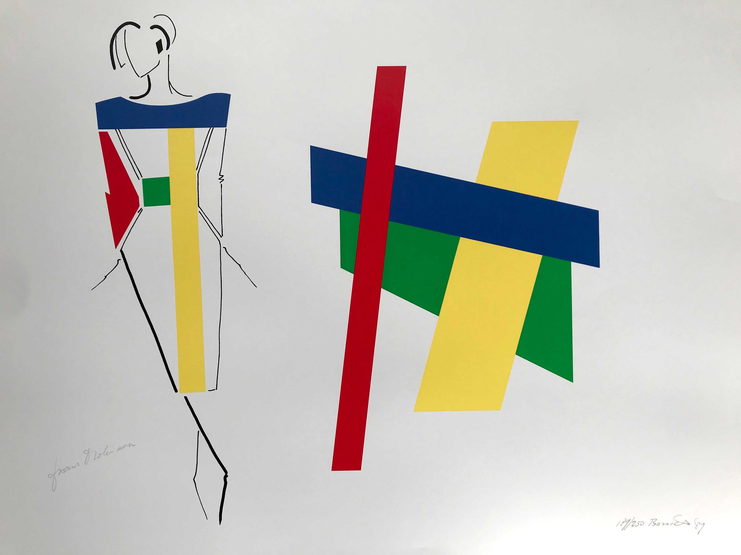Zeefdruk van Bob Bonies (1937) en couturier Frans Molenaar (1940 - 2015) uit 1989 voor de tentoonstelling ‘Constructivistisch Drieluik’ in het Centraal Museum, Utrecht.
