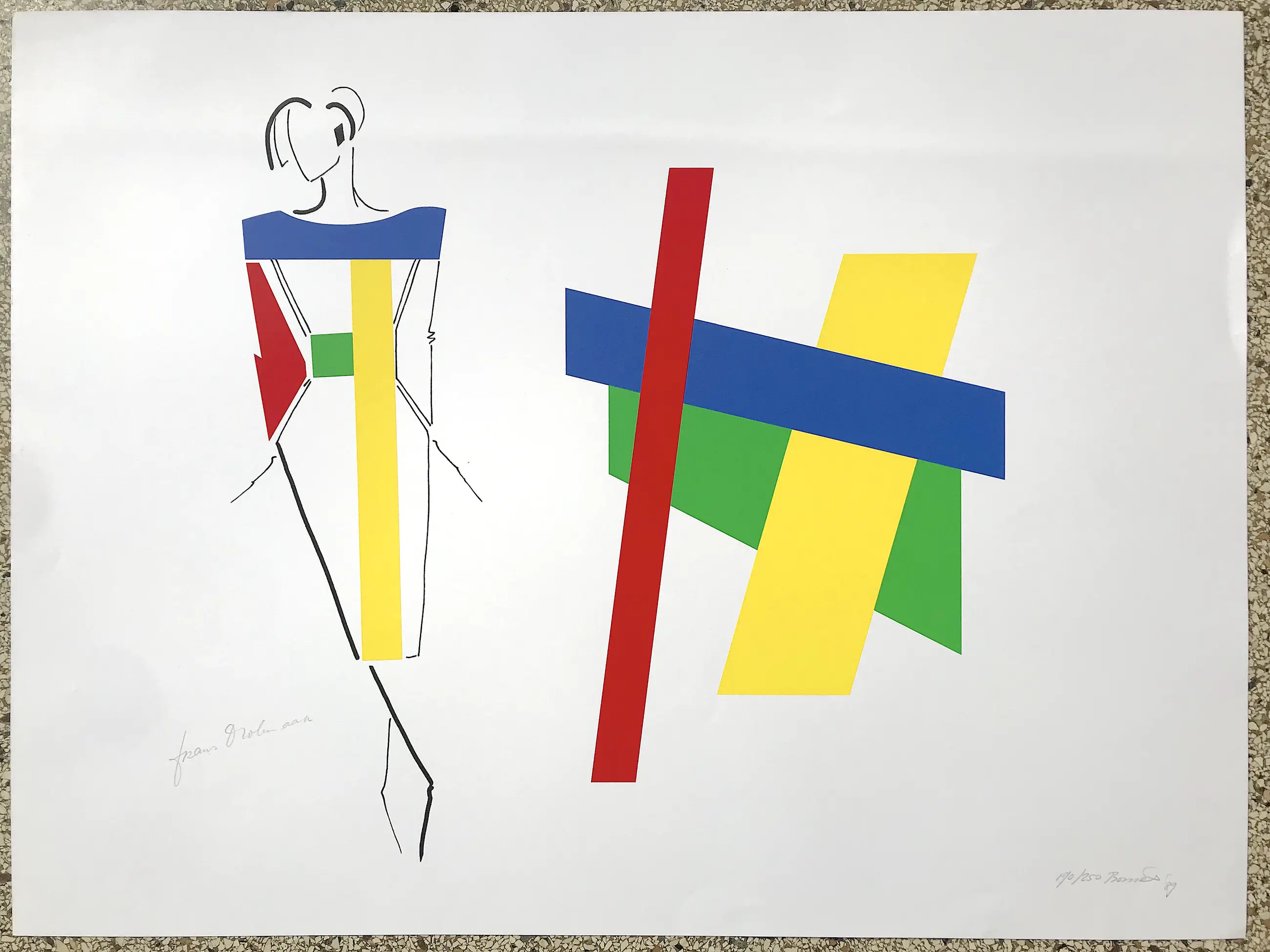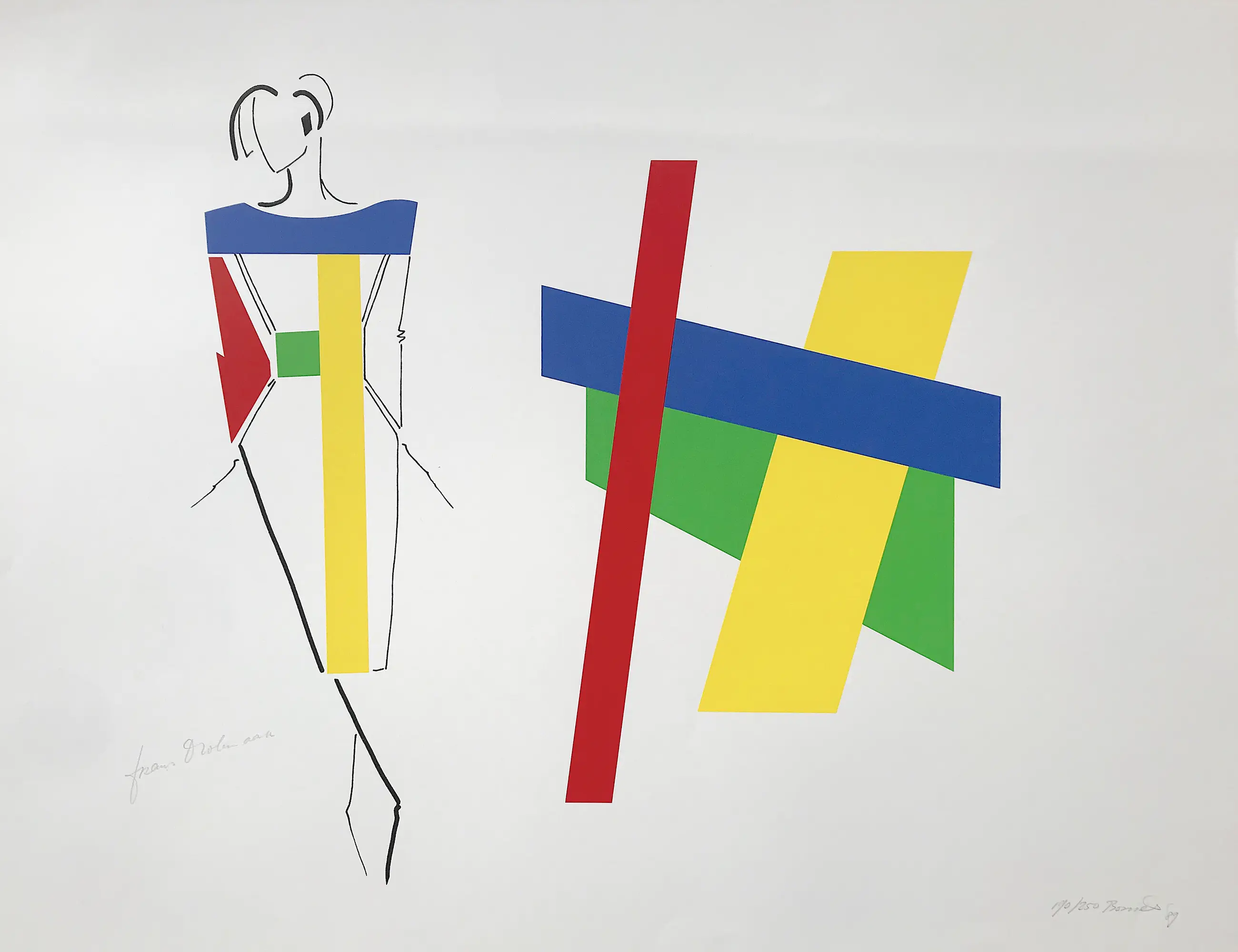 Zeefdruk van Bob Bonies (1937) en couturier Frans Molenaar (1940 - 2015) uit 1989 voor de tentoonstelling ‘Constructivistisch Drieluik’ in het Centraal Museum, Utrecht.