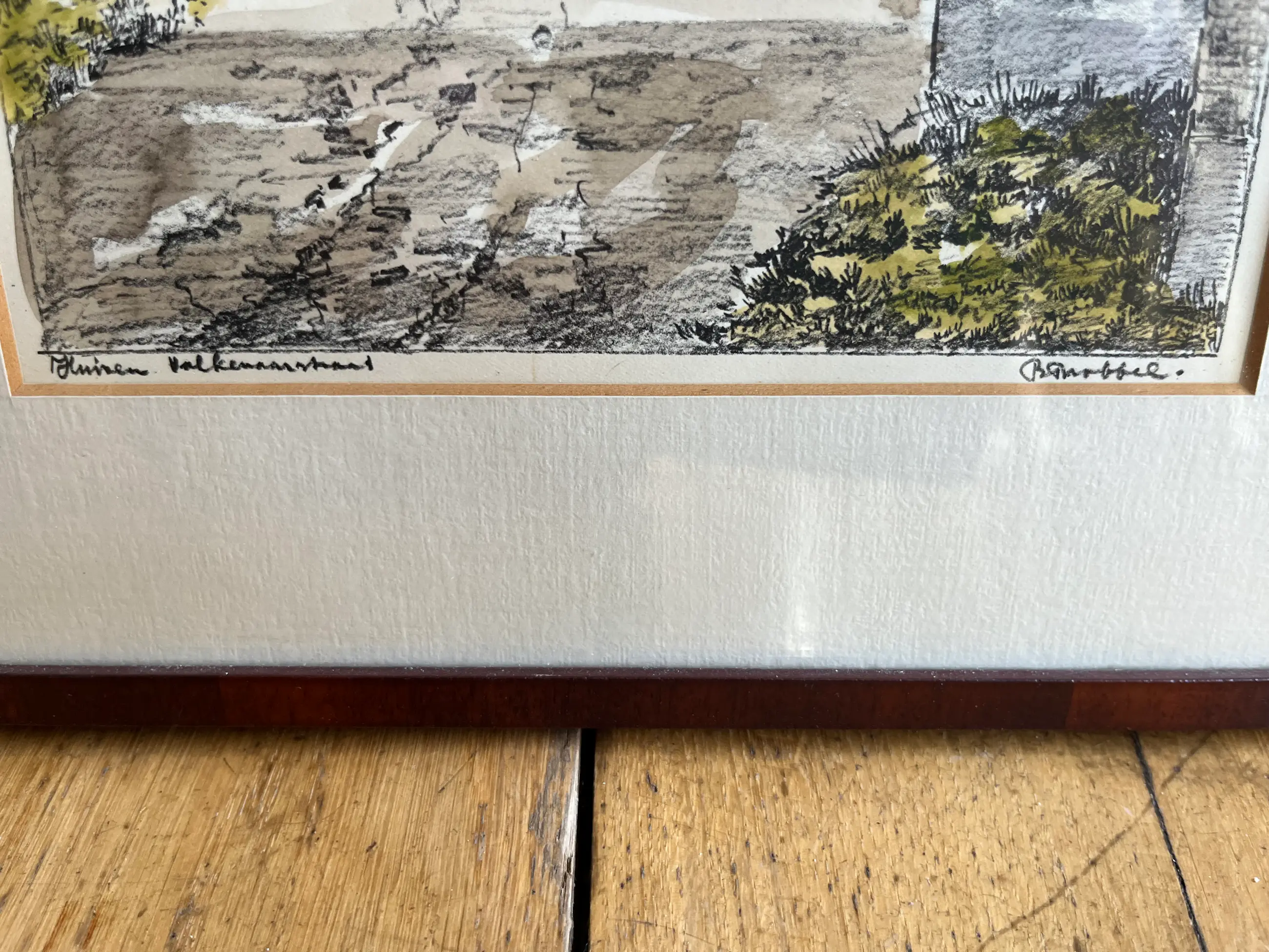 Aquarel van B. Brobbel, voorstellende de Valkenaarstraat in Huizen. Werk in passe-partout, gesigneerd.