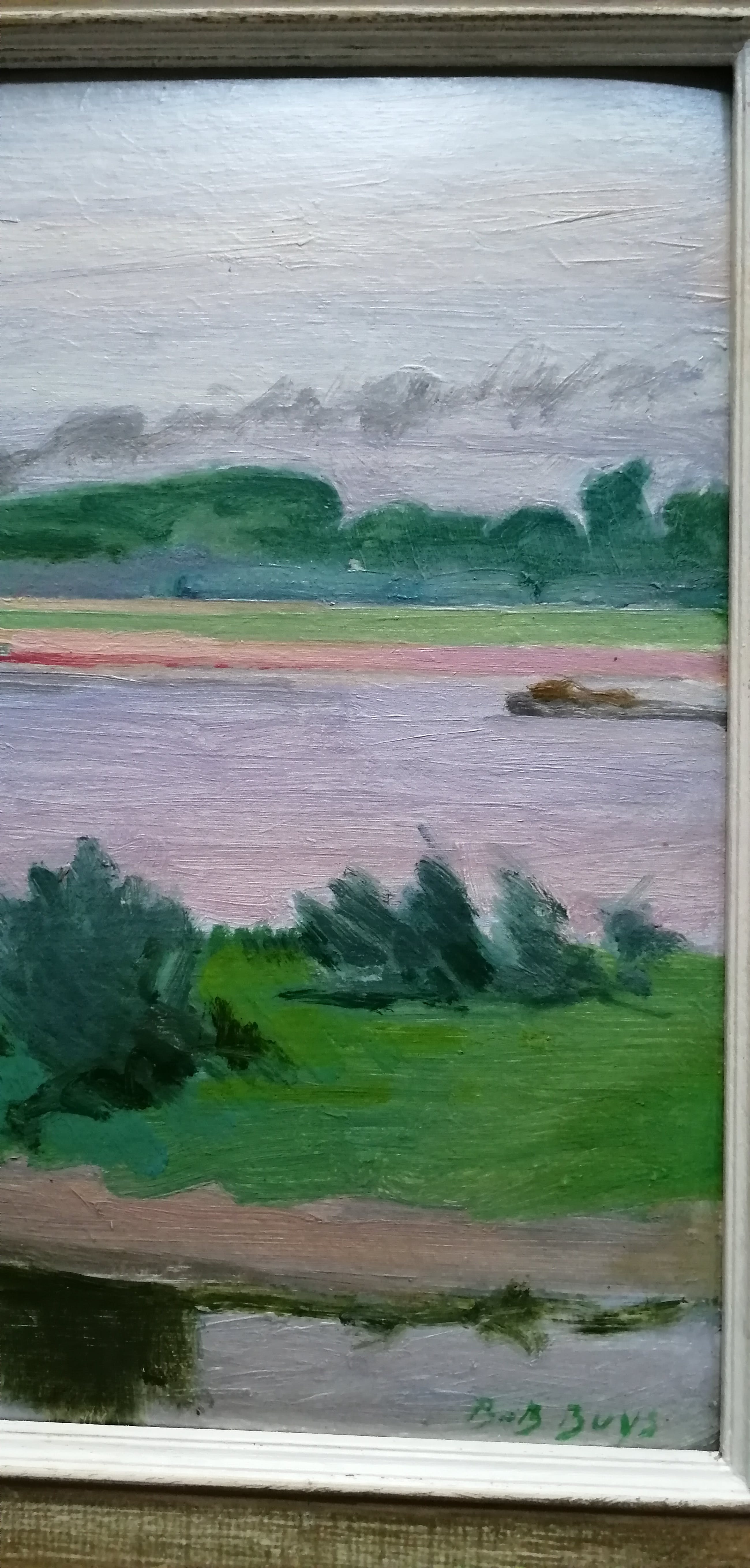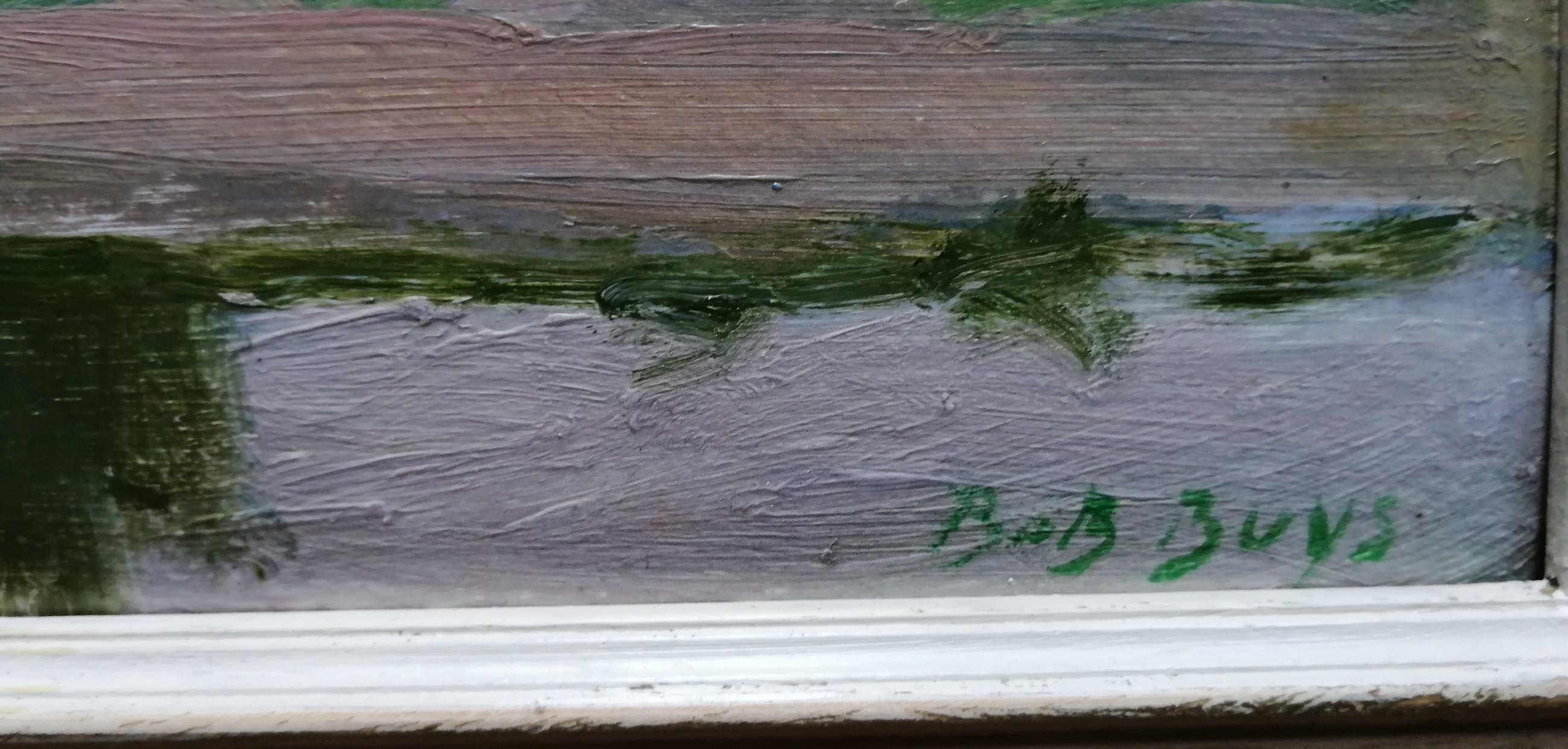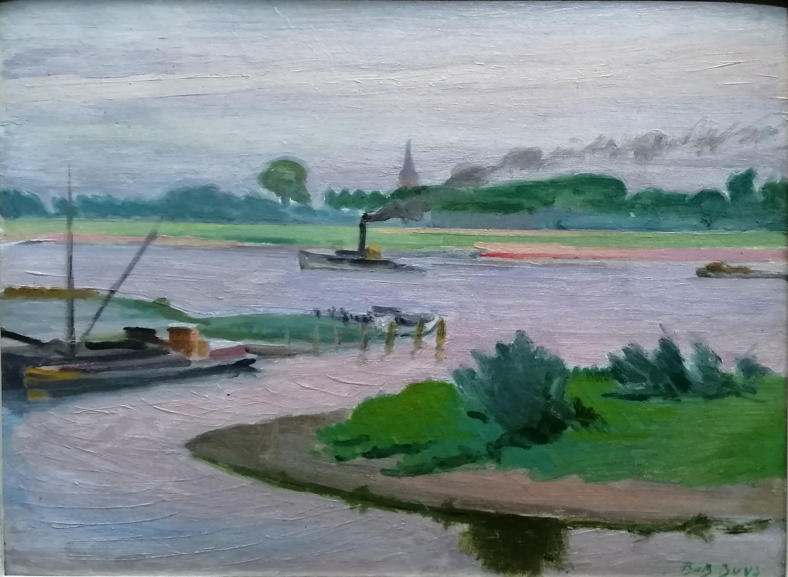 Olieverf op karton in mooie heldere kleuren.Gesigneerd rechtsonder.Bob Buys werd geboren te Amsterdam op 24 maart 1912 en overleed aldaar op 16 augustus 1970.Hij was aquarellist, kunstcriticus, schilder en tekenaar.Tevens was hij leraar aan de Academie voor Beeldende Kunst te Tilburg.