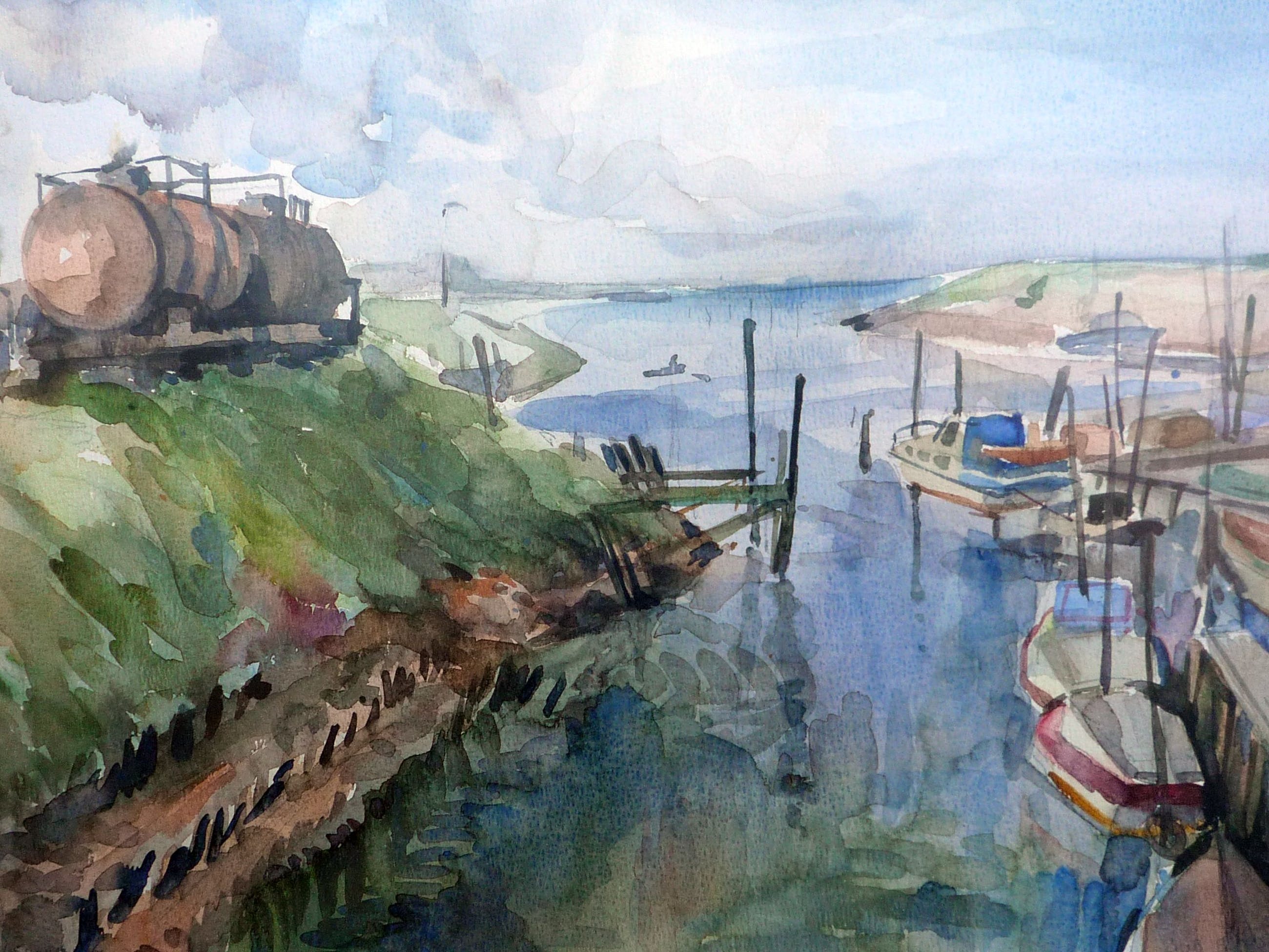 Een havengezicht en landschap gecombineerd door de naar mijn mening ondergewaardeerde kunstenaar Bob Buys. De titel is waarschijnlijk de plaats waar het is geschilderd en is te lezen linksonder bij het jaartal. Hij schilderde en aquarelleerde in de zomer vaak aan de Franse Opaalkust.
