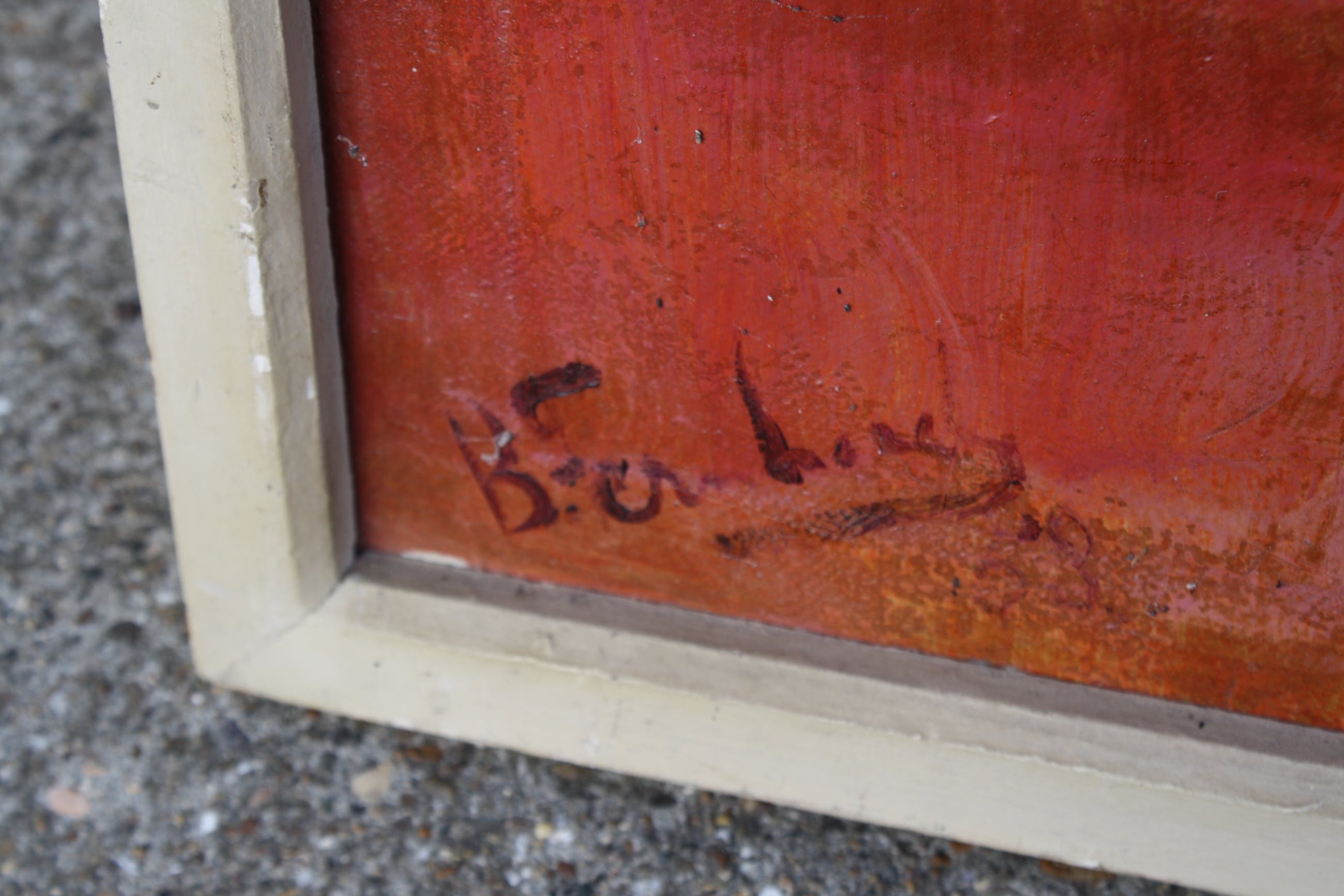 BOB FERNHOUT portret meisje in Balletpakje olieverf op linnen in de maat 60 x 70 cm staat goed gekaderd in dun houten lijstje jaar 1958 / gesigneerd en op de achterzijde titel en adres schilder verzenden aangetekend of halen in Zaandam
