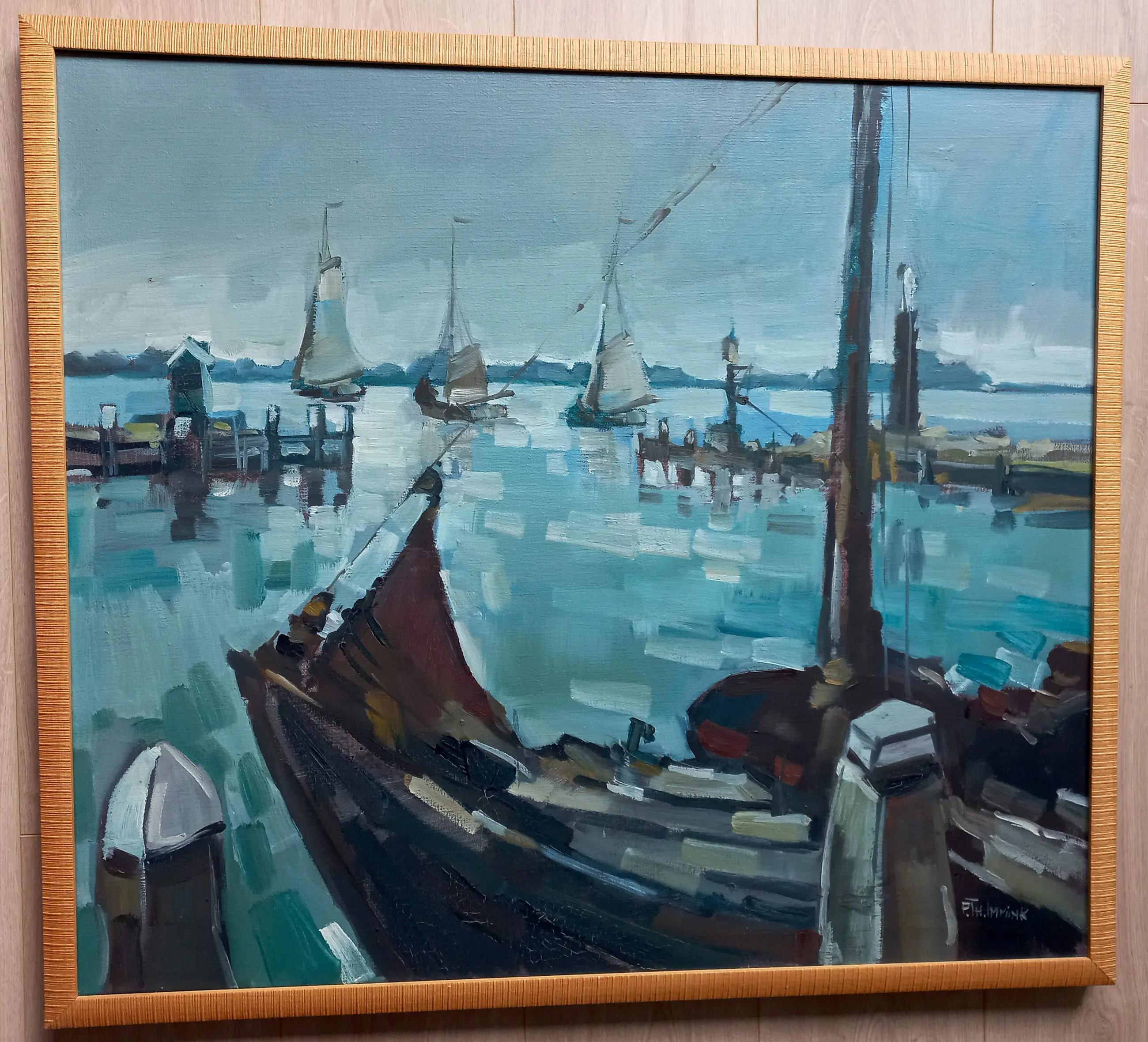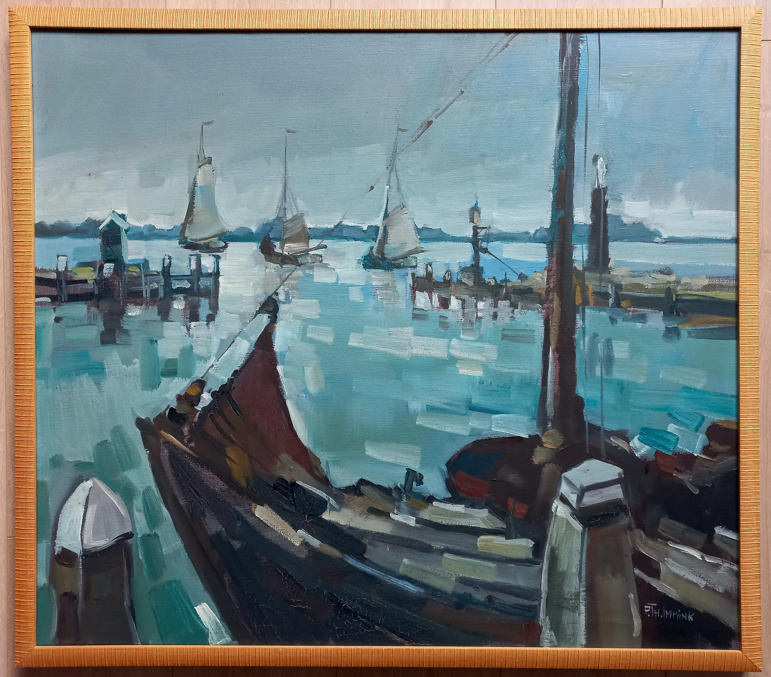 Mooi, karakteristiek impressionistisch werk van Bob Immink. Dit keer geen Noord-Hollands landschap maar een Noord-Hollands havengezicht; de haven van Volendam. Olieverf op doek, gesigneerd rechtsonder, in nette houten lijst. Alles in goede conditie.