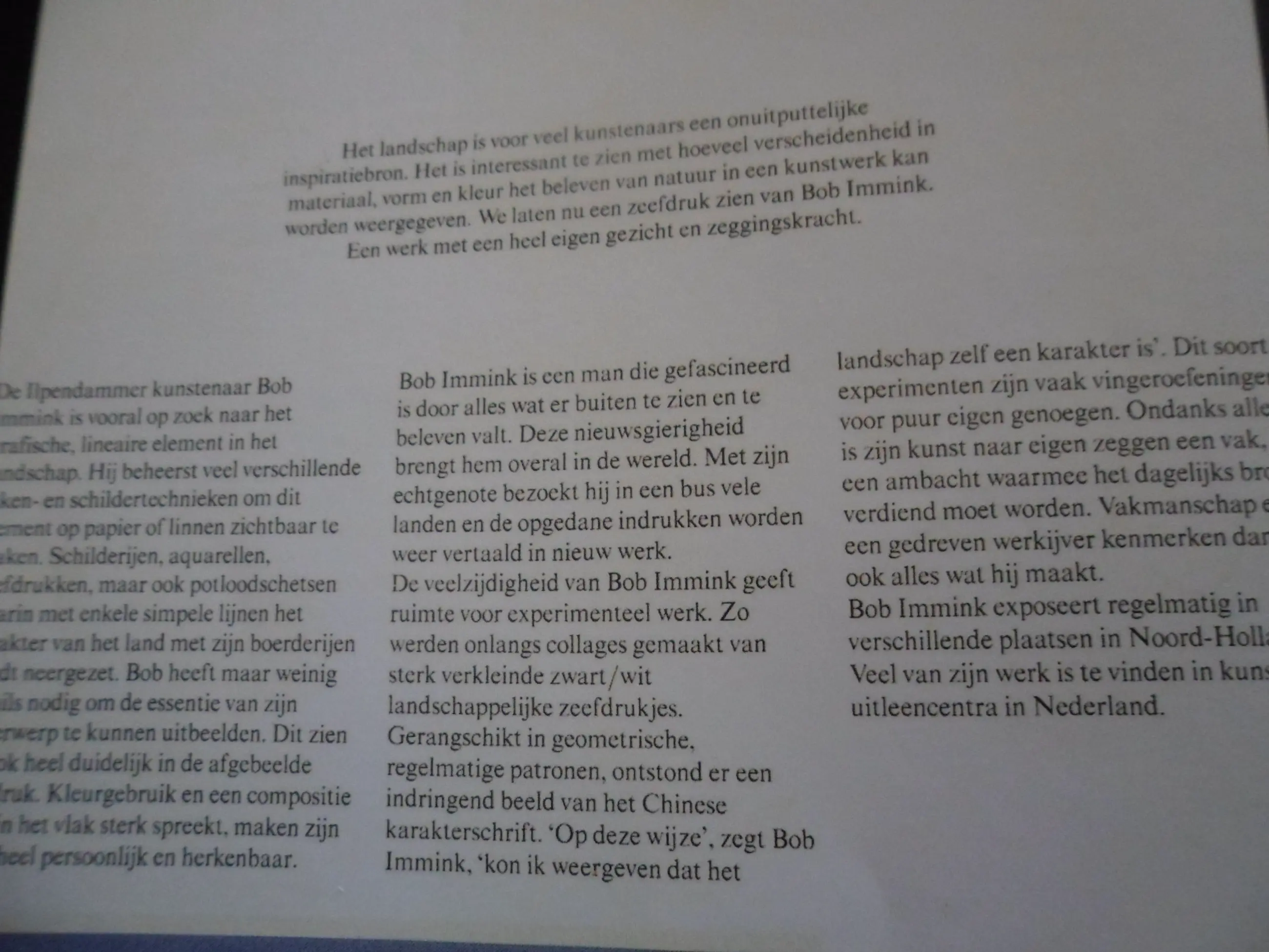 "Een gedreven kunstenaar, die in zijn werk - schilderen, aquarelleren, zeefdrukken en collages maken - tracht het landschap terug te brengen tot de essentie. Een meester in het weglaten, heb ik Immink genoemd. daarmee aangevend dat hij in zijn werk allerlei details elimineert en slechts de hoofdzaken in krachtige vlakken weergeeft, zonder dat de herkenbaarheid van de door hem vastgelegde landschappen verdwijnt.
