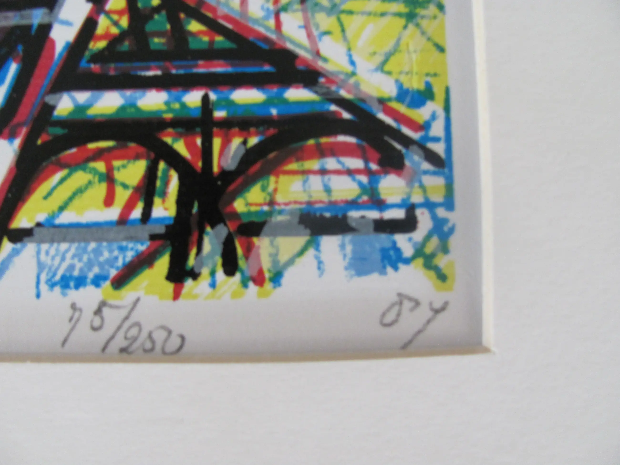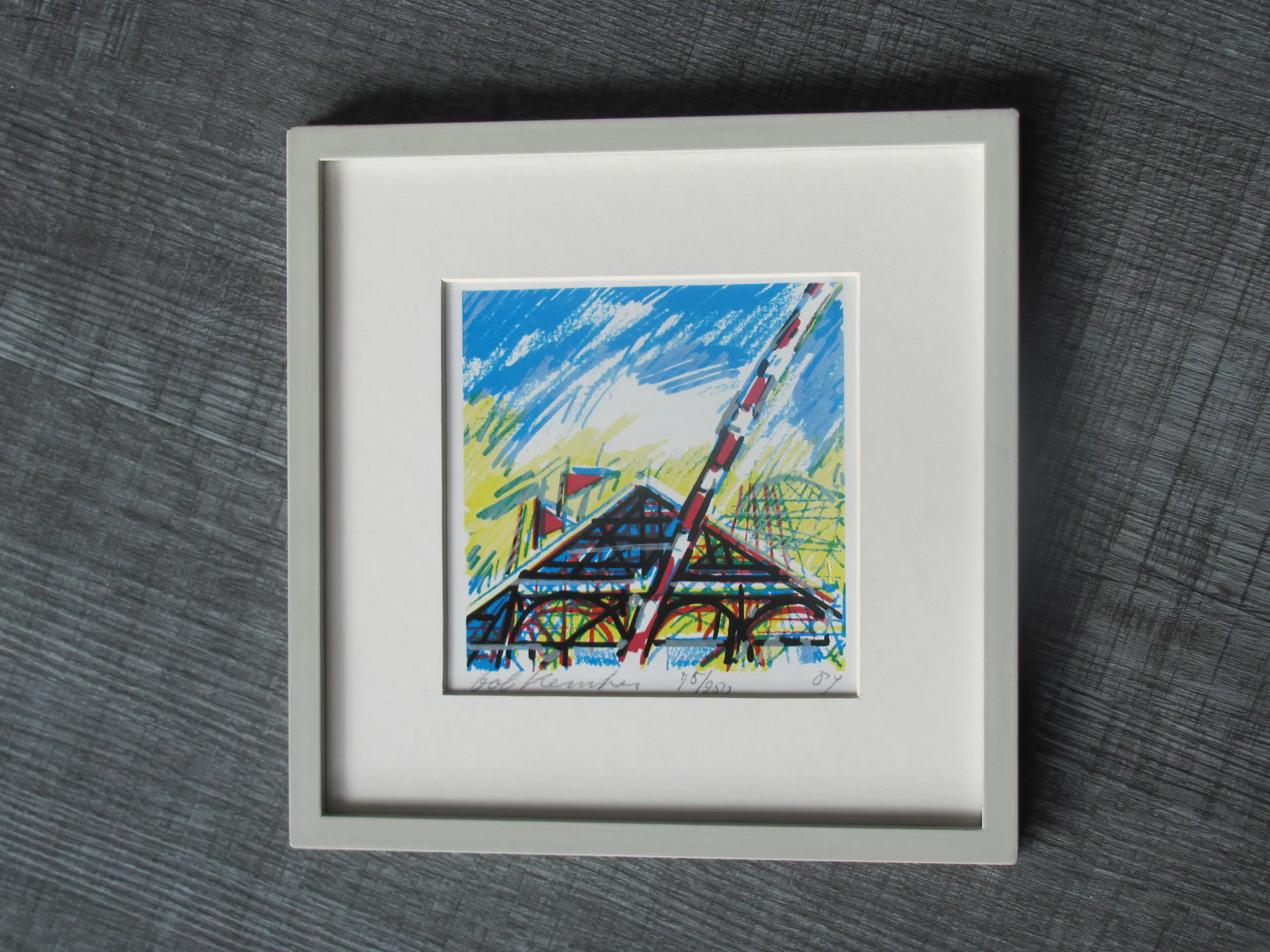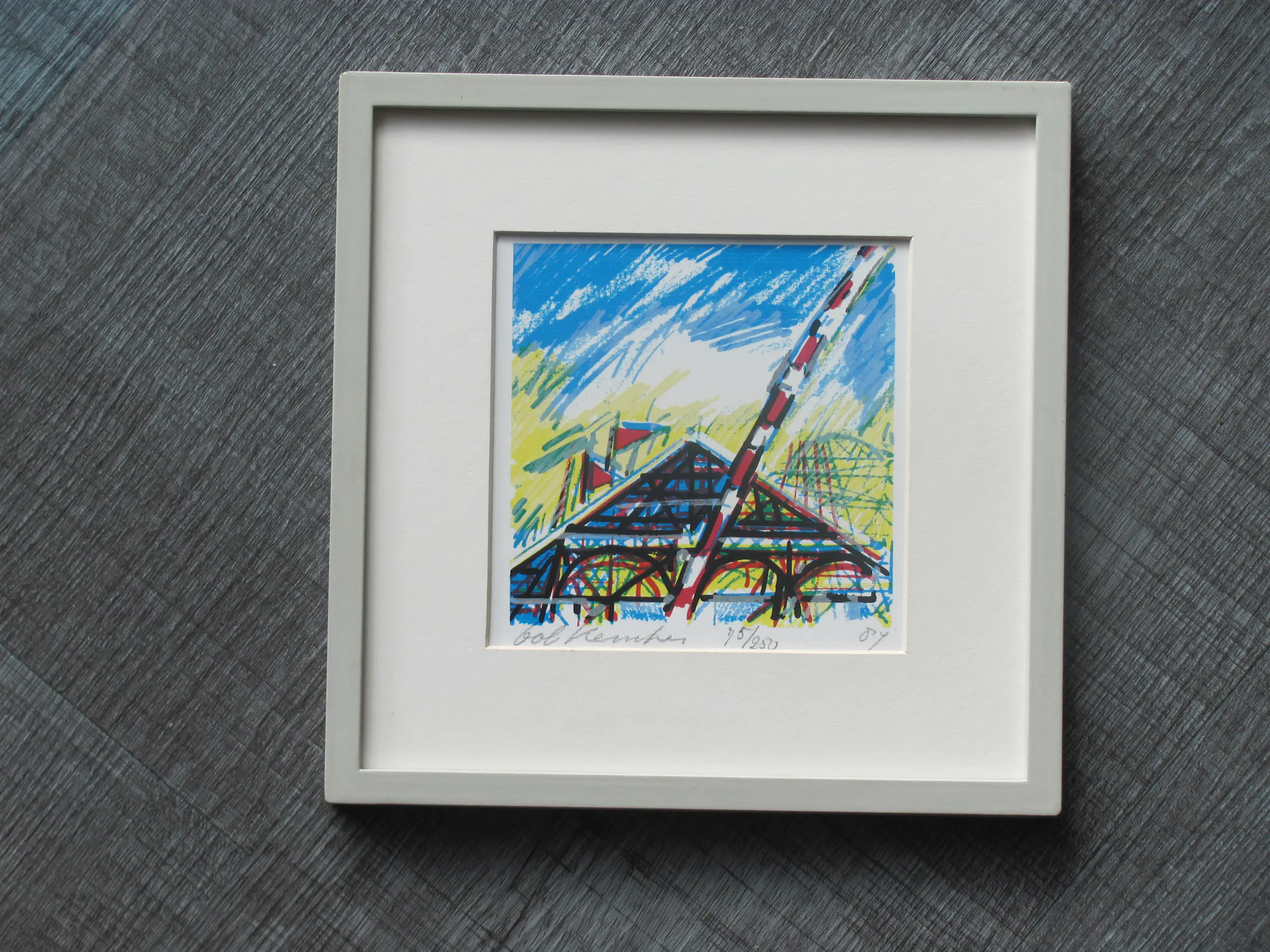 Mooie, kleine zeefdruk van Bob Kemper uit 1987. De lijst vertoont minimale ouderdomssporen. de zeefdruk is in heldere staat. Rechtsonder (circa 4 cm boven de datering ('87) zit een kleine oneffenheid in het papier, zie de vierde foto.