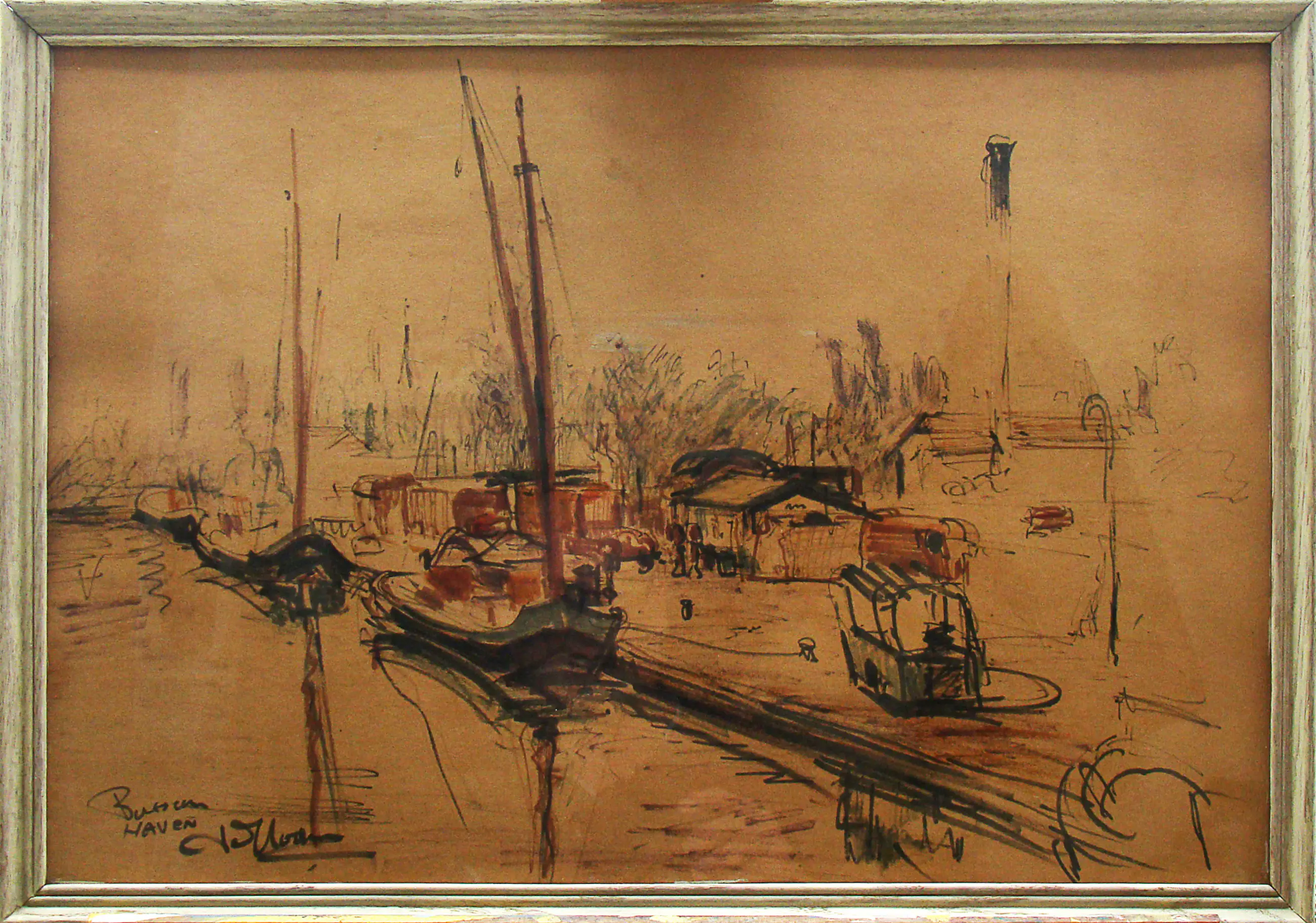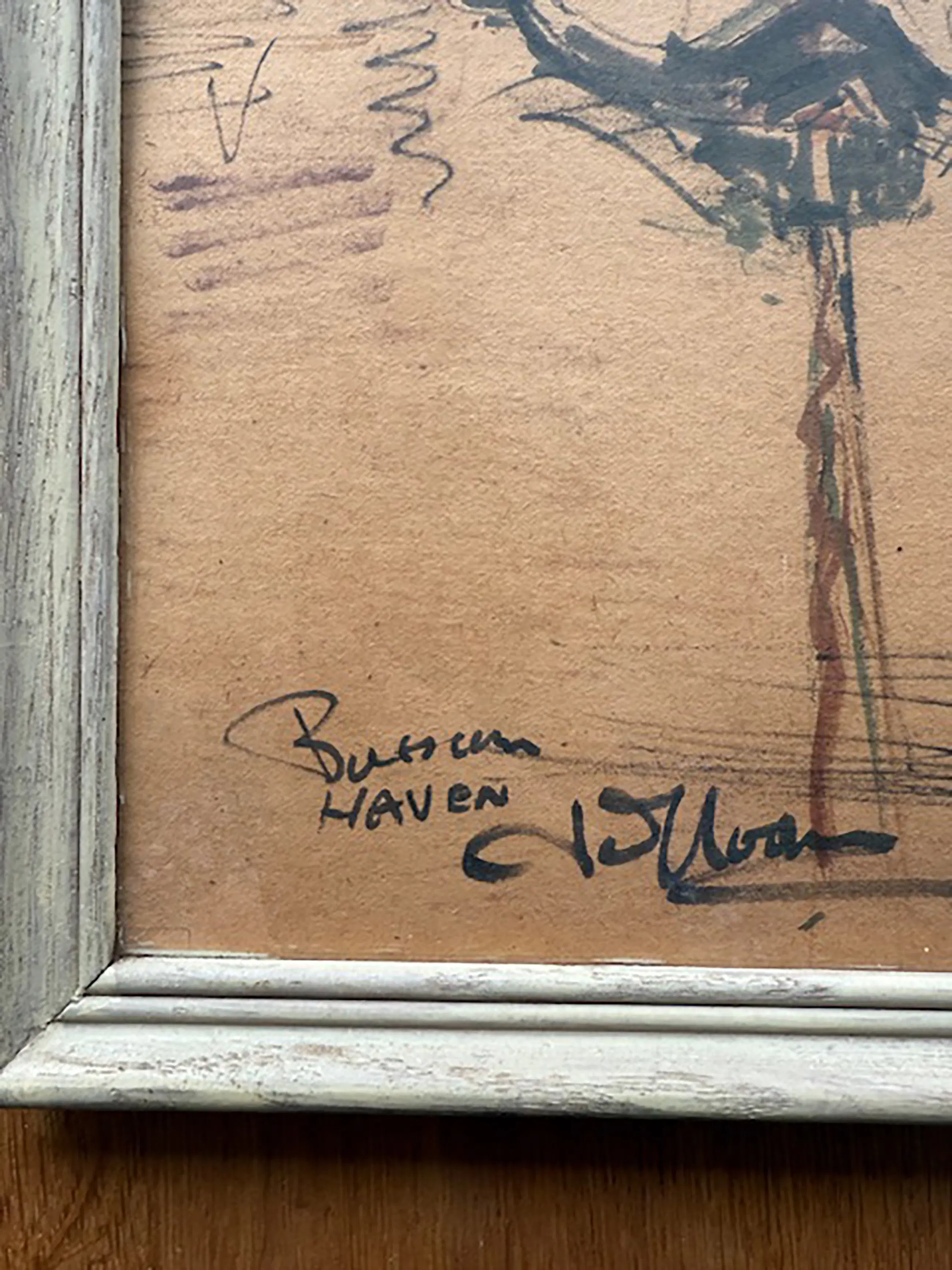 Het werk is ingelijst met glas. Gezien de mij bekende geschiedenis van het werk, schat ik vrijblijvend dat werk door de kunstenaar verkocht is tussen 1945 en 1960. Daar de haven gedempt is tussen 1940-1942 is het heel aannemelijk dat het geschilderd is voor 1942.