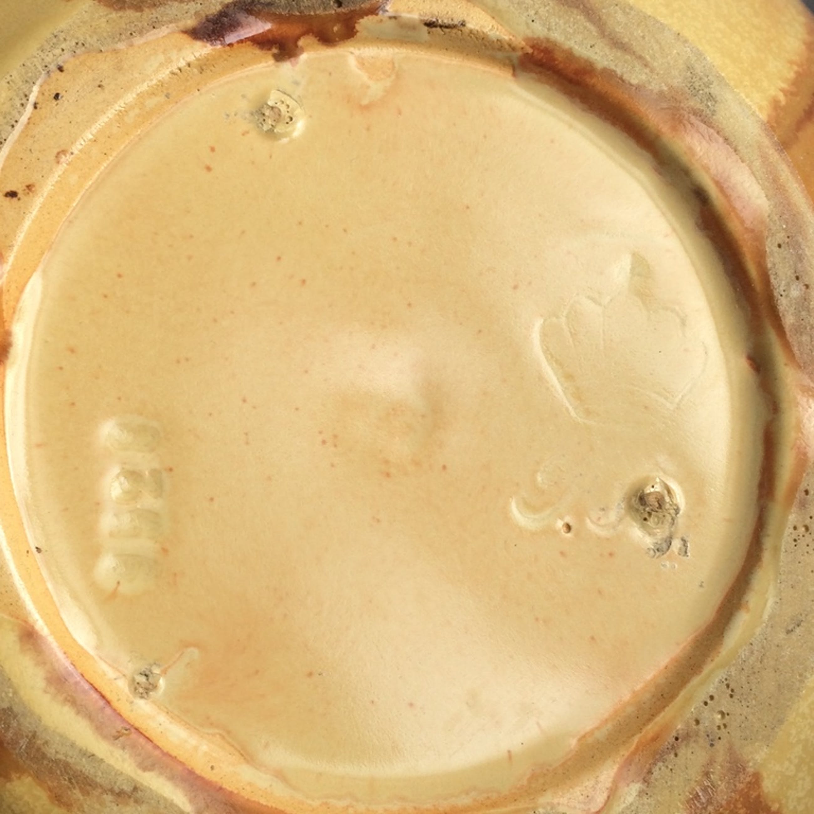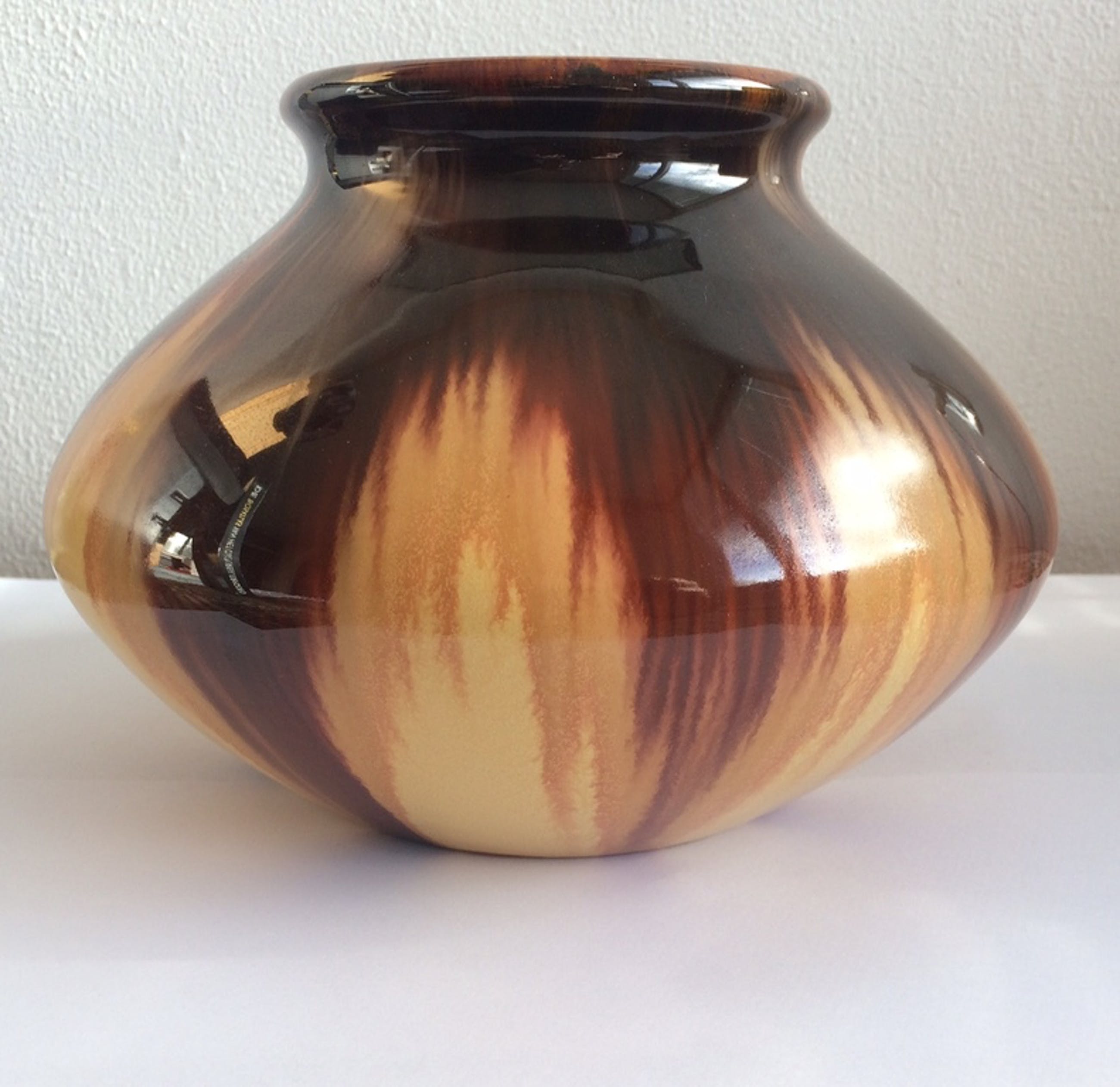 Kleuren: creme/zachtgeel mat geglazuurd voorzien van donkerbruin en mokka kleurig mat en glanzend druipglazuur.