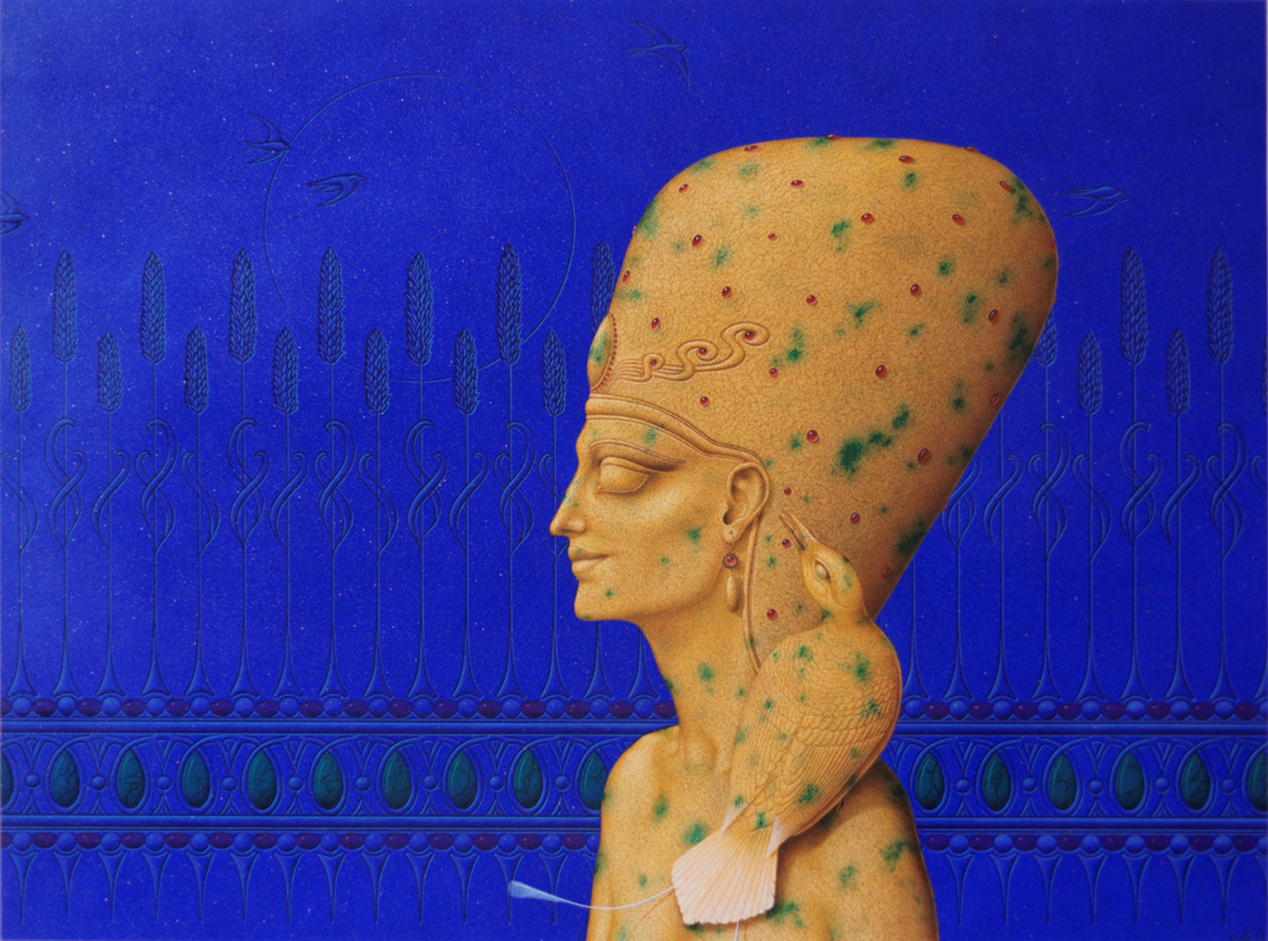 In fijn pointilistische stijl met kleurpotlood getekend op een gouache ondergrond op Schoellerhammerpapier. In lijst en passepartout. De tekening meet 75,5x56 cm in een zwarte lijst met vergulde rand van 105x88 cm. rechtsonder gesigneerd met Bodi. Op de achterzijde eventeens gesigneerd 1982-1983 en technische info.