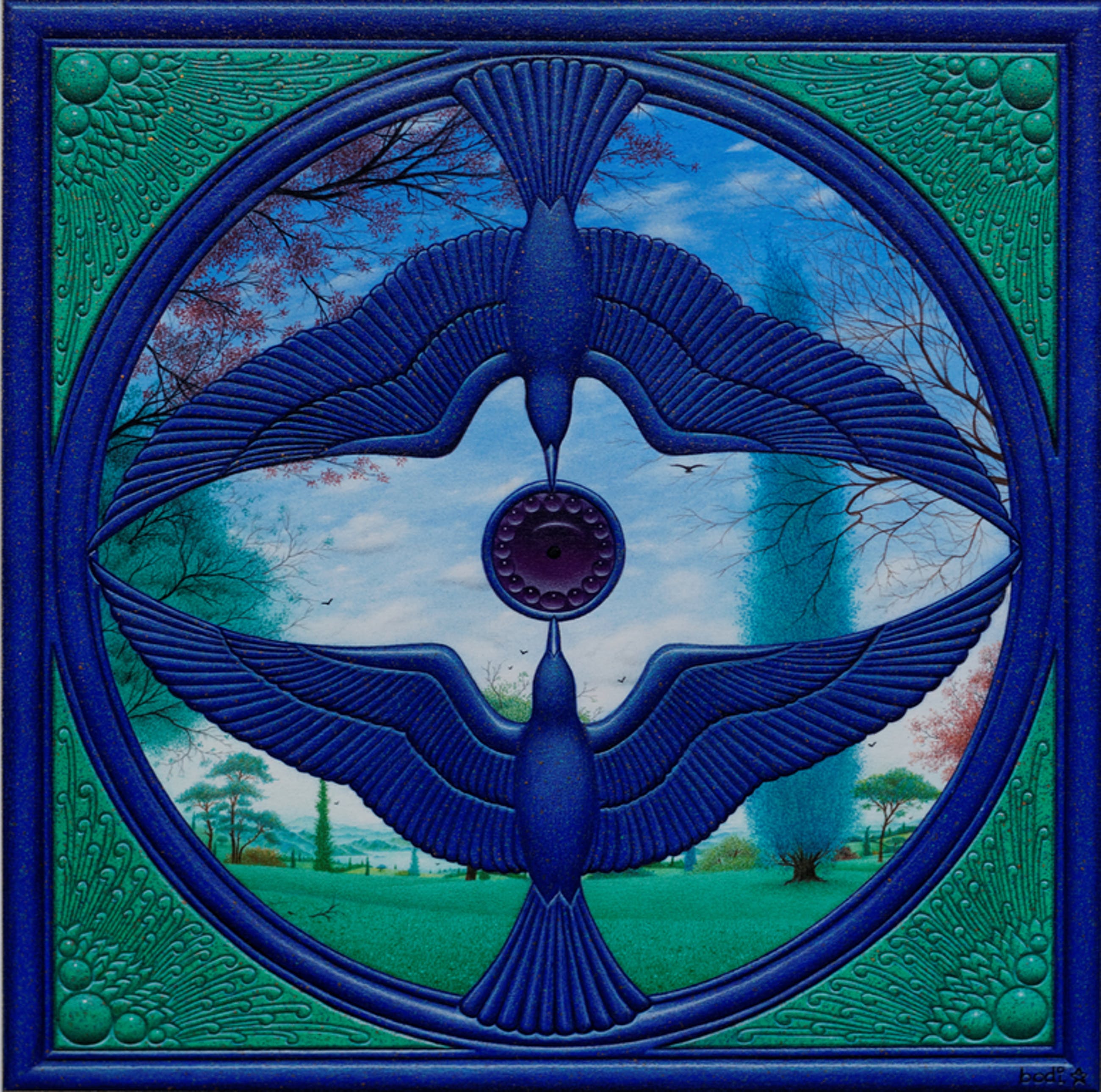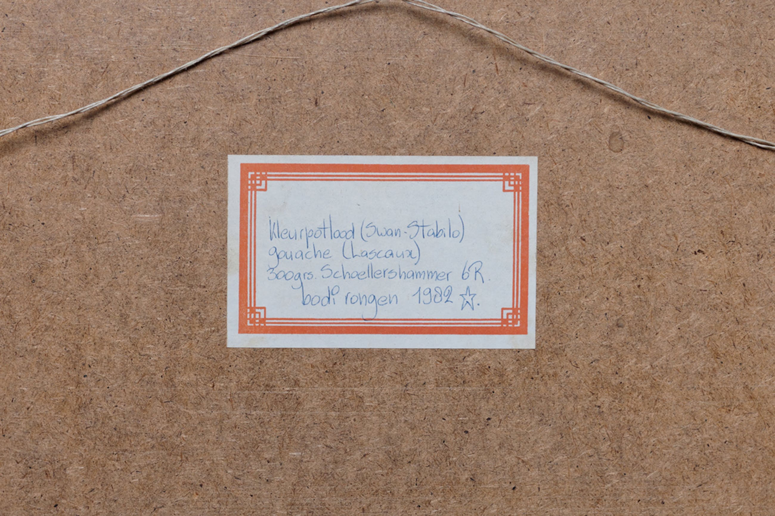 In fijn pointilistische stijl gemaakt met kleurpotlood en gouache op papier. De tekening, 24x24 cm in een zwarte lijst met vergulde rand van 46x46 cm, is rechtsonder gesigneerd met Bodi. Op de achterkant meer info waaronder signering met Bodi, het jaartal 1982 en technische info.