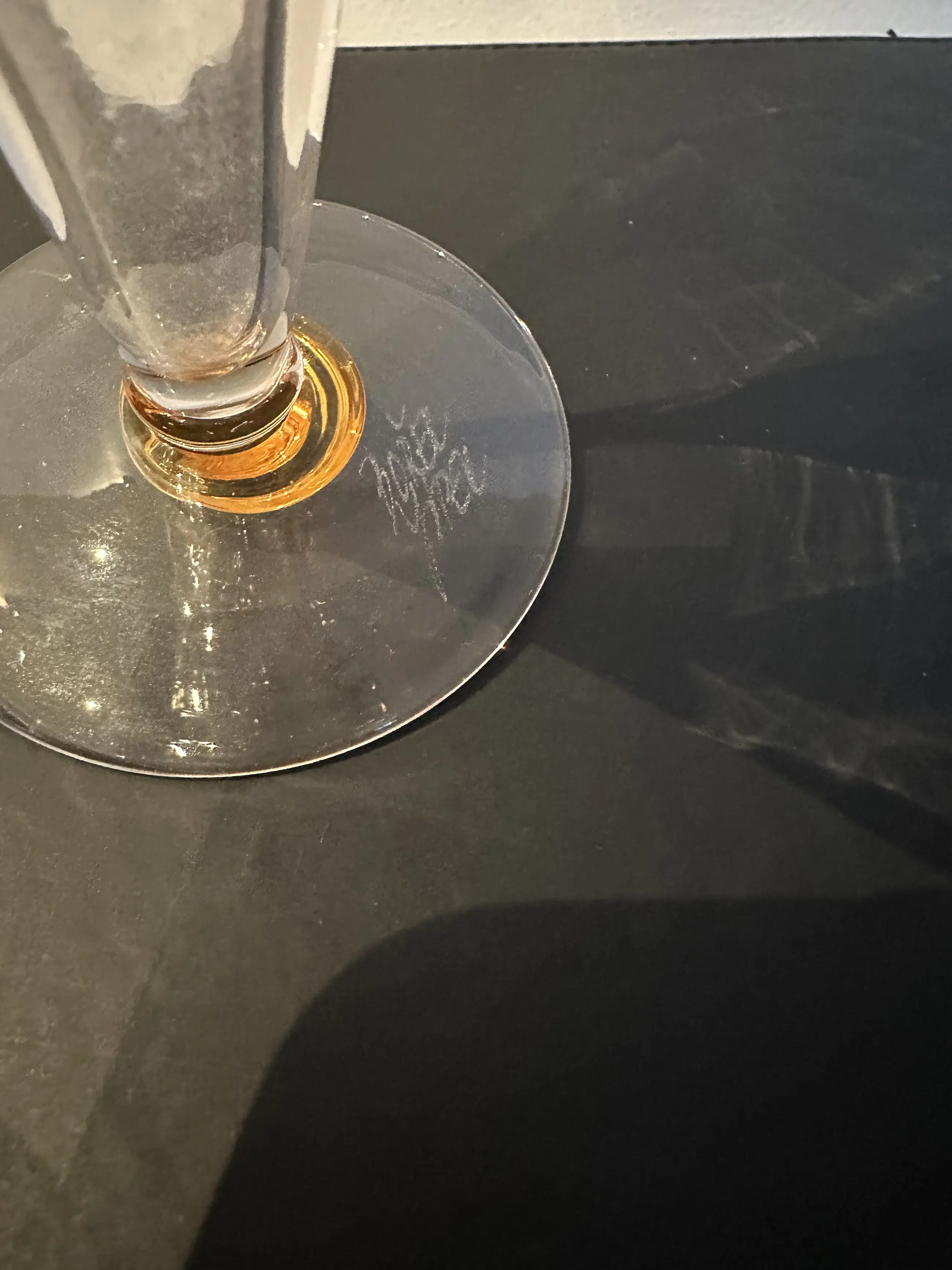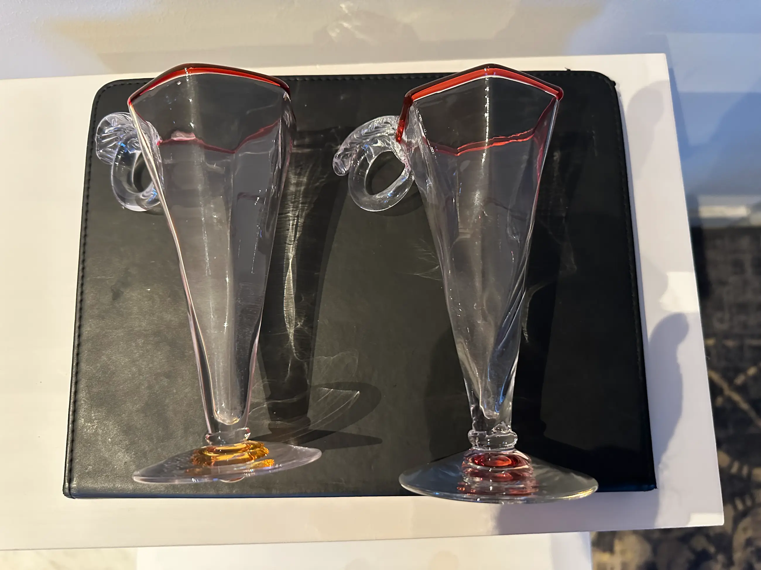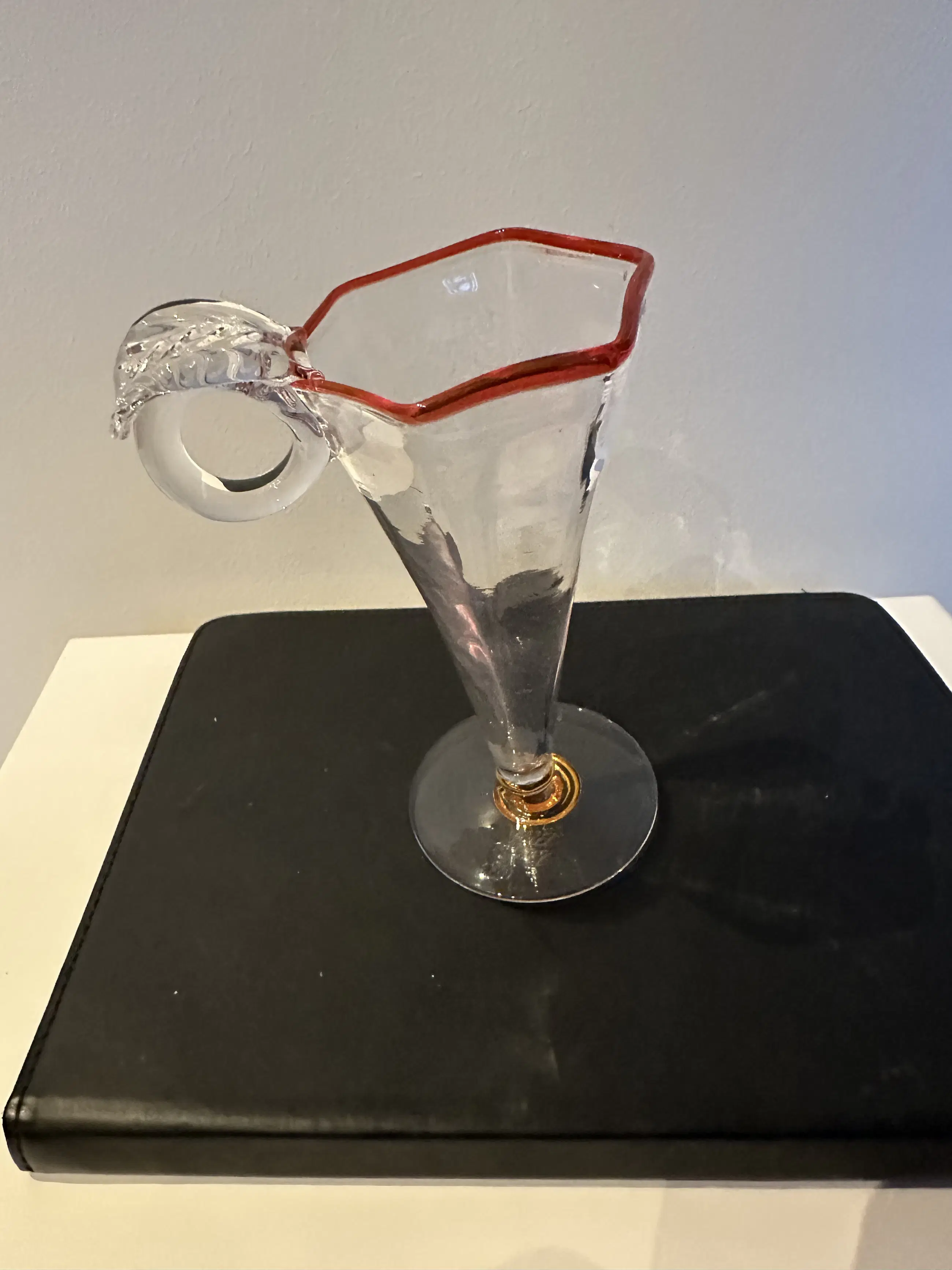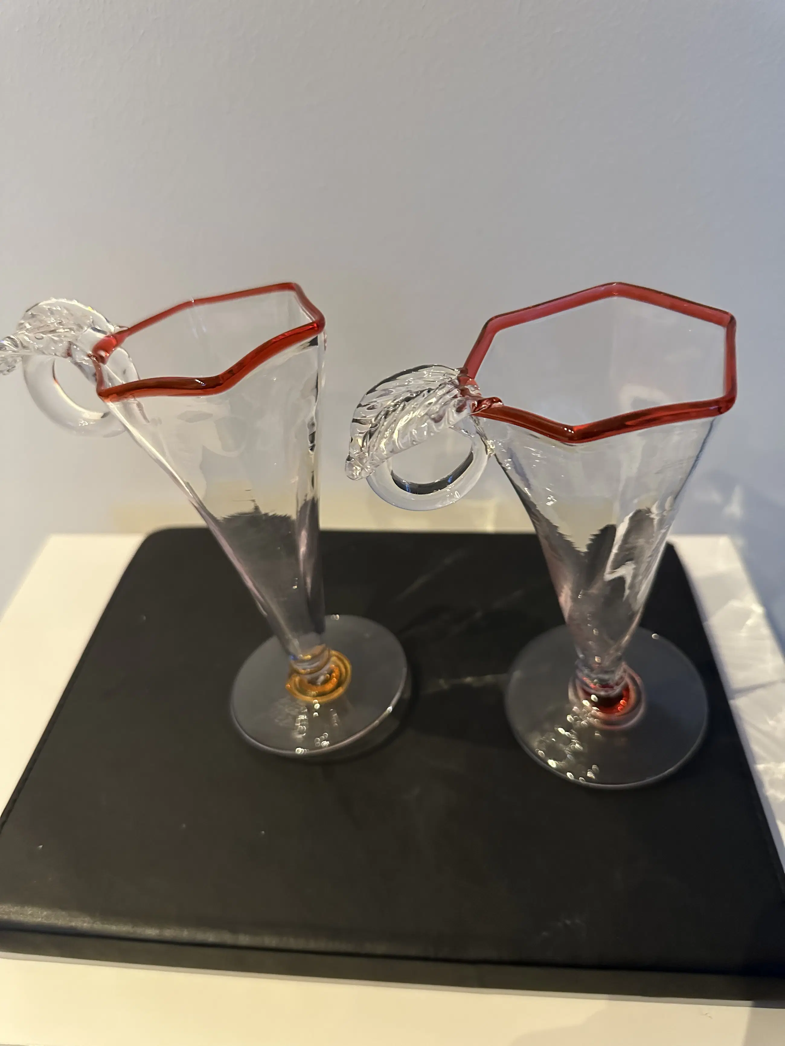 Glaasjes met rode bovenrand en greep in bloemmotief. Onder de voet een transparant rode bol, waardoor de glaasjes scheef staan