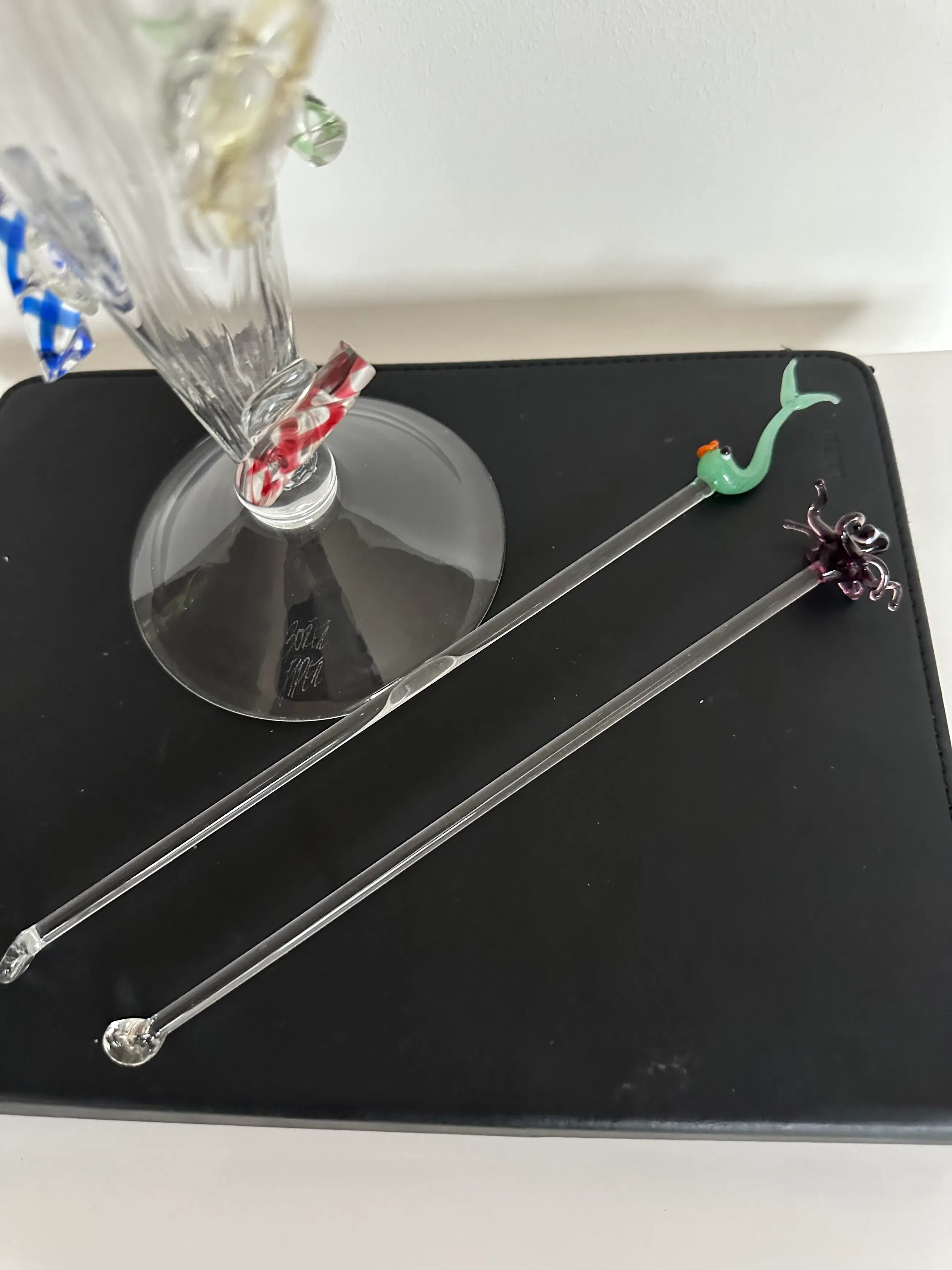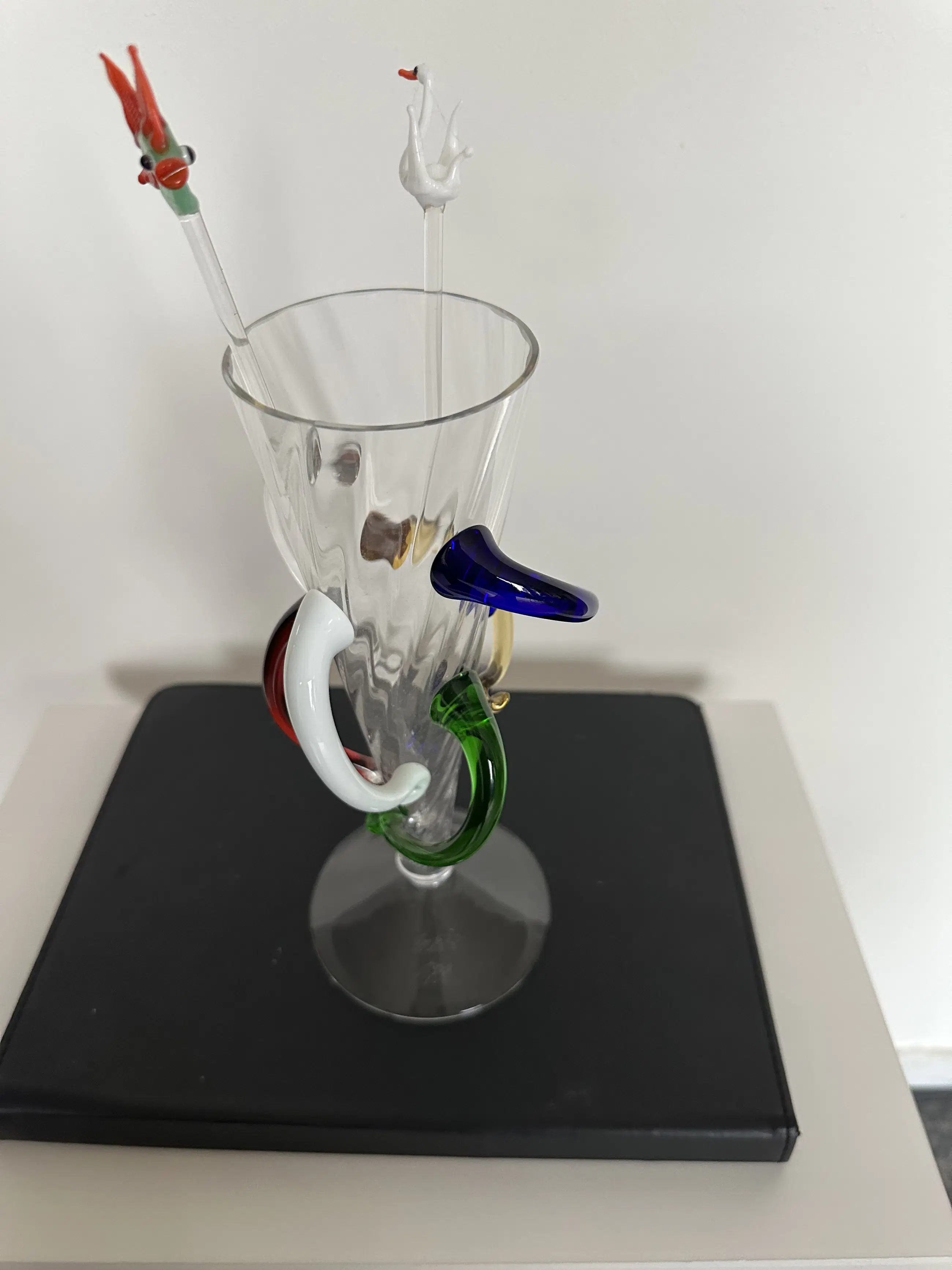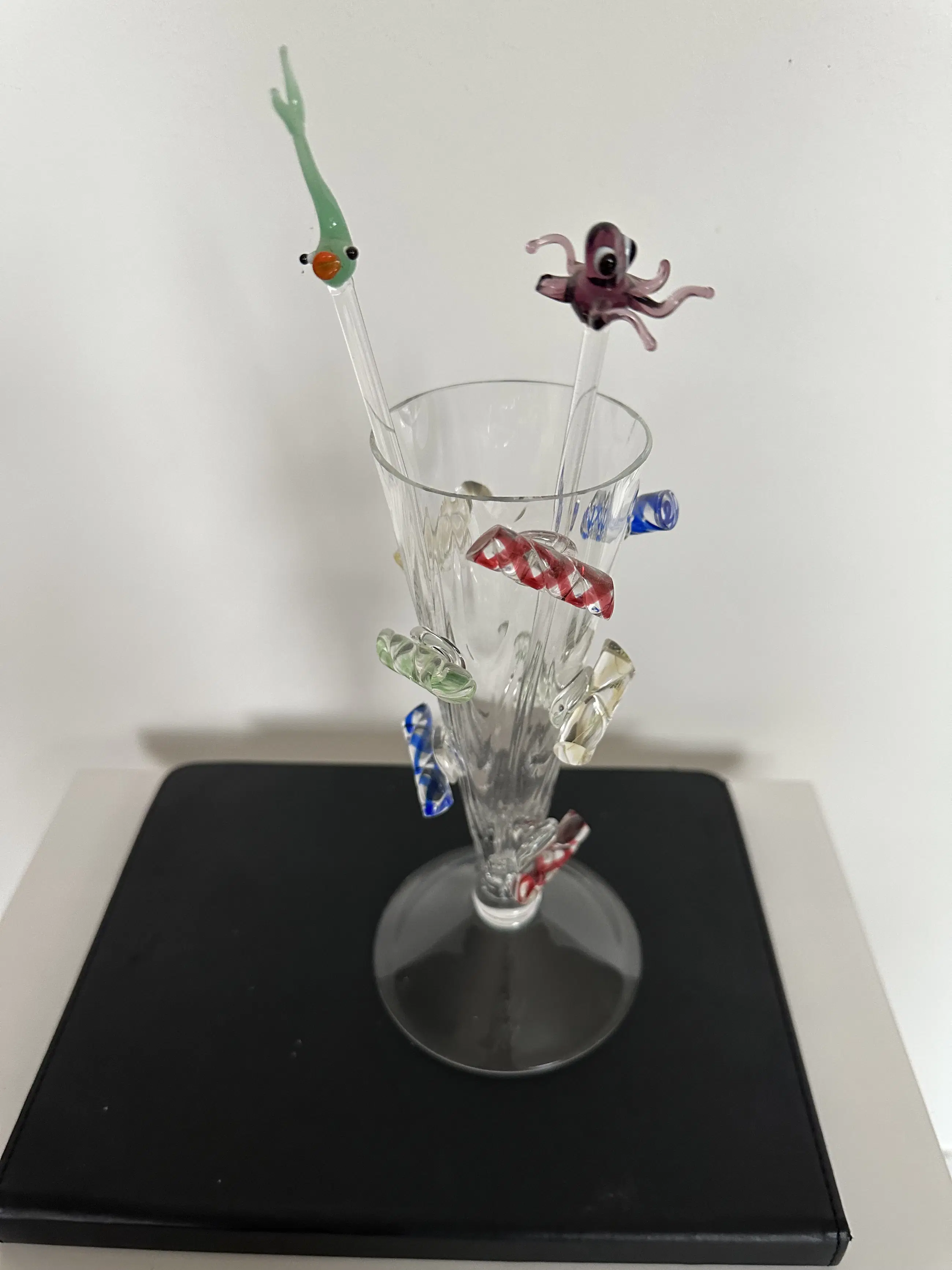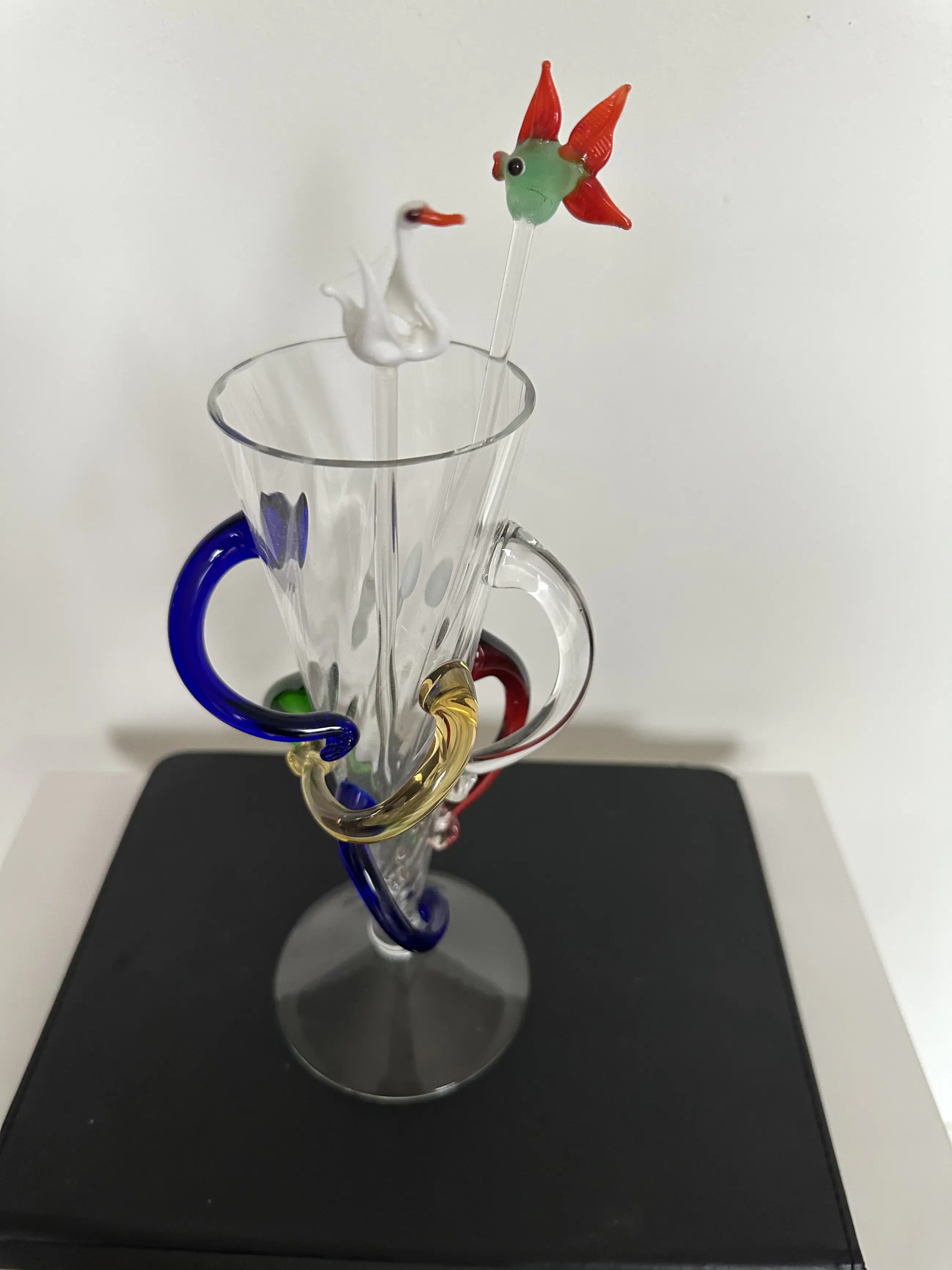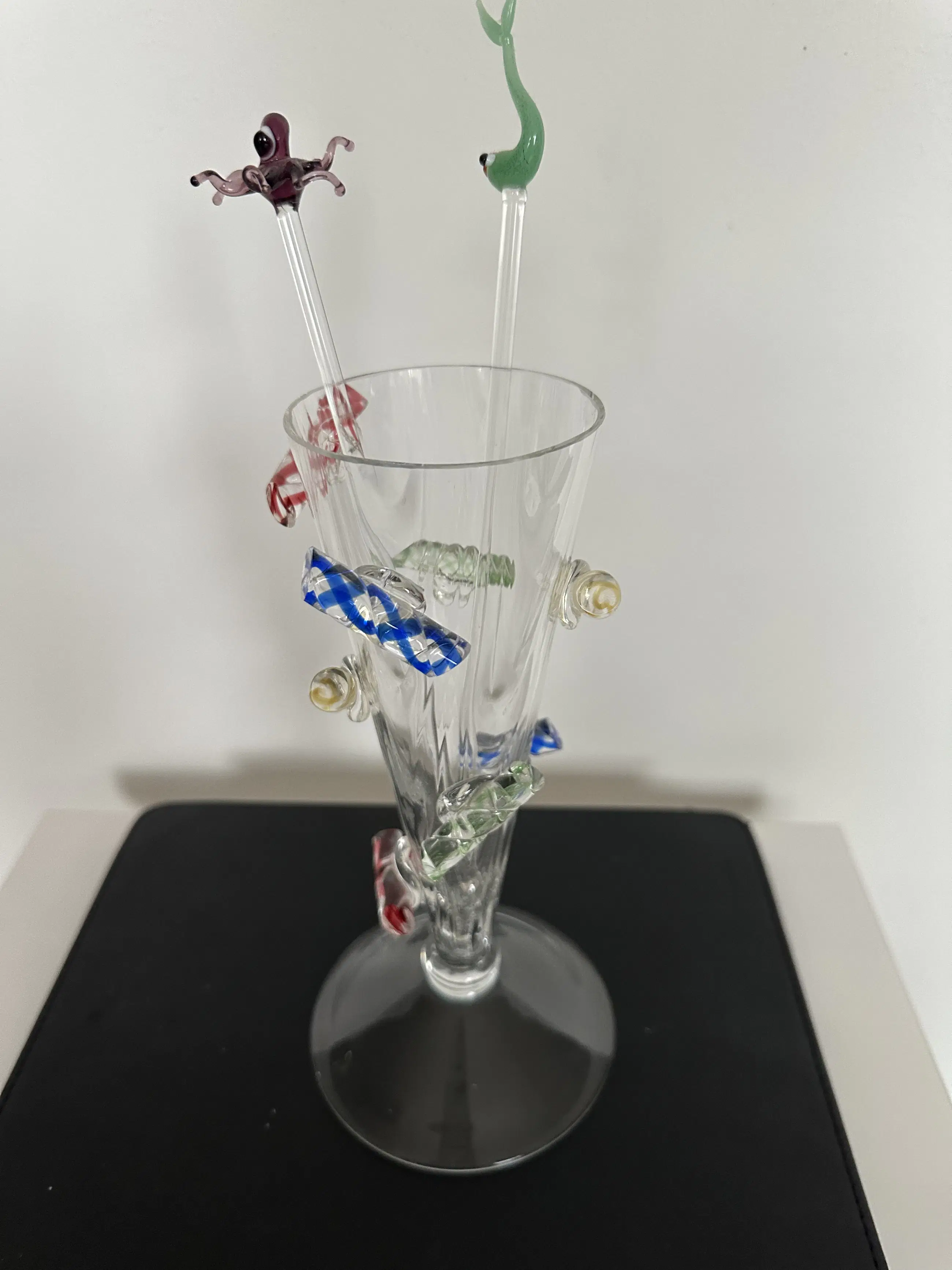 Ornamenten aan buitenzijde in rood, goud, blauw, groen In elk glas 2 glazen roerstokjes met bovenaan een diertje (Dolfijn, Octopus, Zwaan, Vis)