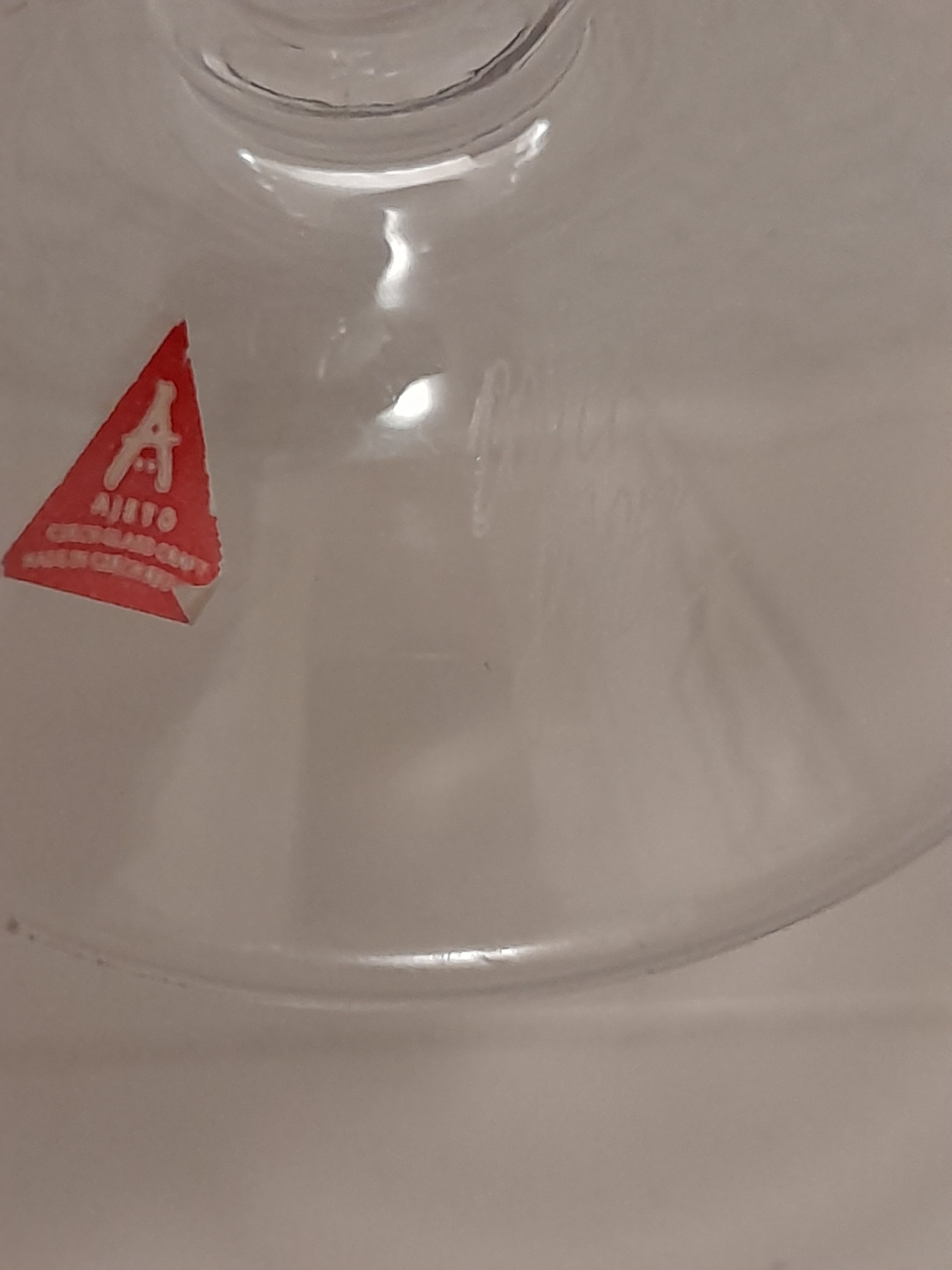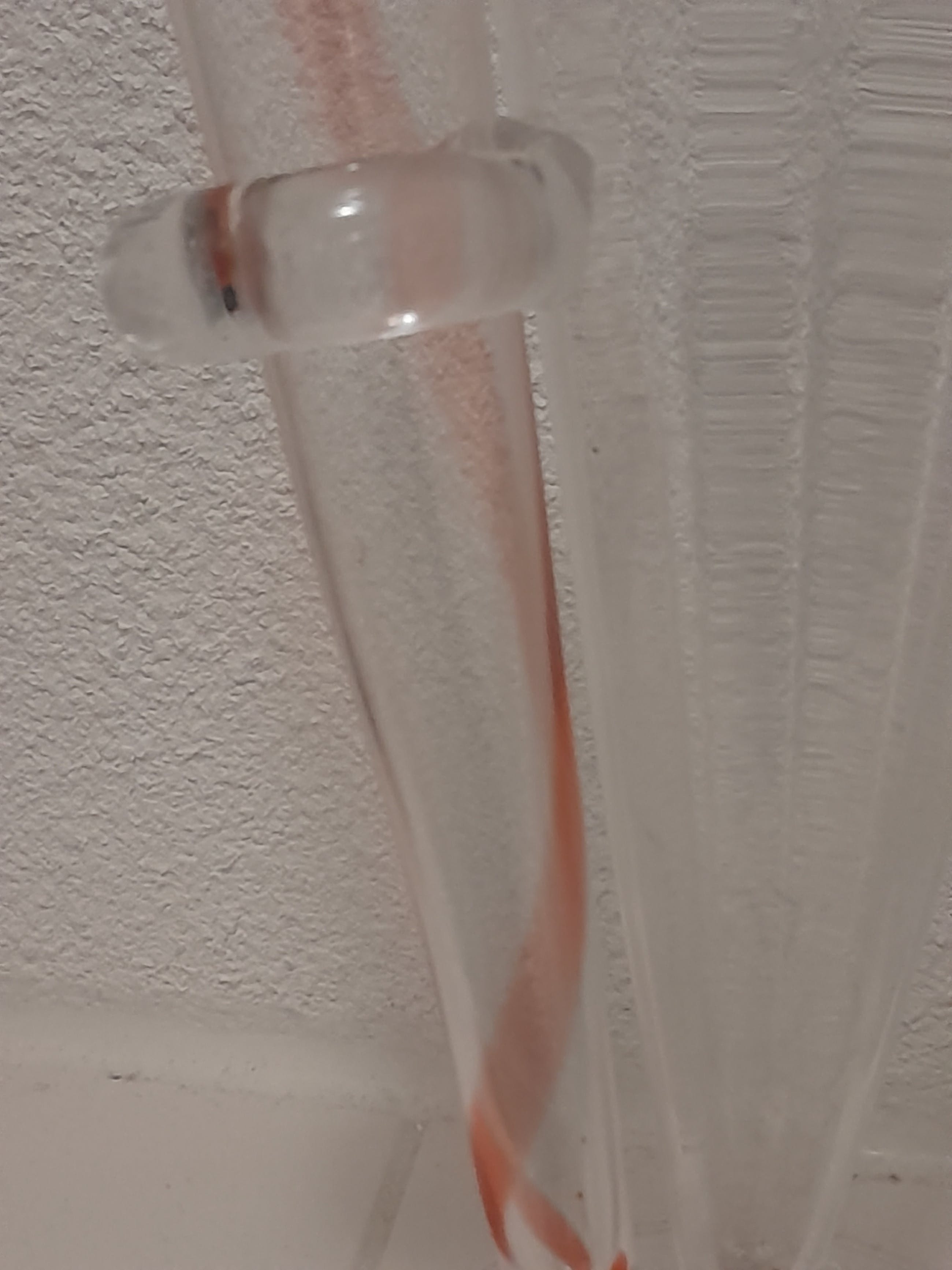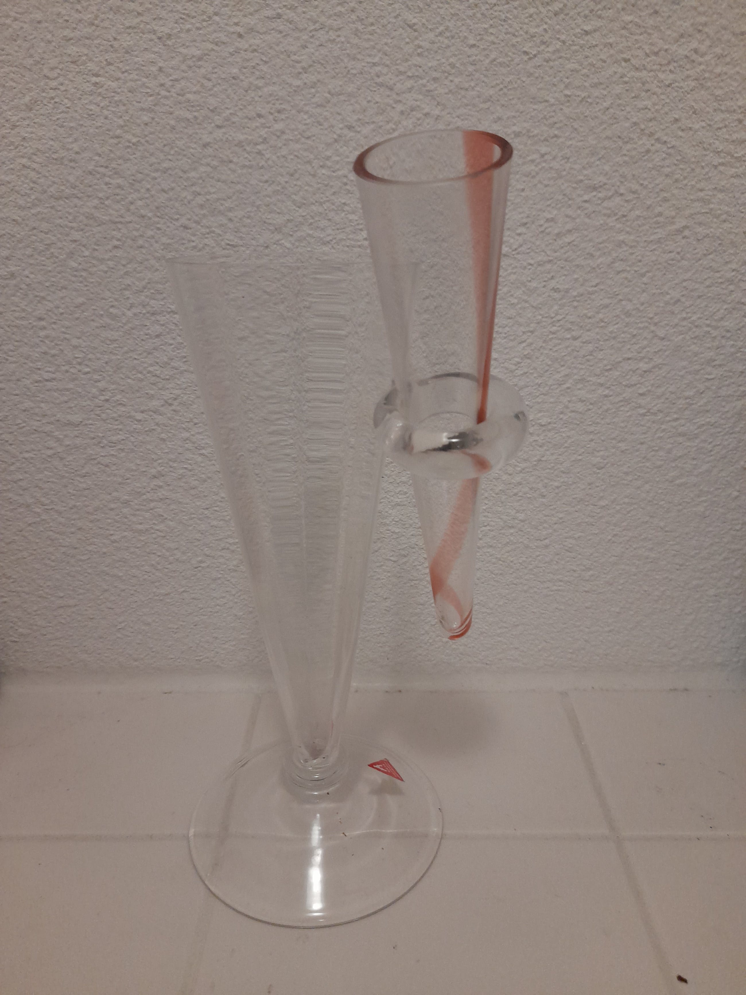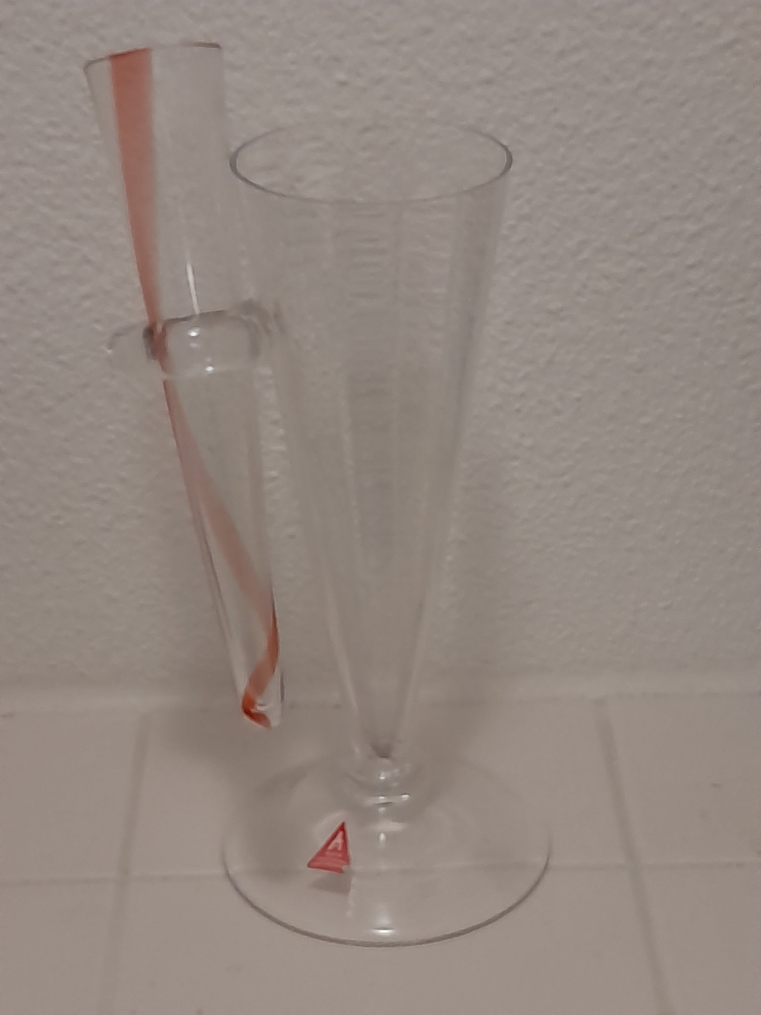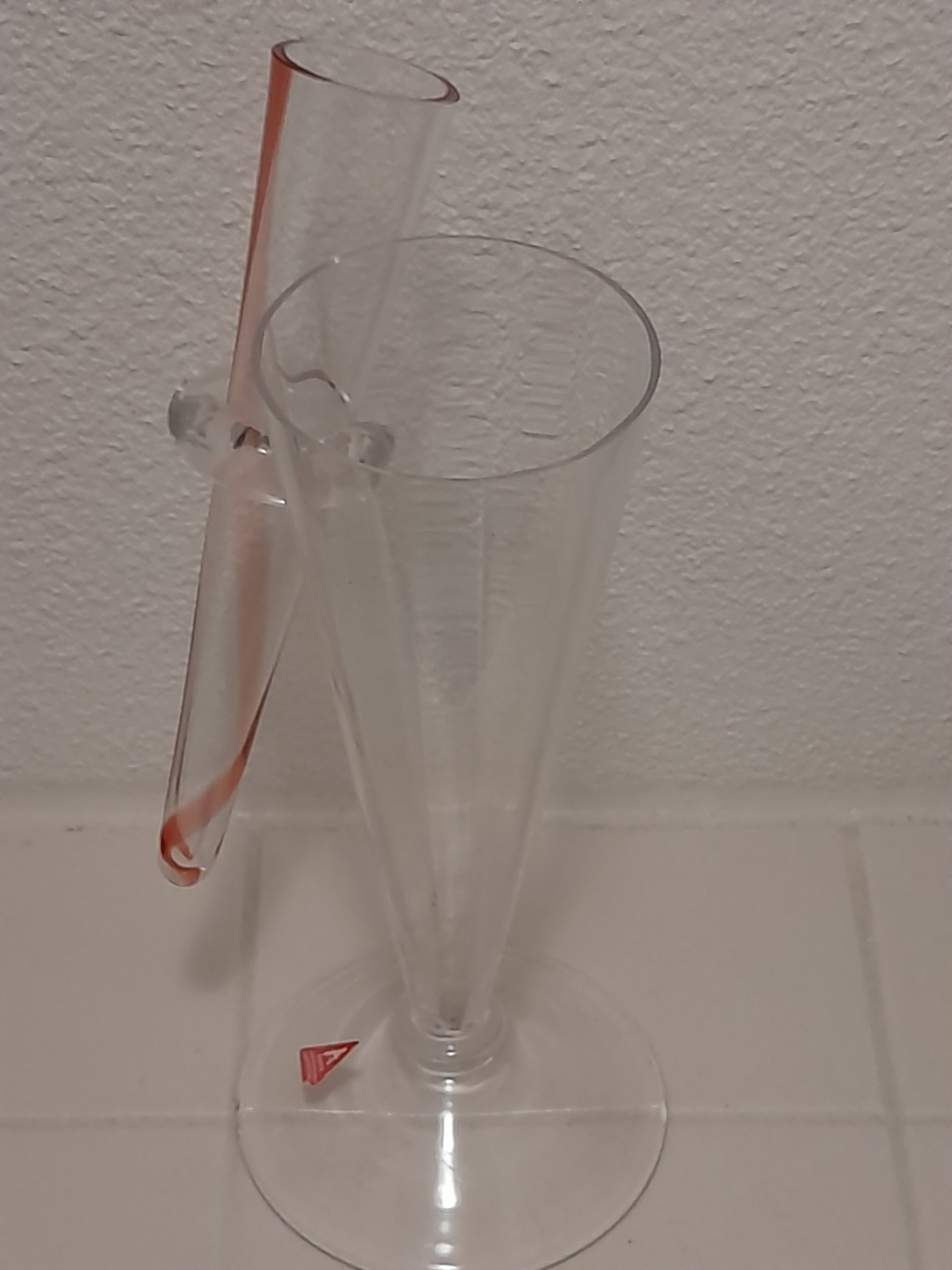 Het glas zelf is transparant met beetje roze in het bijbehorende glazenroerstaafje.