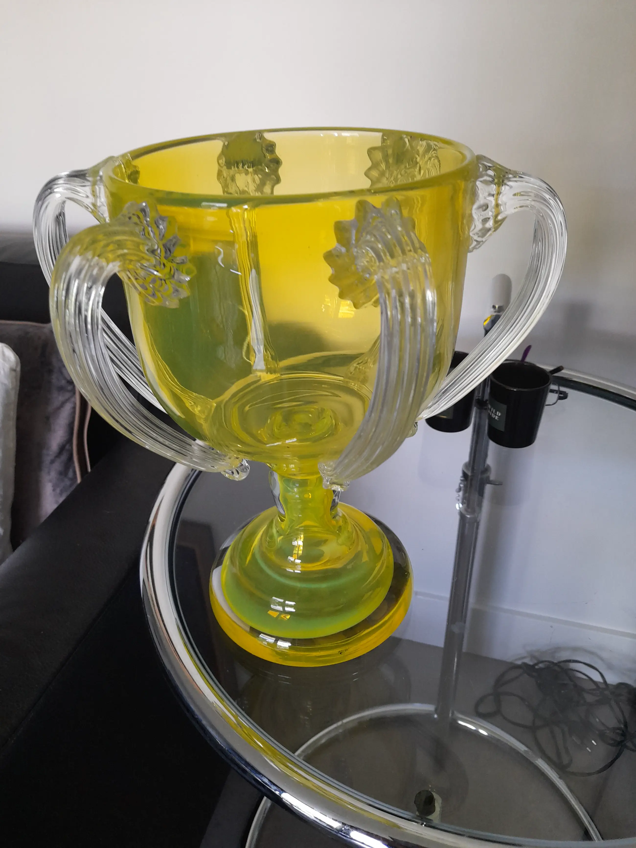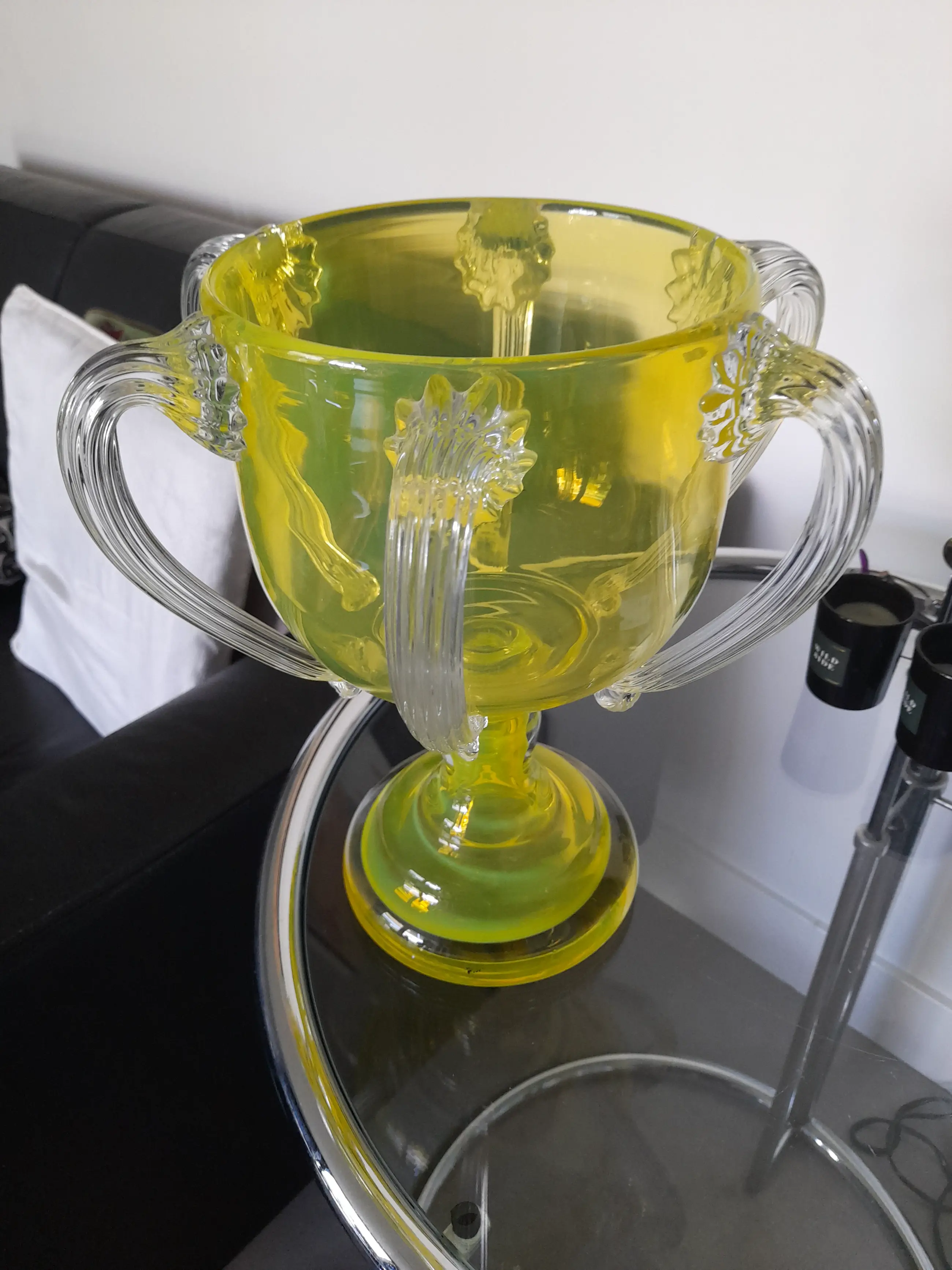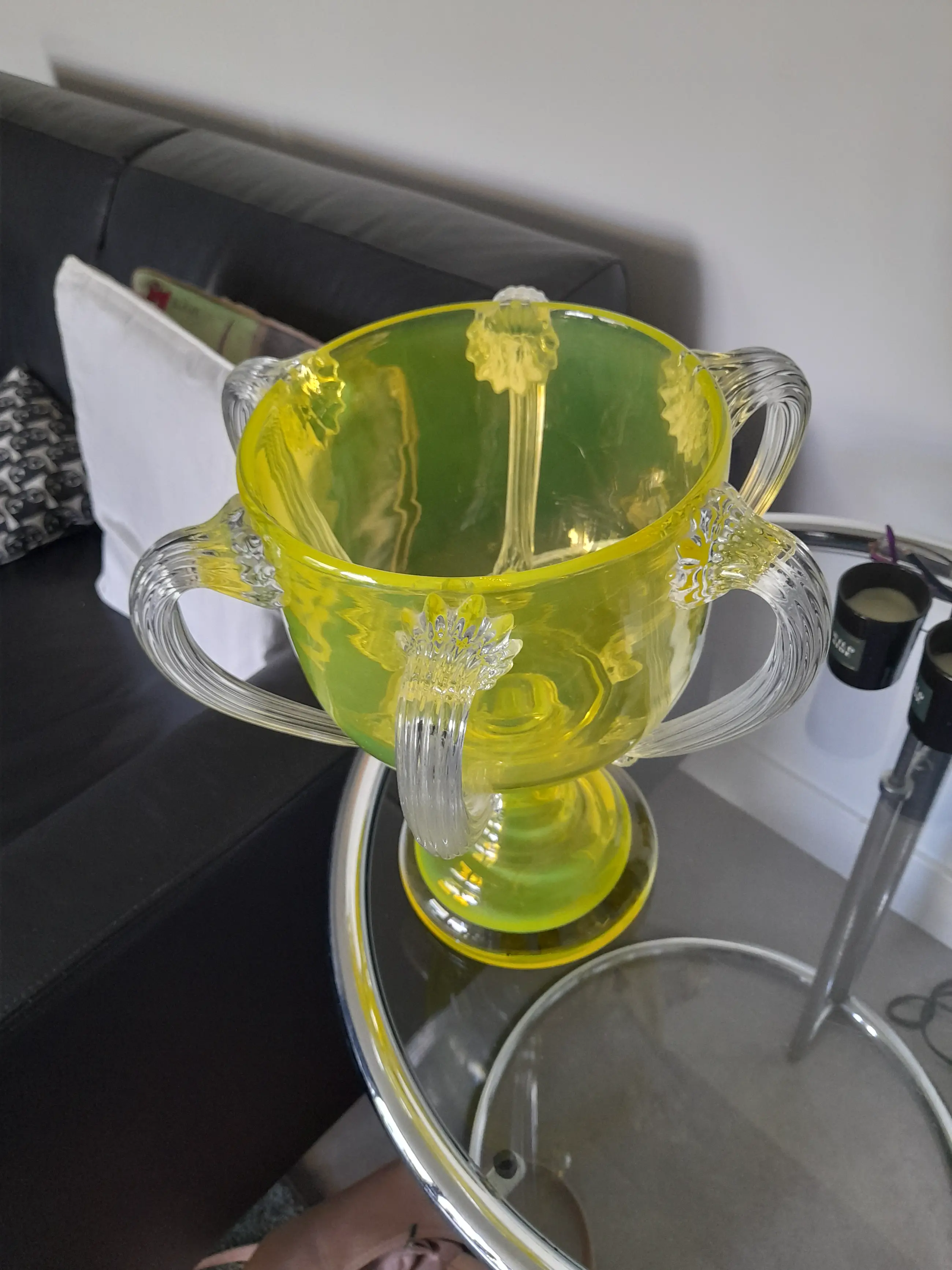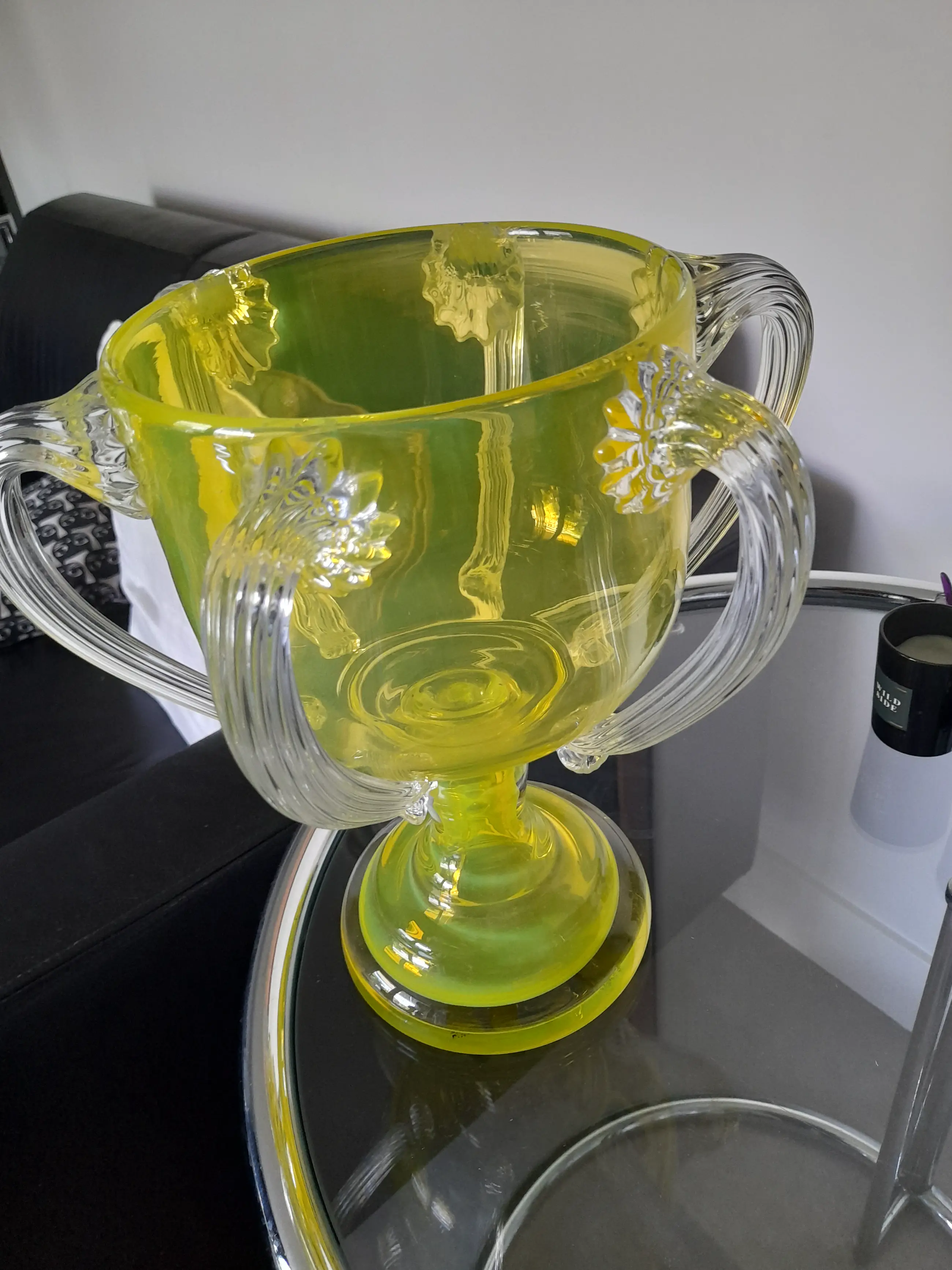 Deze vaas is gemaakt met echt uranium, dat is te zien aan de bijna lichtgevende kleur geel die deze bijzondere en zeer zeldzame design vaas heeft.